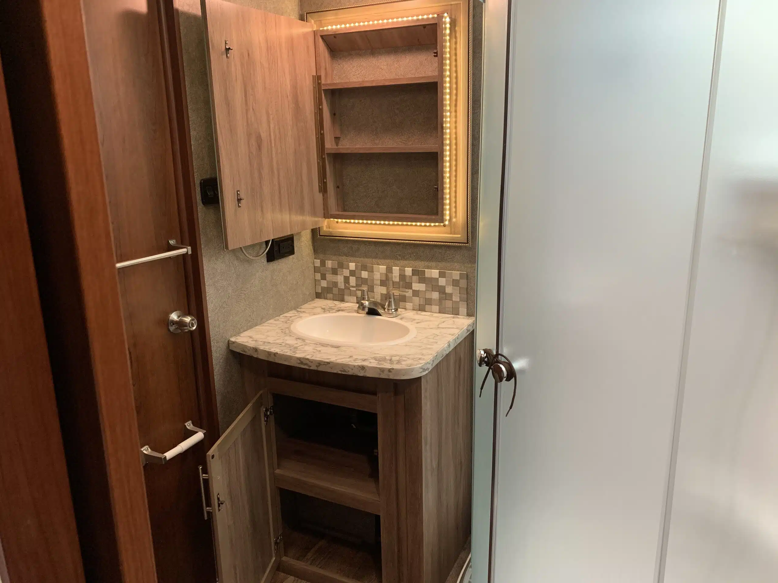 De plus, la Jayco 28.5R a un air climatisé de 15000 btu et un foyer qui tempéreront l’ambiance désirée. Par ailleurs, la cuisinière a un four et 3 brûleurs, un réfrigérateur gaz/électrique et un micro-ondes. De plus, il y a une table avec chaises, un sofa lit et une causeuse. Enfin, le système audio vous permettra d’écouter votre musique préférée.