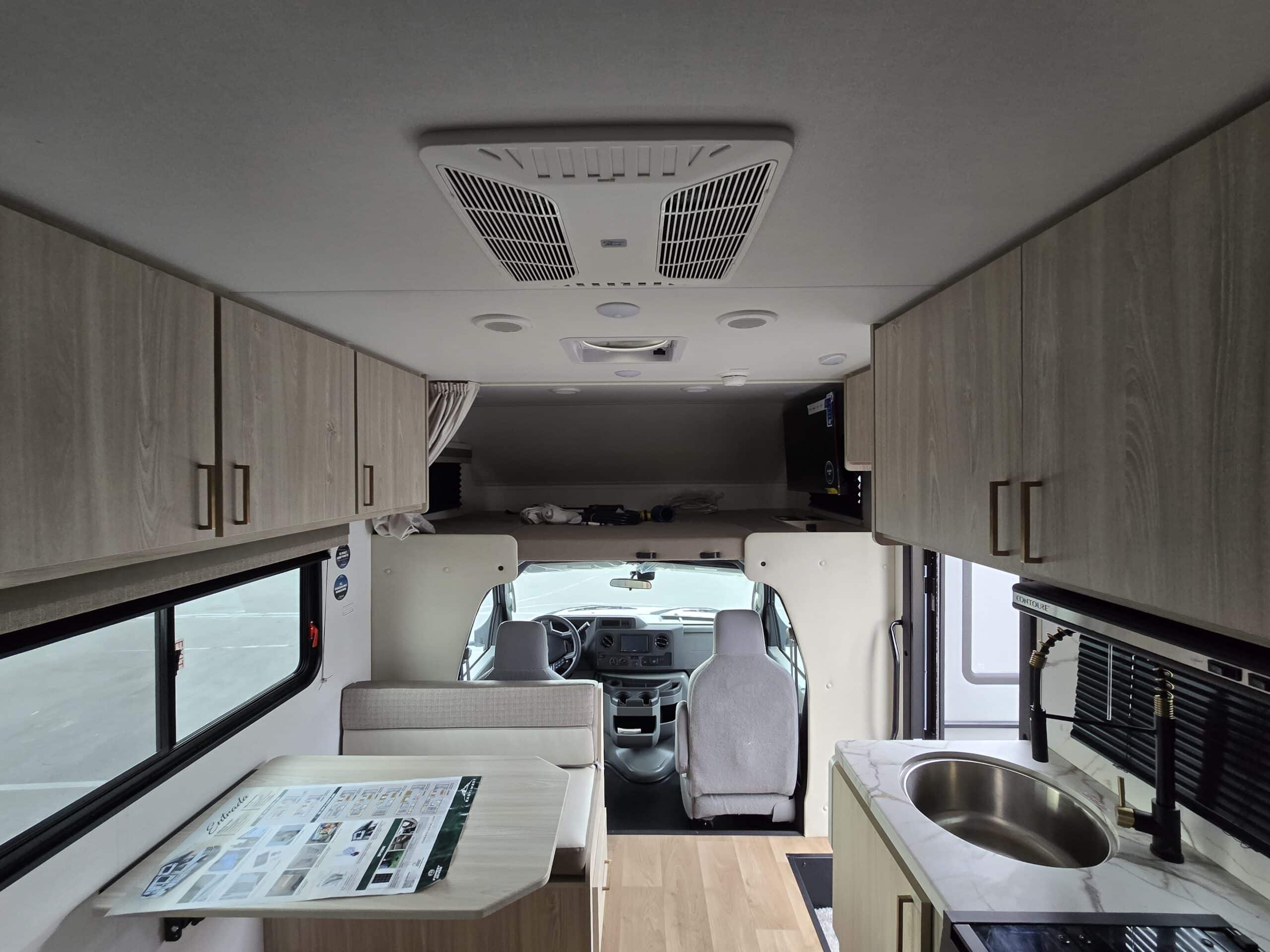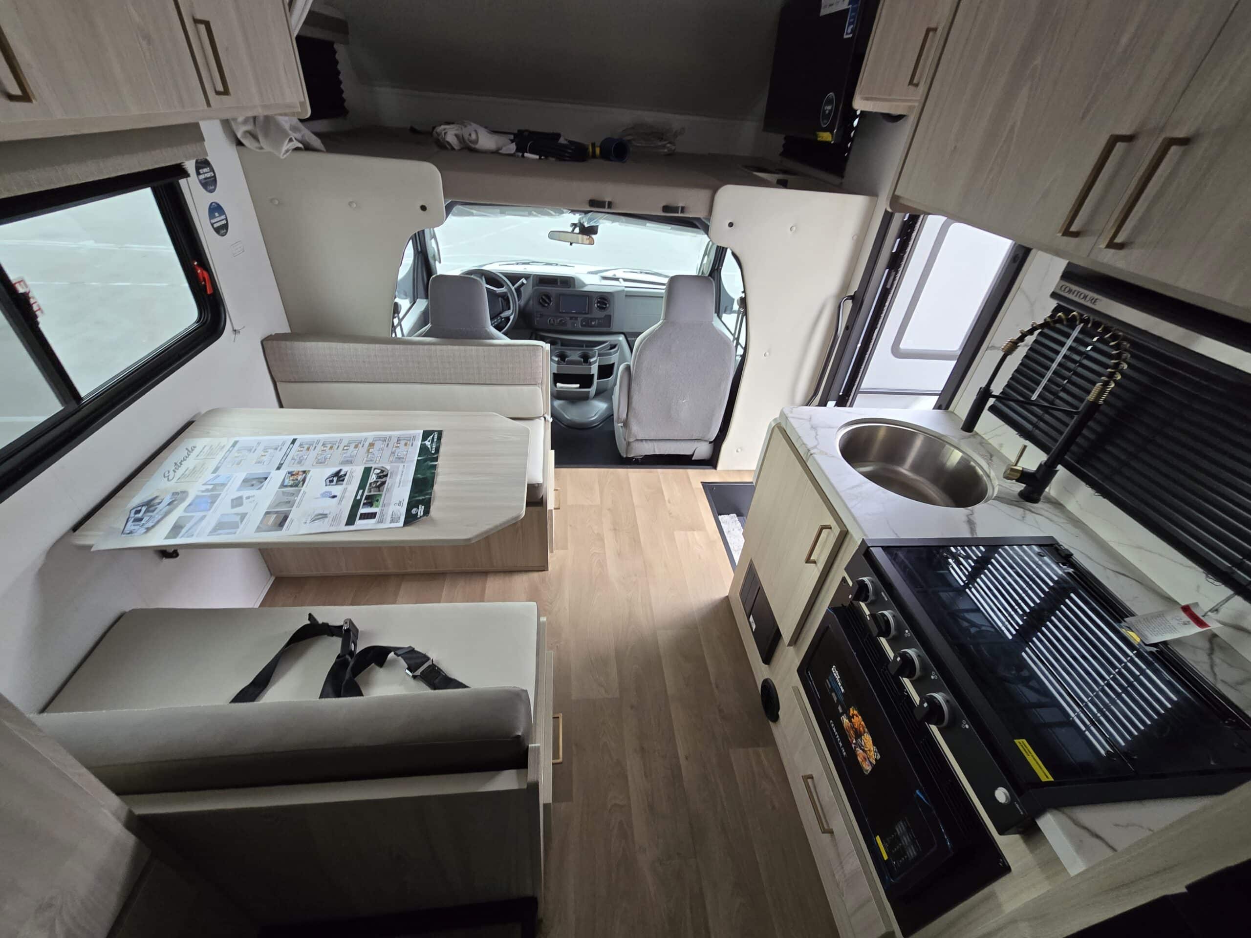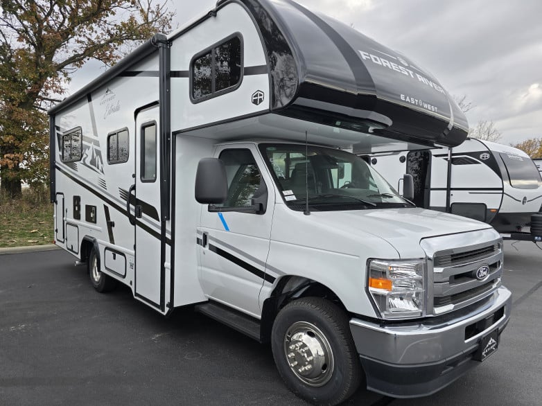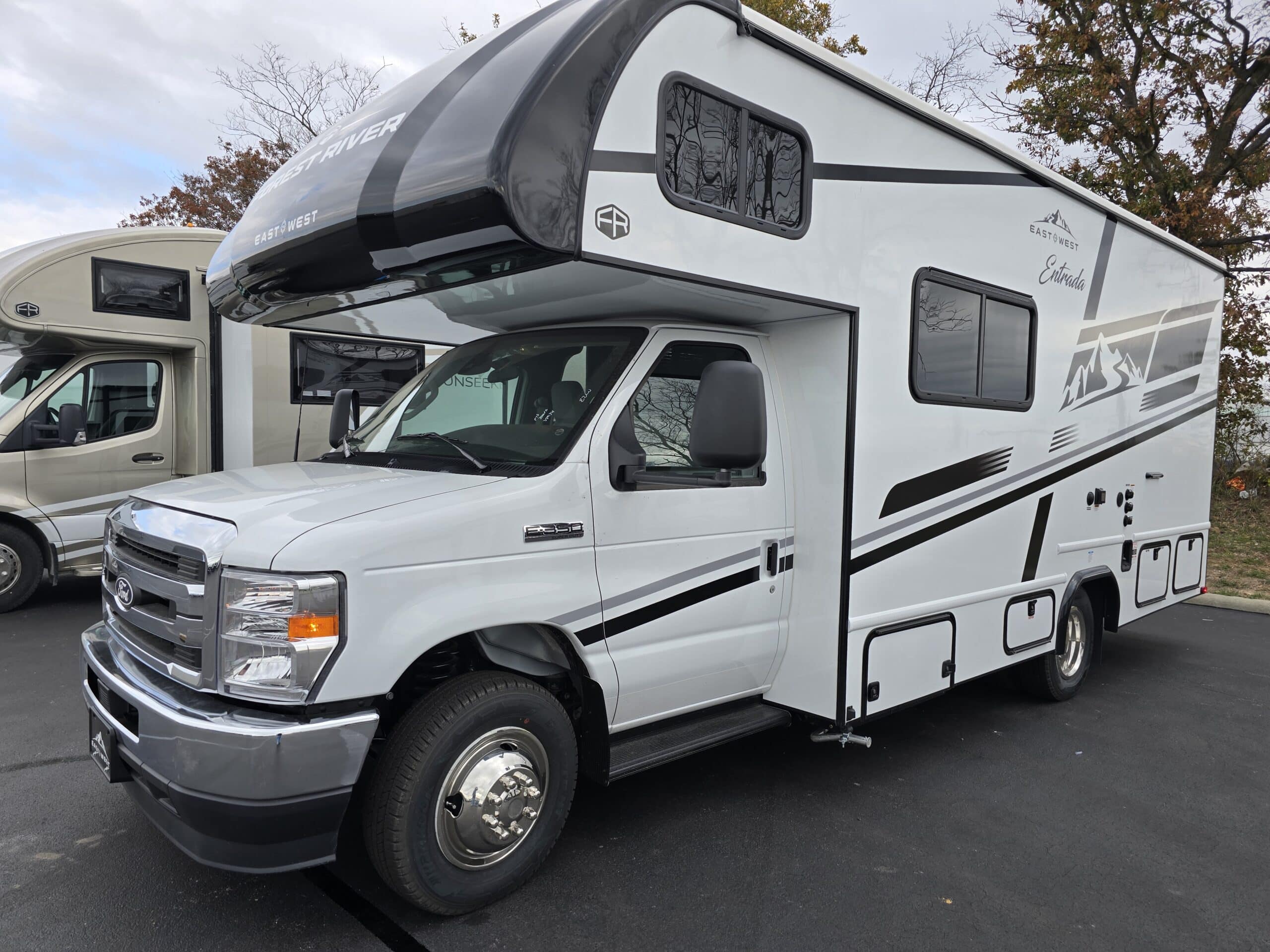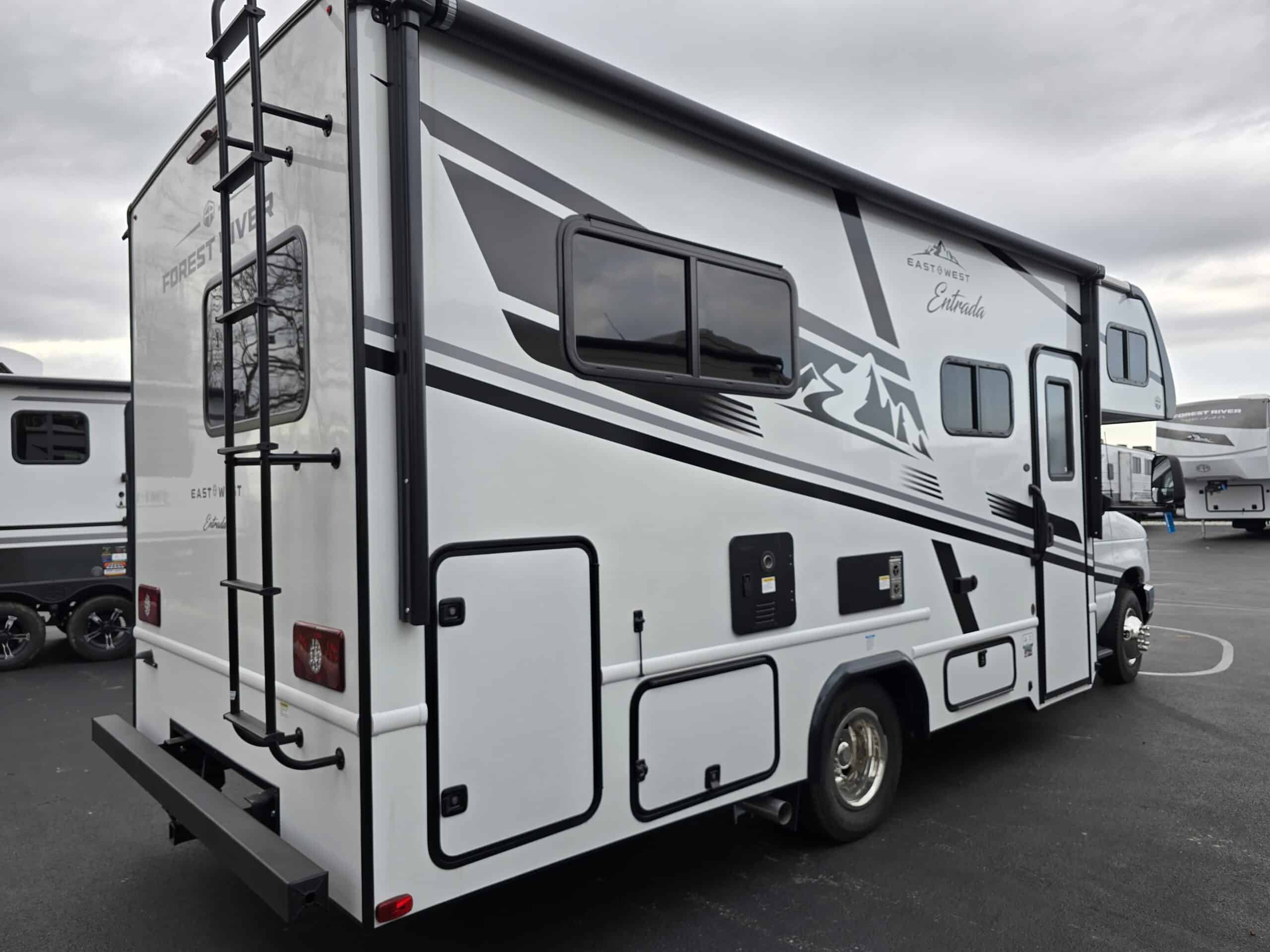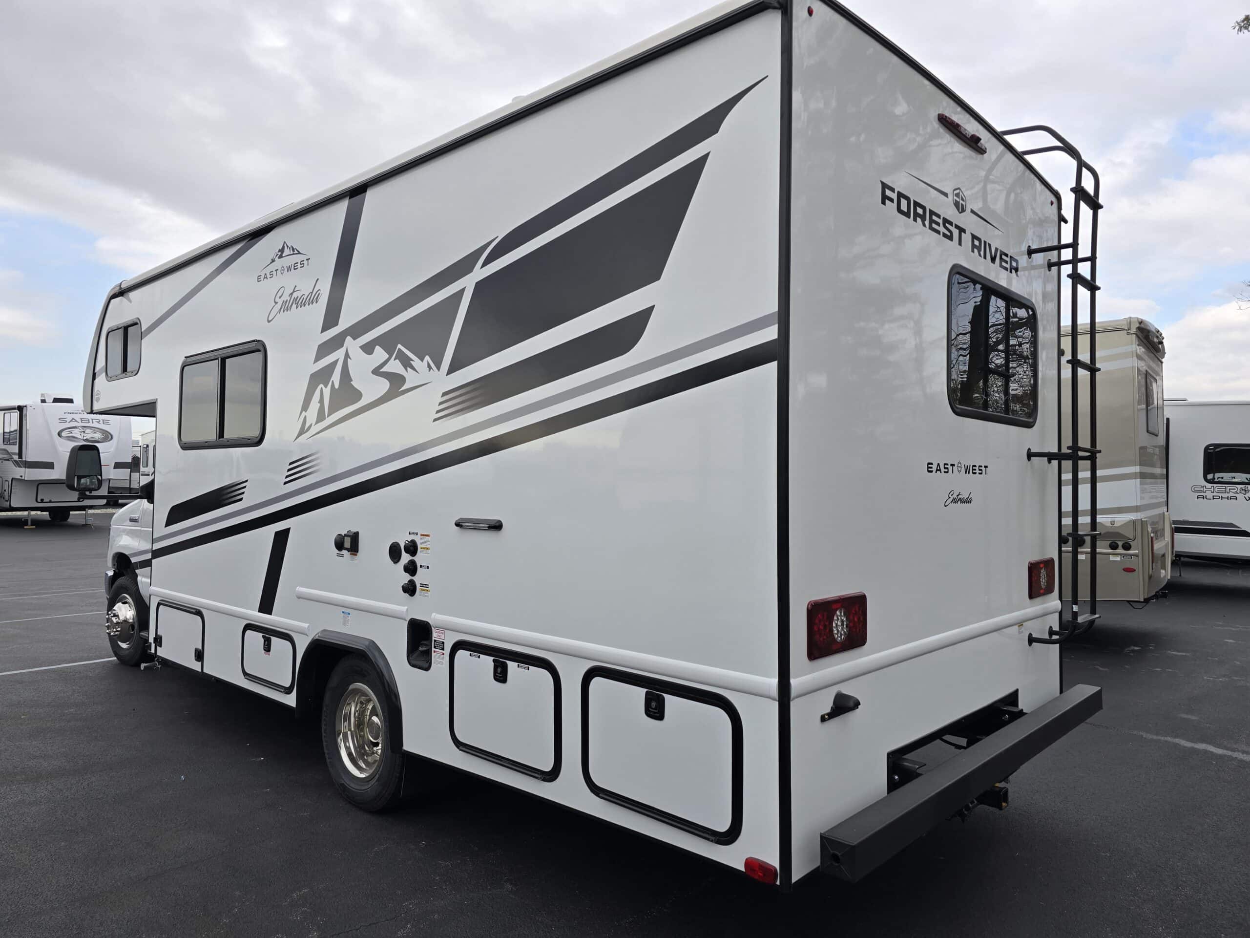 Le 2026 EST À OUEST Entrada 2000NS est une Camping-car à essence de classe C fabriqué par East to West (une marque de Forest River)La désignation « 2000NS » fait référence à un plan d’étage spécifique sans glissière (NS) conçu pour l’agilité et la facilité d’utilisation, mesurant environ 24′ 5″ de longueur. Caractéristiques et points forts clés Le modèle 2026 est construit sur un châssis Ford E-350 et dispose d’un intérieur spacieux avec une hauteur sous plafond de 2,13 mètres. Capacité de couchage : Peut accueillir jusqu’à 6 personnes grâce à un lit queen-size à l’arrière et une couchette de 60″ x 80″ au-dessus de la cabine. Cuisine : Équipée d’un réfrigérateur 10,7 pi³ 12 V, d’un four à micro-ondes à convection avec technologie de friteuse à air et d’un comptoir rabattable. Durabilité : Construit avec des parois latérales en composite Azdel de 2 pouces, une membrane de toit en TPO et un capot avant monobloc en fibre de verre peinte. Confort : Comprend un générateur de 4 500 watts, un chauffe-eau sans réservoir et une télévision intelligente 12 V.