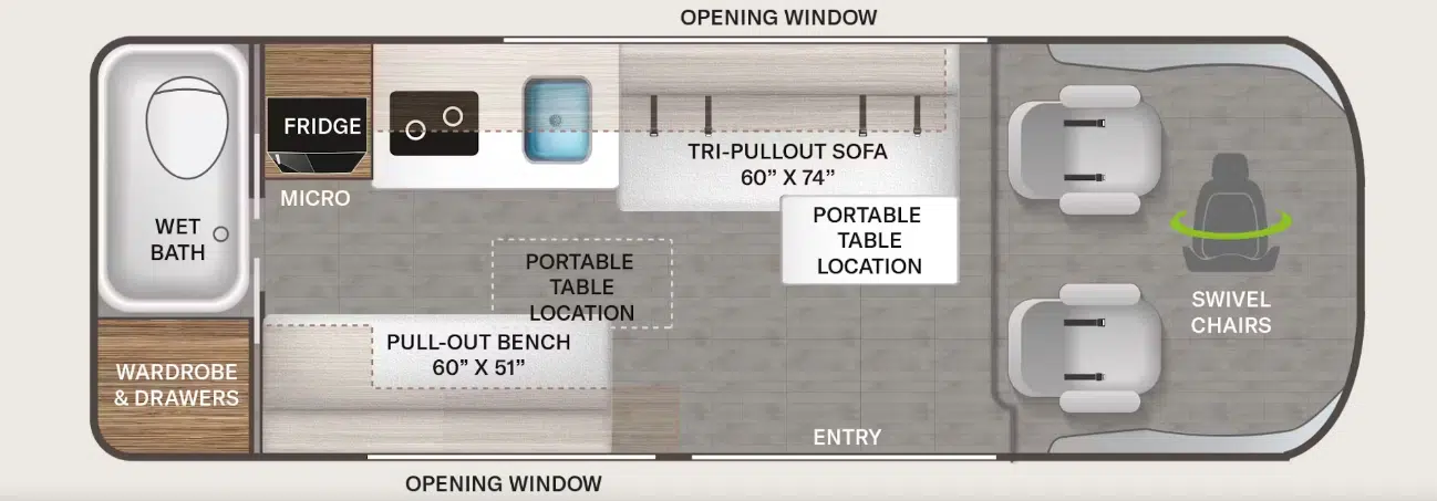 De plus, le Twist 2HB a un air climatisé de 11000 btu. tempérera l’ambiance désirée. Aussi, la cuisine a 2 brûleurs, un micro-ondes et un réfrigérateur 12 volts. Enfin, une radio, vous permettront de relaxer.