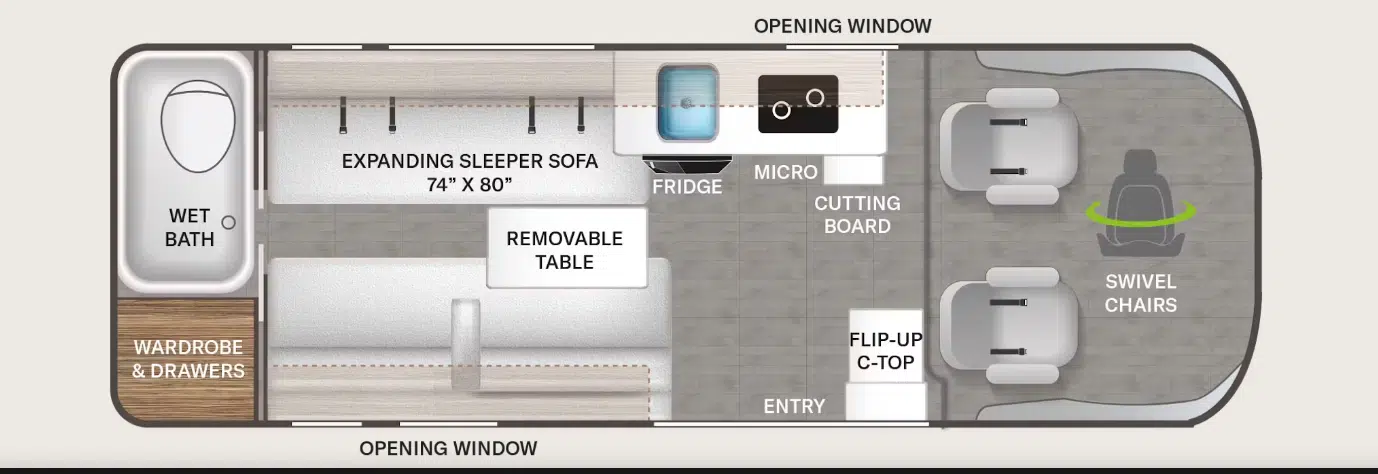 De plus, le Twist 2LB a un air climatisé de 11000 btu. tempérera l’ambiance désirée. Aussi, la cuisine a 2 brûleurs, un micro-ondes et un réfrigérateur 12 volts. Enfin, une radio, vous permettront de relaxer.