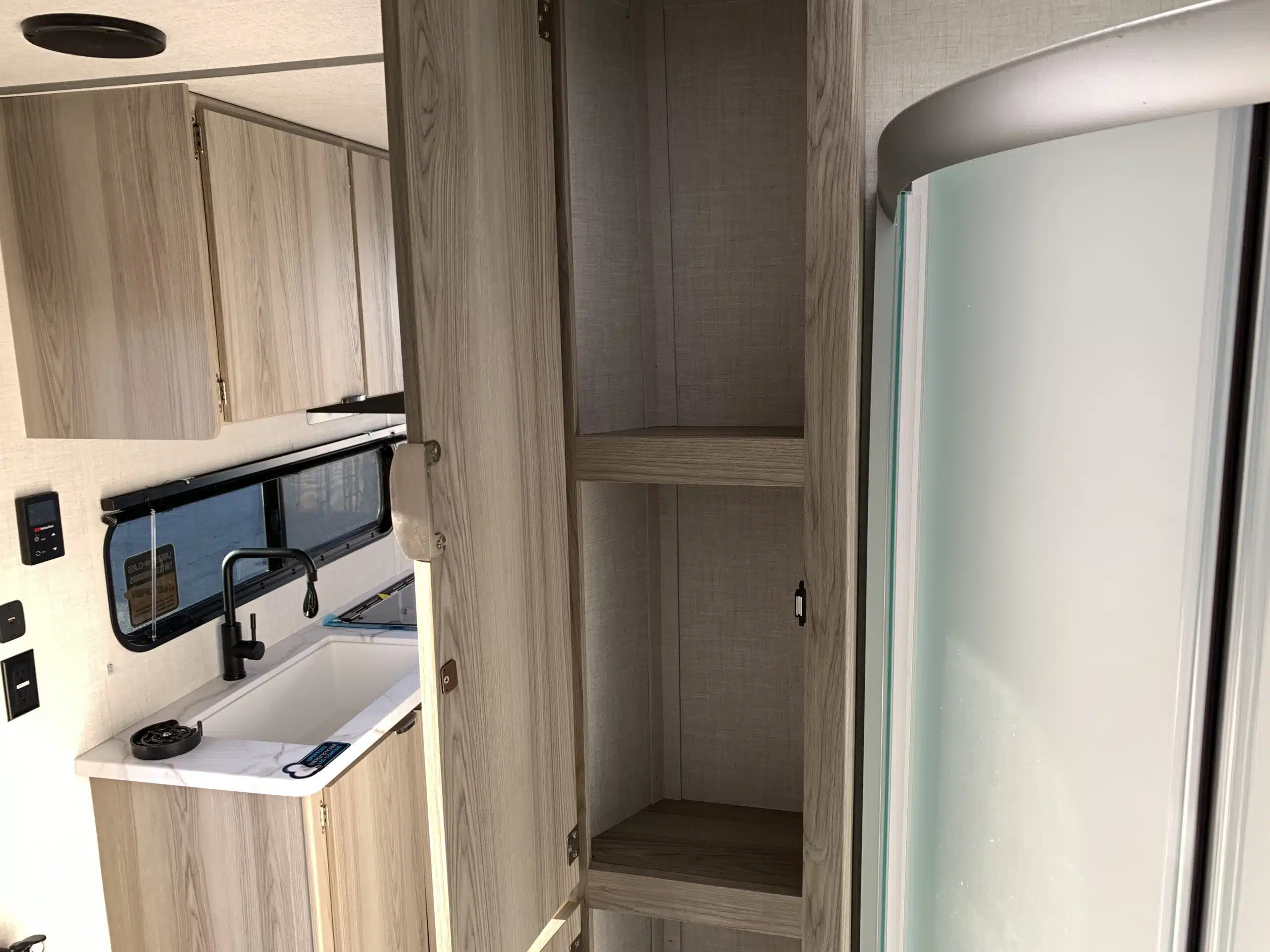 D’abord cette roulotte a un garage ouvert. Grâce à son auvent de 15 pieds et sa douche vous profiterez de l’extérieur sans soucis. Puisque ses marches sont ajustables et très stables vous aurez un accès facile à l’intérieur.