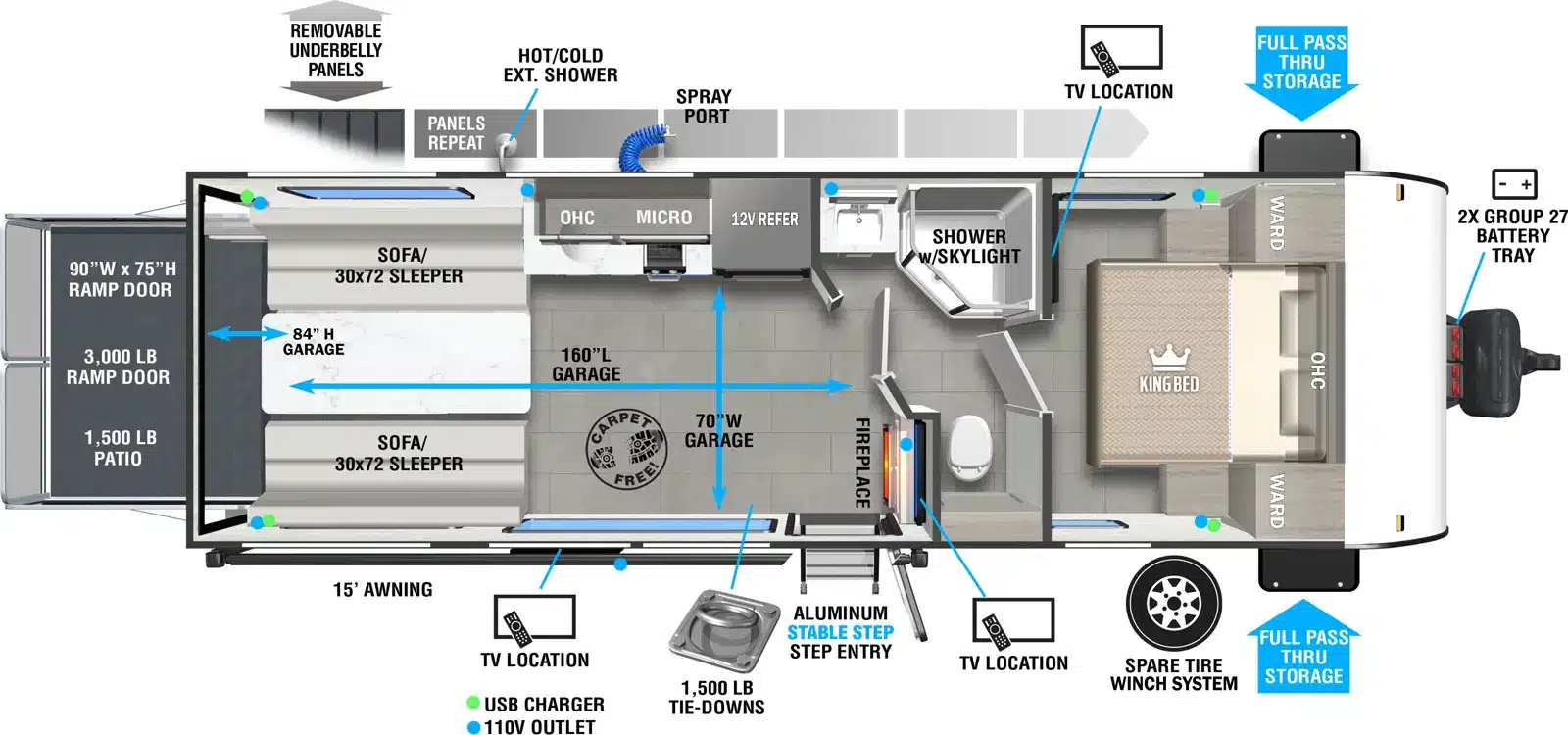 D’abord cette roulotte a un garage ouvert. Grâce à son auvent de 15 pieds et sa douche vous profiterez de l’extérieur sans soucis. Puisque ses marches sont ajustables et très stables vous aurez un accès facile à l’intérieur.