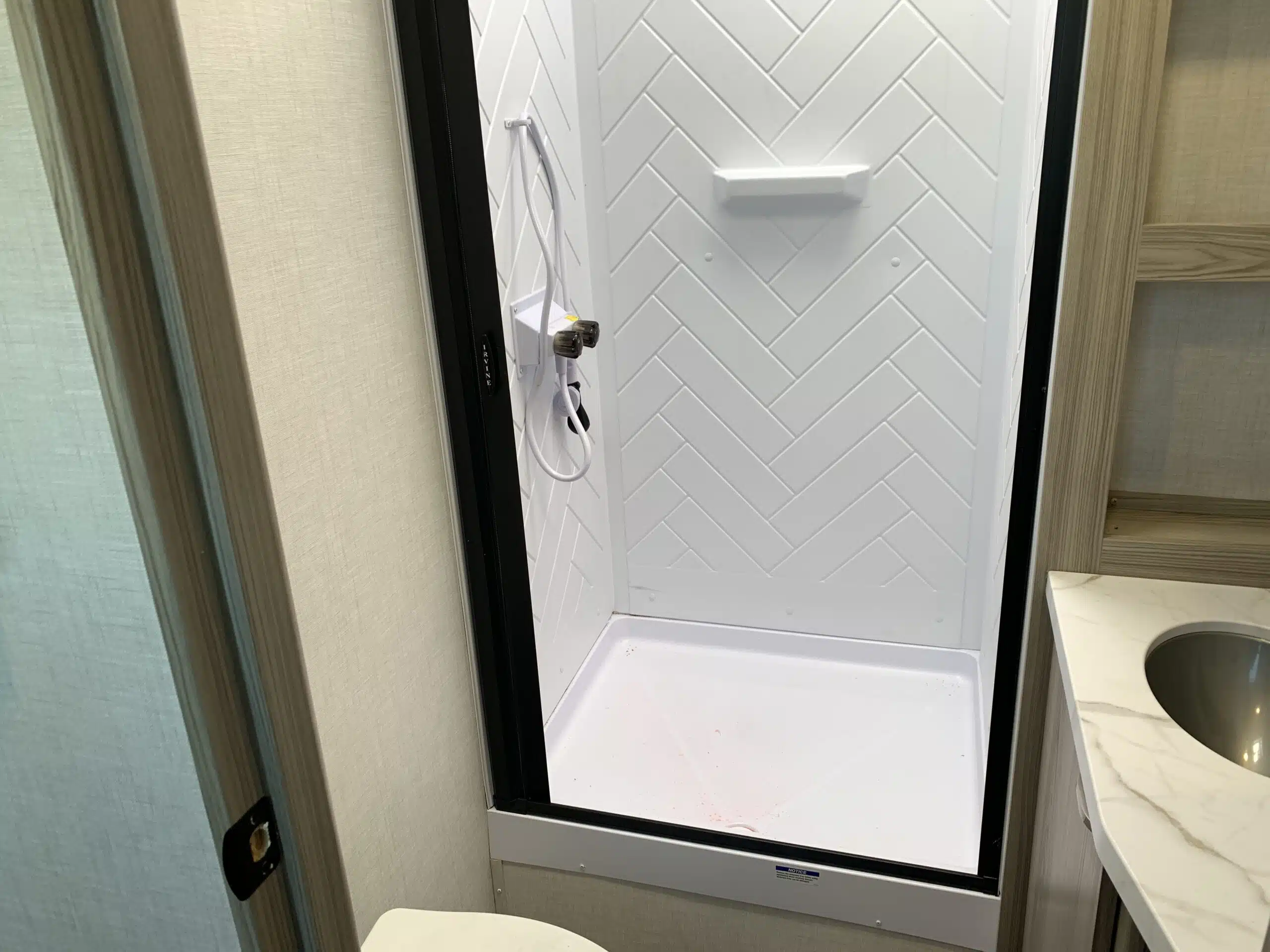 D’abord cette roulotte a un garage ouvert. Grâce à son auvent de 18 pieds et sa douche vous profiterez de l’extérieur sans soucis. Puisque ses marches sont ajustables et très stables vous aurez un accès facile à l’intérieur.