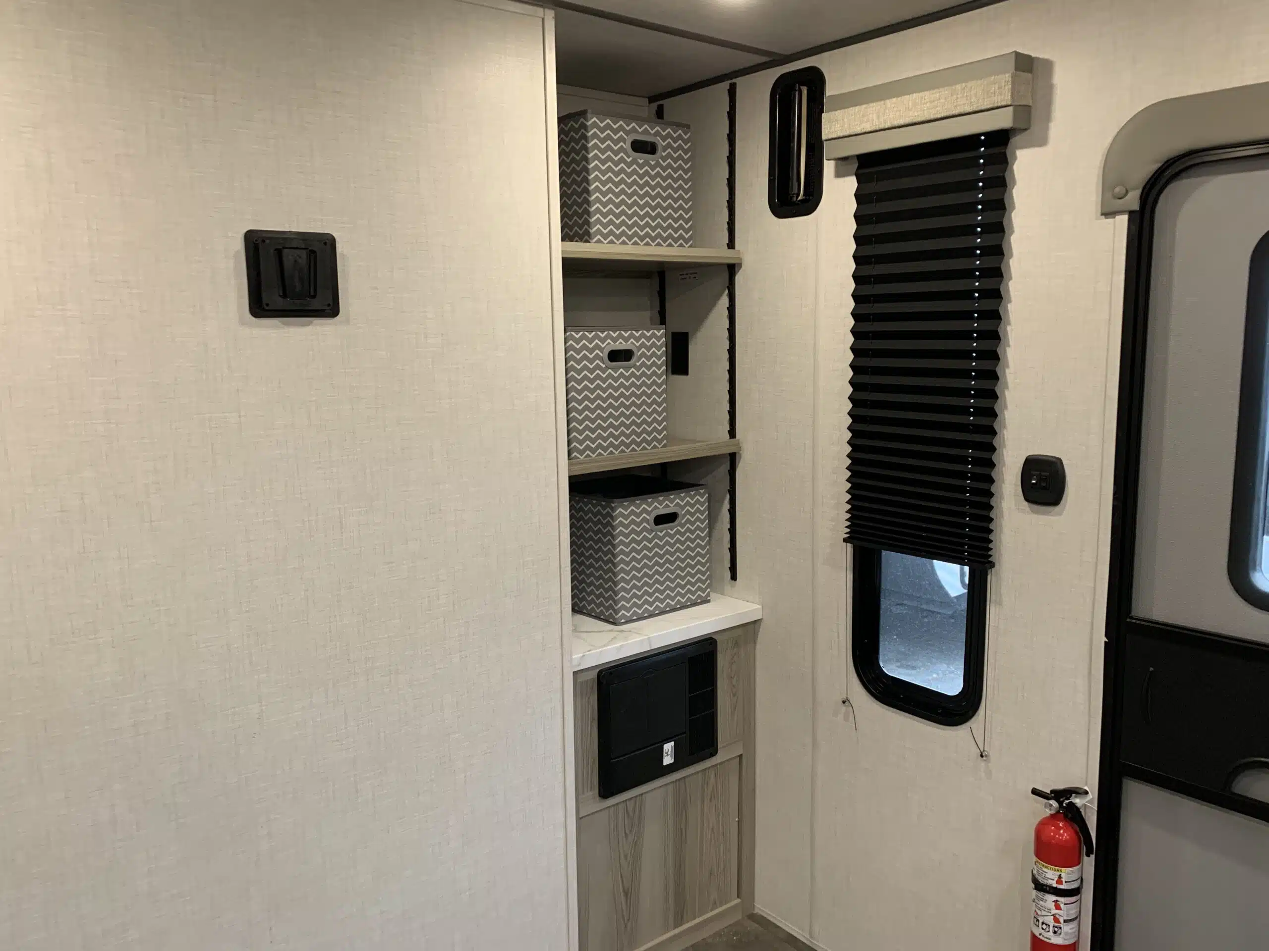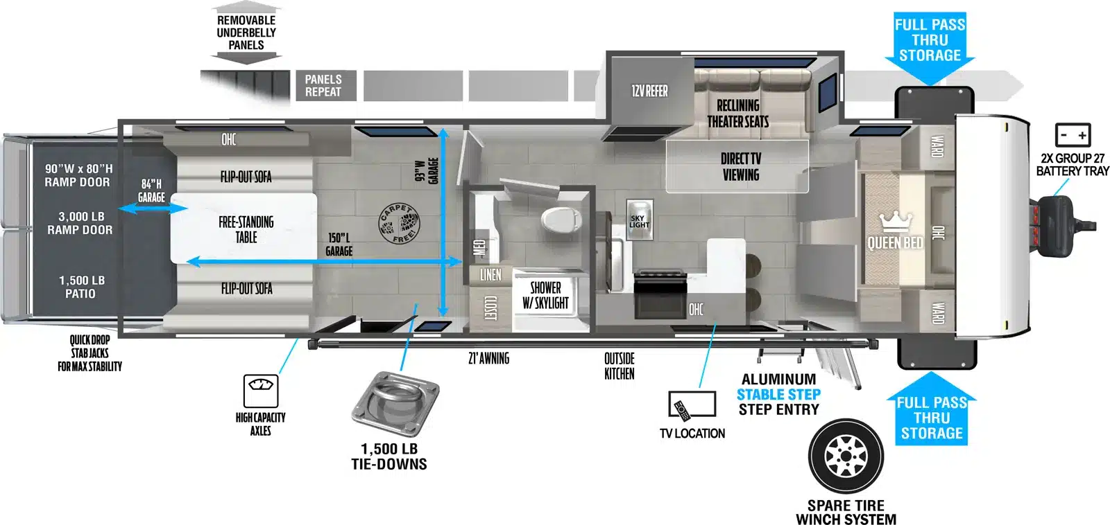 D’abord cette roulotte a un garage fermé. Grâce à son auvent de 21 pieds, sa douche et sa cuisine vous profiterez de l’extérieur sans soucis. Puisque ses marches sont ajustables et très stables vous aurez un accès facile à l’intérieur.