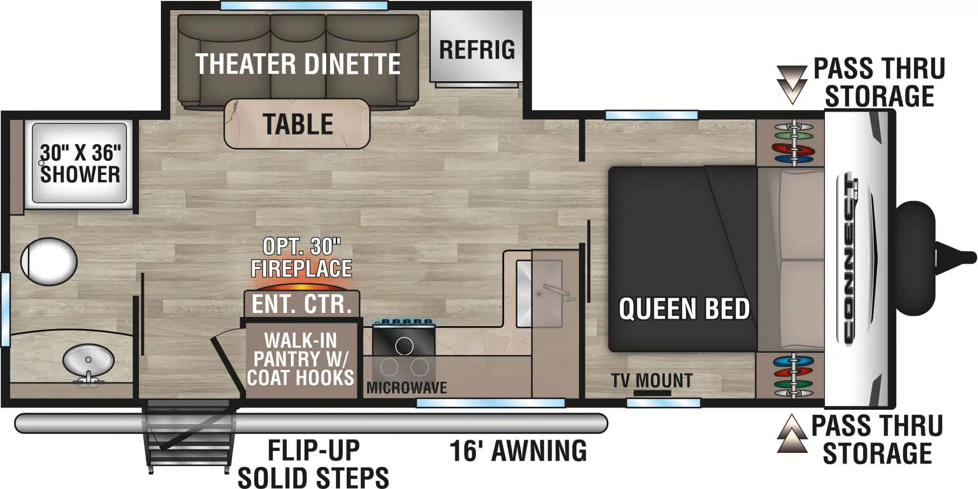 De plus, la Connect 221RBSE a un air climatisé de 13500 btu et un foyer (en option) qui tempéreront l’ambiance désirée. Par ailleurs, la cuisinière a un four et 3 brûleurs, un réfrigérateur, un micro-ondes et un garde-manger. De plus, un sofa 3 places et une table pliante. Enfin, le système audio vous permettra d’écouter votre musique préférée.