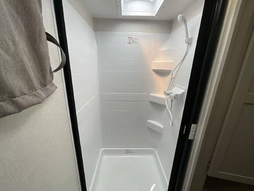 D’abord, cette roulotte a un auvent de 20 pieds, une cuisine et une douche pour profiter de l’extérieur sans soucis. Puisque ses marches sont ajustables et très stables vous aurez un accès facile à l’intérieur. Les coffres ont un bel espace de rangement. Elle est munie d’une échelle pour l’accès au toit.