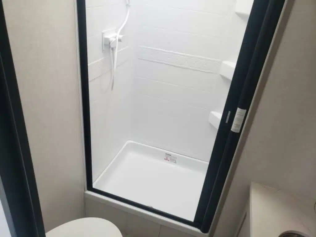 D’abord, cette roulotte a un auvent de 19 pieds et une douche pour profiter de l’extérieur sans soucis. Puisque ses marches sont ajustables et très stables vous aurez un accès facile à l’intérieur. Les coffres ont un bel espace de rangement. Elle est munie d’une échelle pour l’accès au toit.