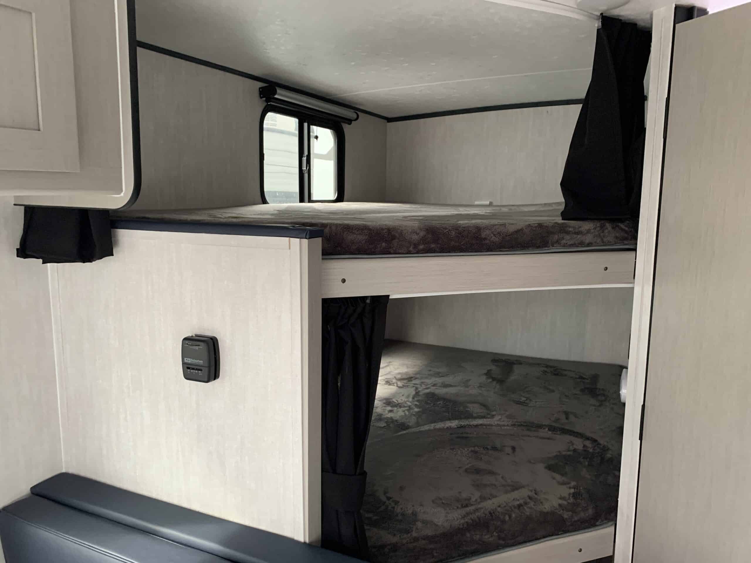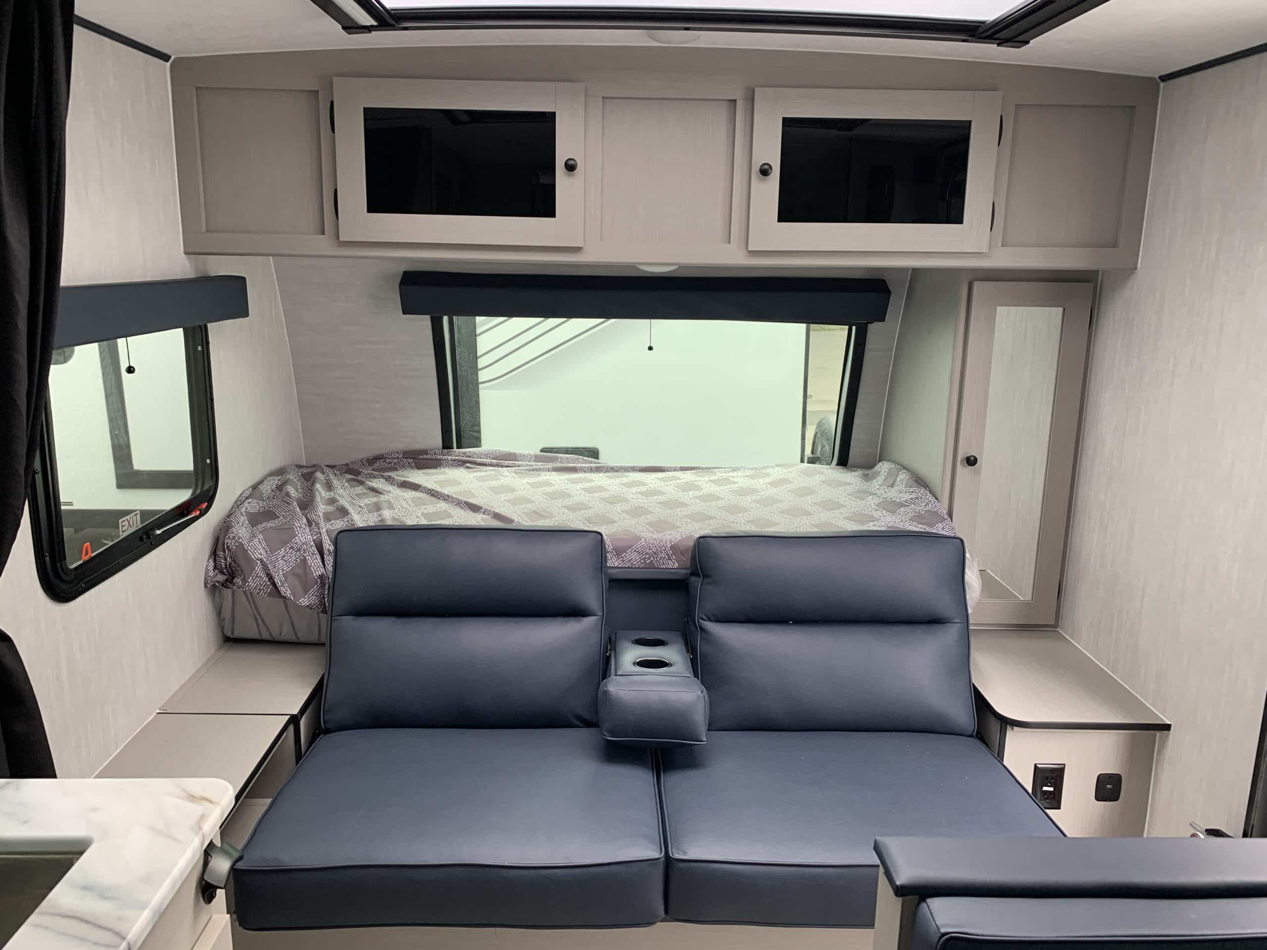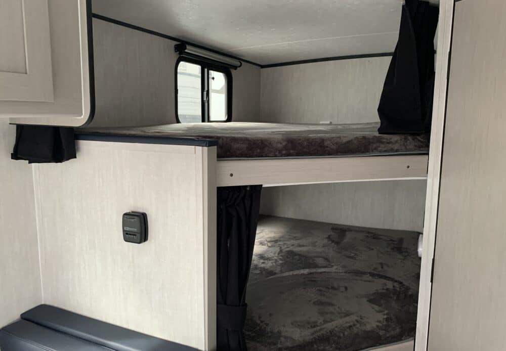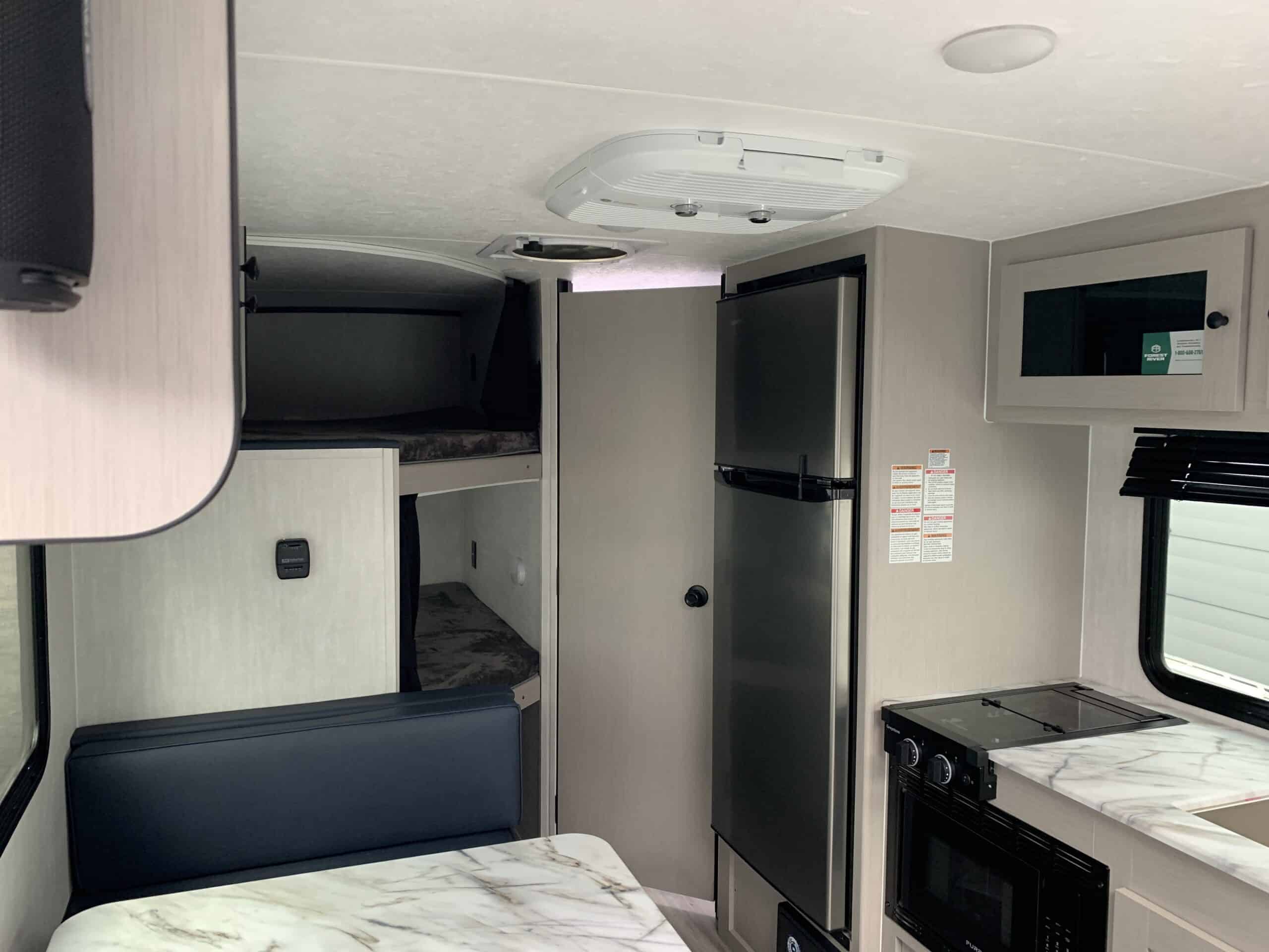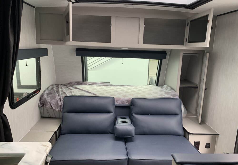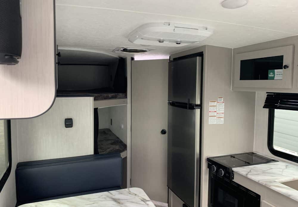 De plus, l’Apex 186BH a un air climatisé de 13500 btu qui tempérera l’ambiance désirée. Par ailleurs, la cuisinière a 2 brûleurs, un réfrigérateur 12 volts et un micro-ondes. De plus, une banquette se transforme en lit. Enfin, le système audio vous permettra d’écouter votre musique préférée.