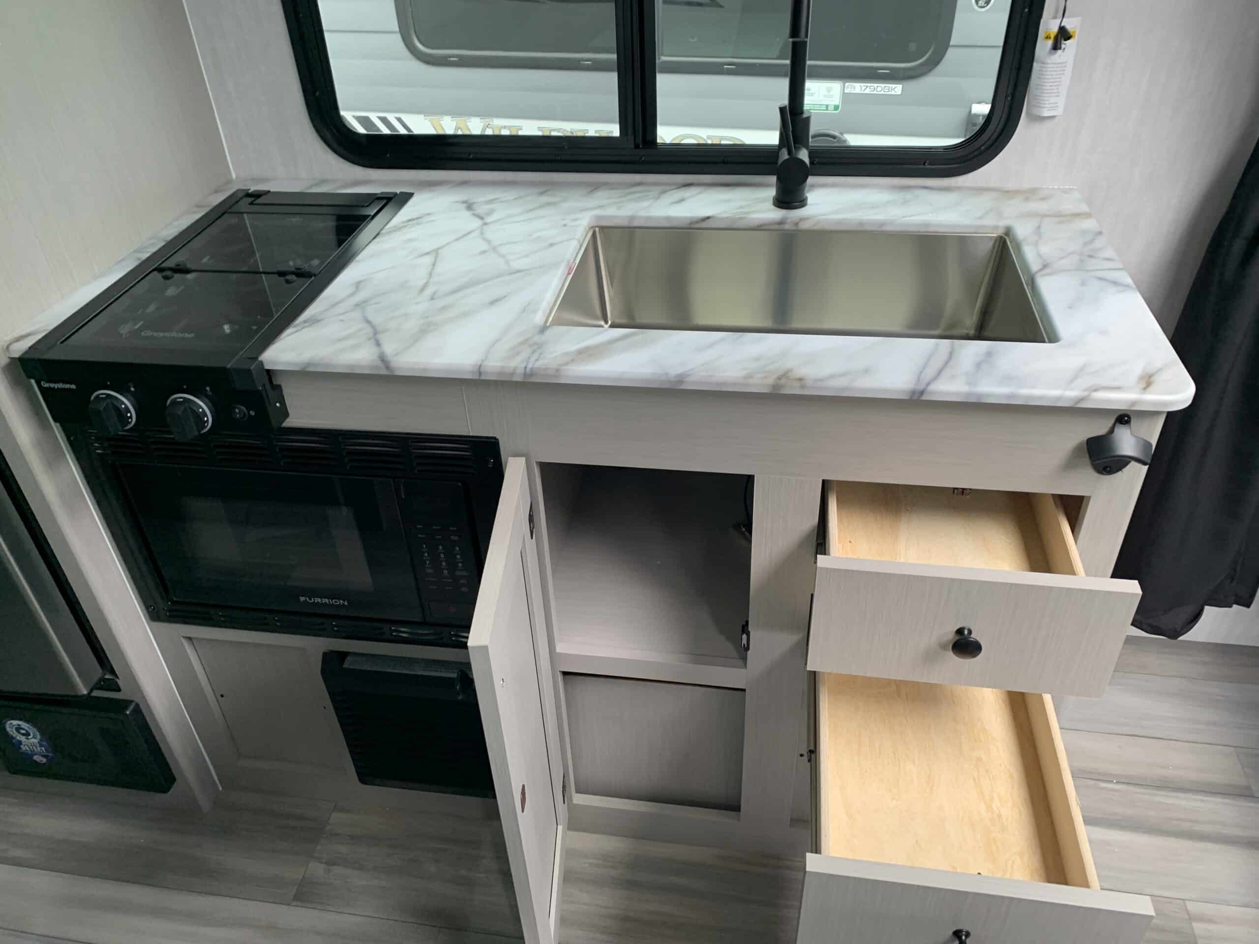 D’abord, cette roulotte a un auvent de 15 pieds, une douche et une cuisine pour profiterez de l’extérieur sans soucis. Puisque ses marches sont ajustables et très stables vous aurez un accès facile à l’intérieur. Les coffres ont un bel espace de rangement. Elle est munie d’un panneau solaire de 200 watts.