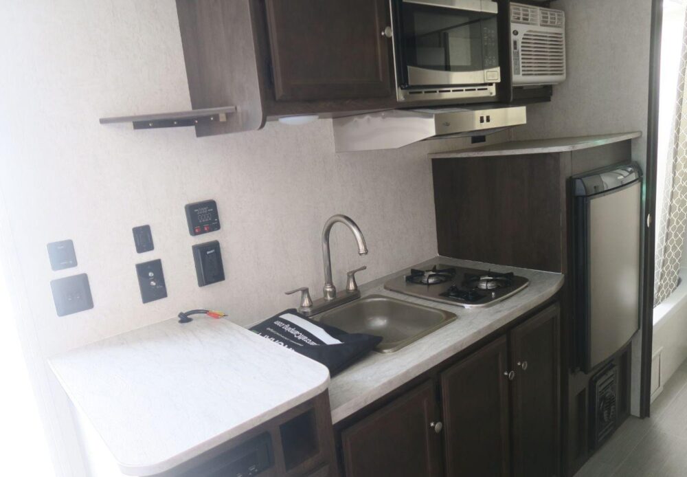 Cuisine et repas :Une dînette en « U » ou standard située dans l’extension, convertible en lit supplémentaire. La cuisine est équipée d’un réfrigérateur, d’un four à micro-ondes et d’une cuisinière à 2 ou 3 brûleurs.
