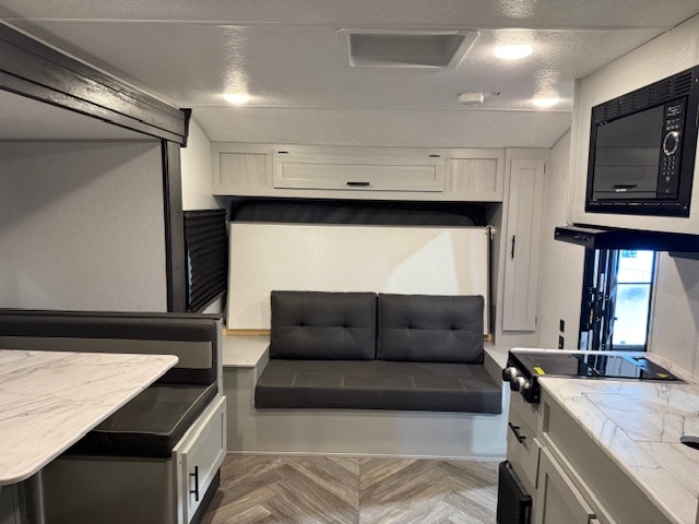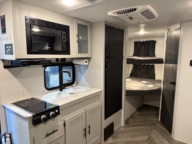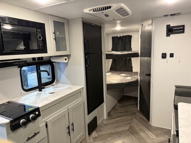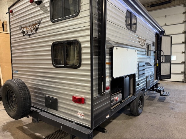 • Équipements intérieurs : L’intérieur comprend une salle de bain complète avec douche, une cuisine équipée d’une plaque de cuisson à deux brûleurs, d’un micro-ondes et d’un réfrigérateur de 11 pieds cubes fonctionnant sur 12 volts.