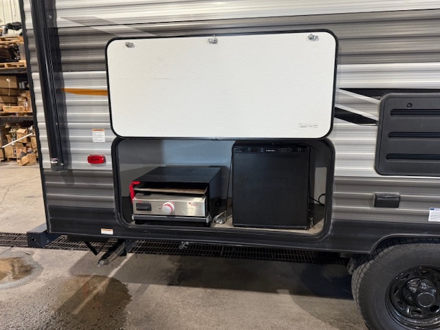 • Équipements extérieurs : Il comprend une cuisine extérieure avec une plaque de cuisson au propane et un mini-réfrigérateur, un auvent électrique avec éclairage LED (généralement de 14 ou 15 pieds) et une douche extérieure.