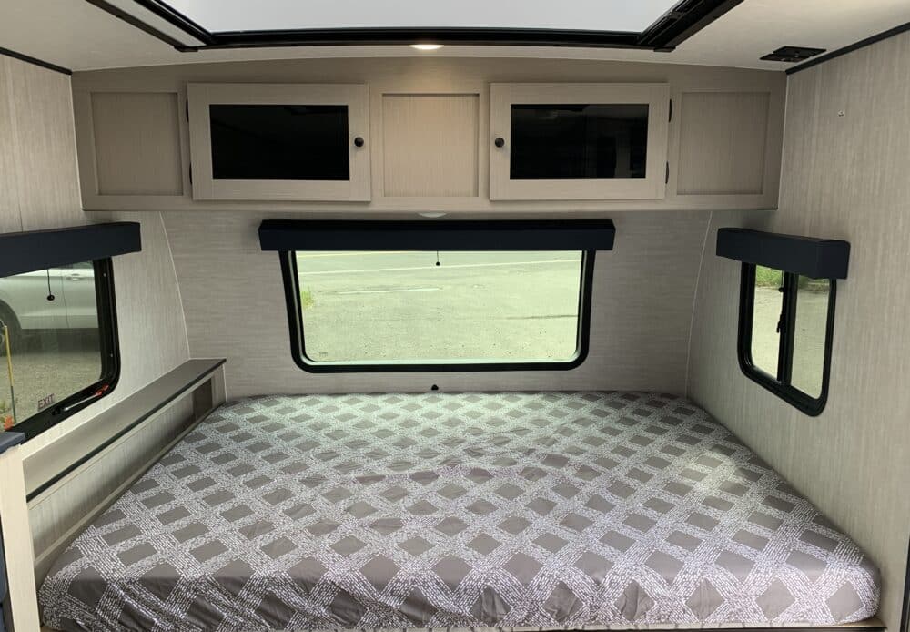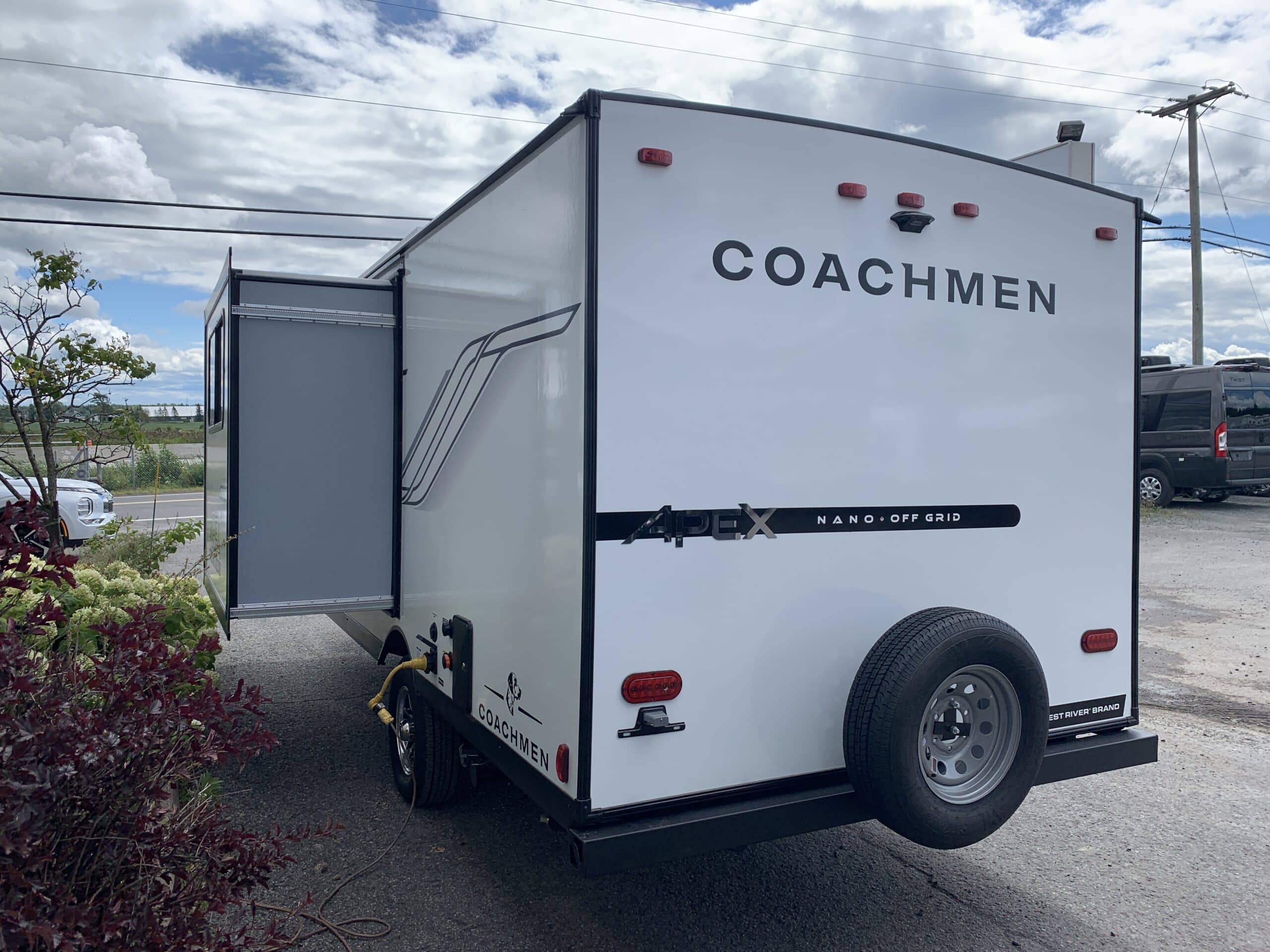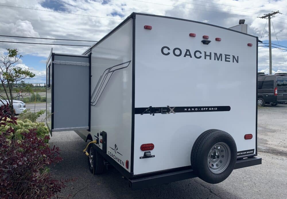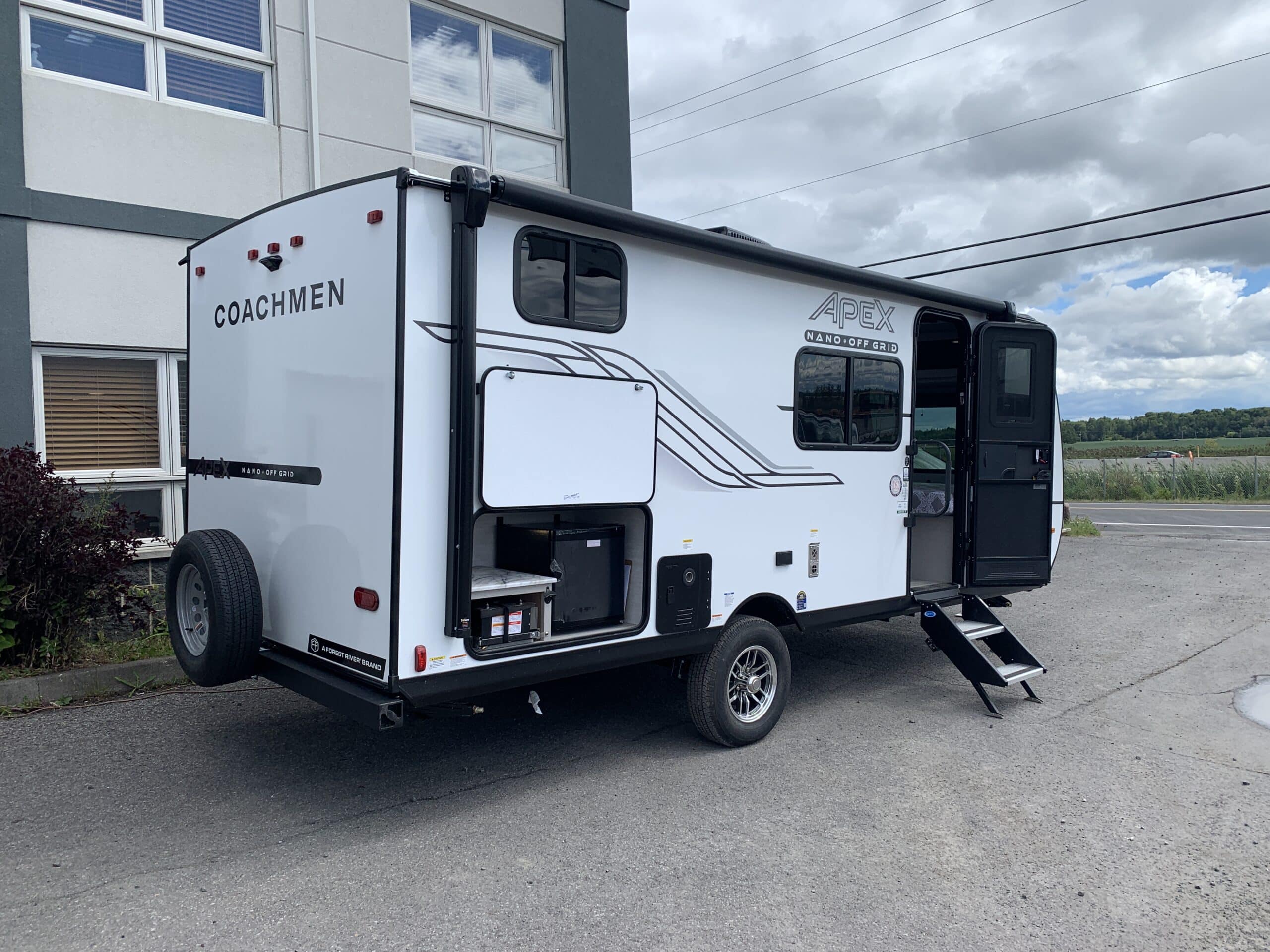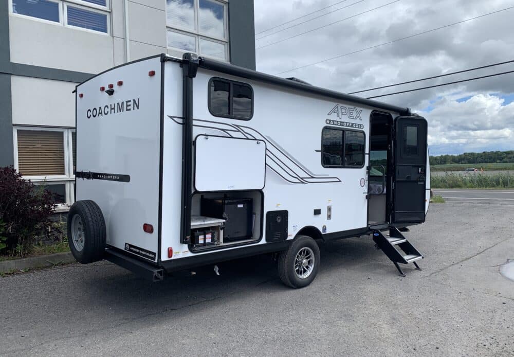 D’abord, cette roulotte a un auvent de 16 pieds, une cuisine et une douche pour profiter de l’extérieur sans soucis. Puisque ses marches sont ajustables et très stables vous aurez un accès facile à l’intérieur. Les coffres ont un bel espace de rangement. Elle est munie d’un panneau solaire de 200 watts.