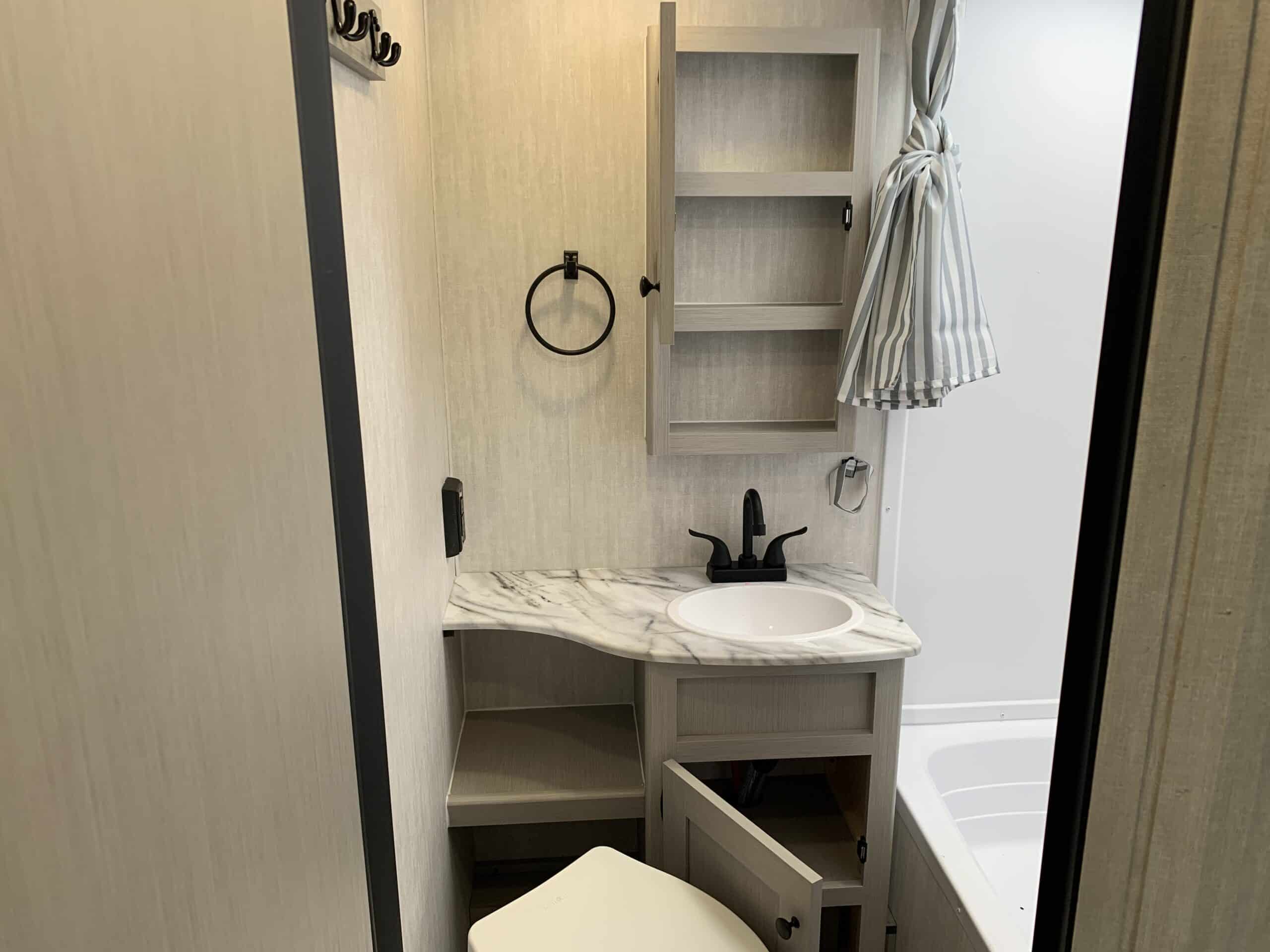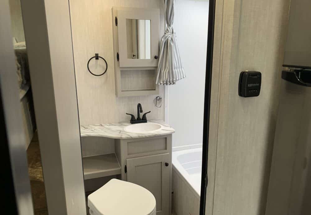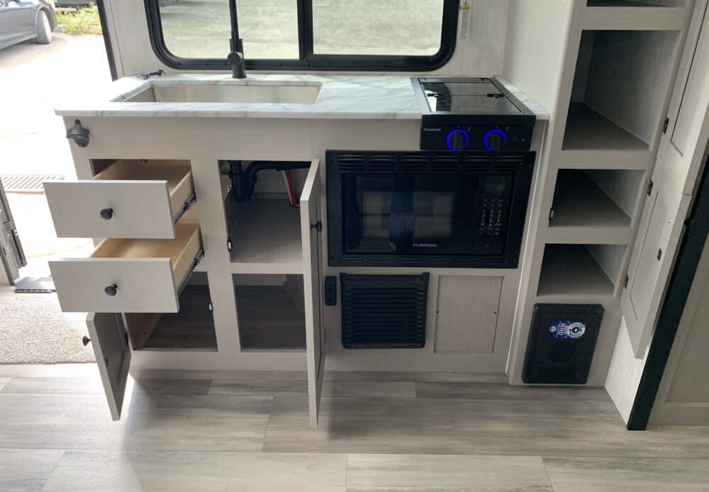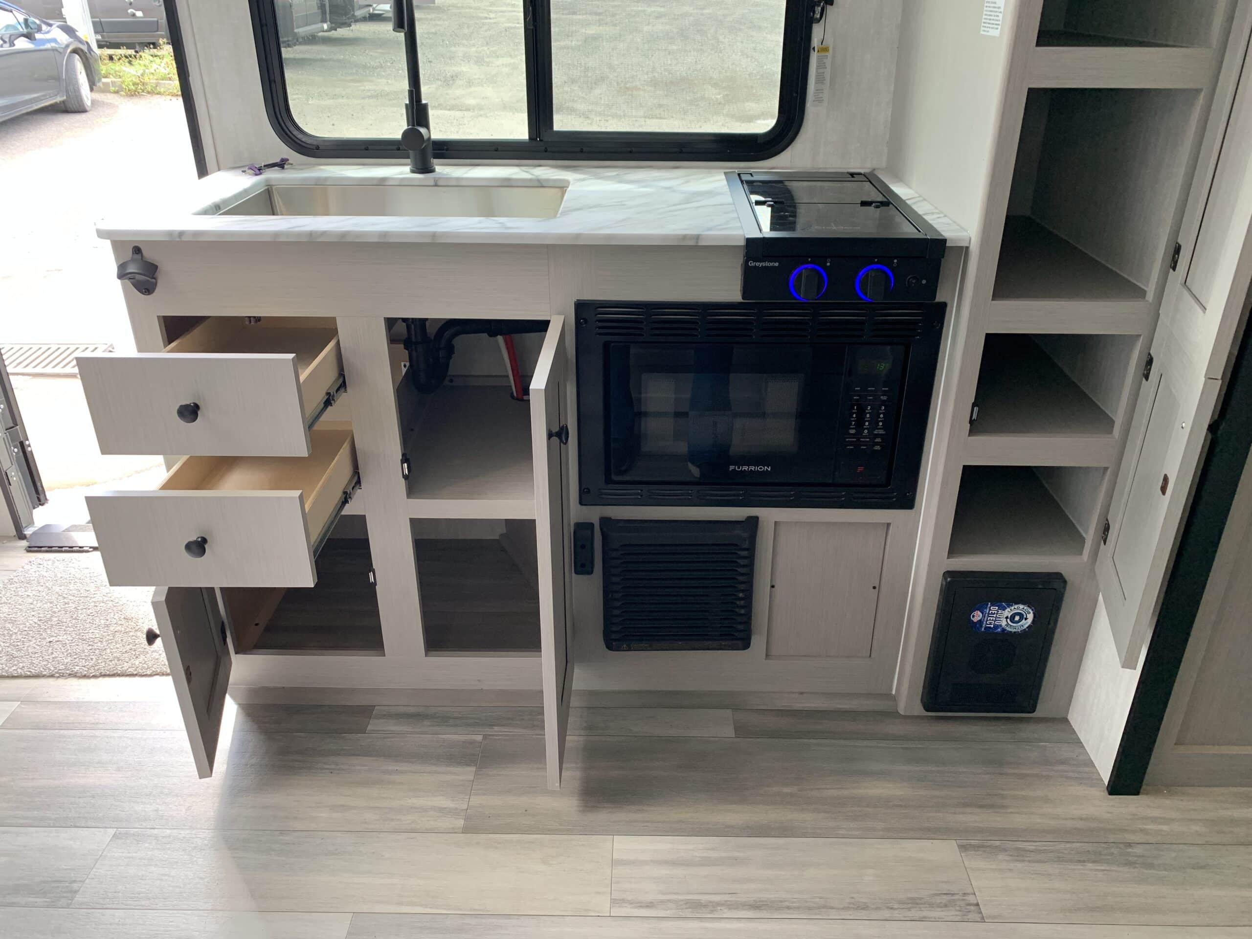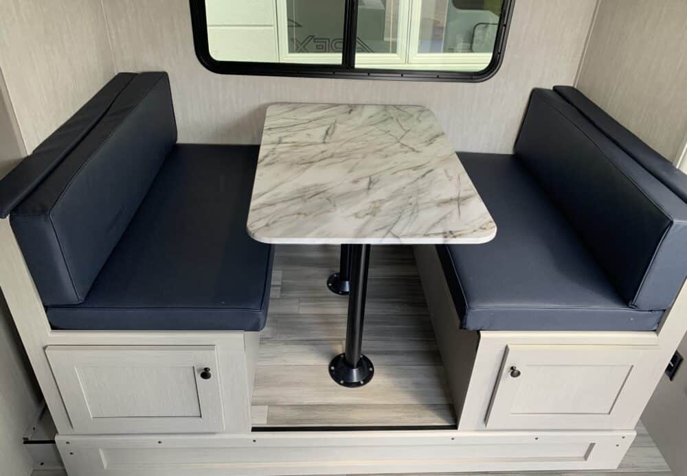 L’Apex 194BHS a un air climatisé de 13500 btu qui tempérera l’ambiance désirée. Par ailleurs, la cuisinière a 2 brûleurs, un réfrigérateur 12 volts et un micro-ondes. De plus, une banquette se transforme en lit. Enfin, le système audio vous permettra d’écouter votre musique préférée.