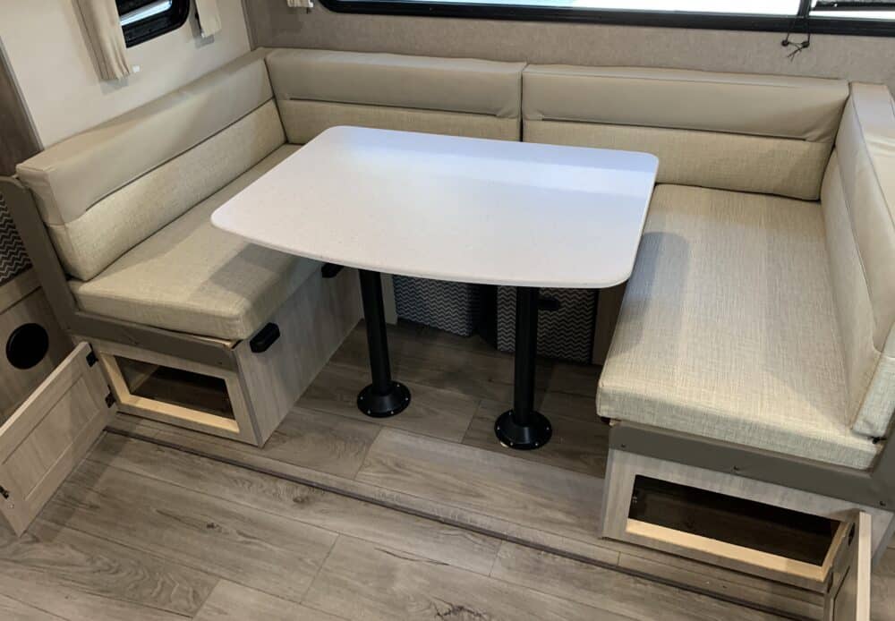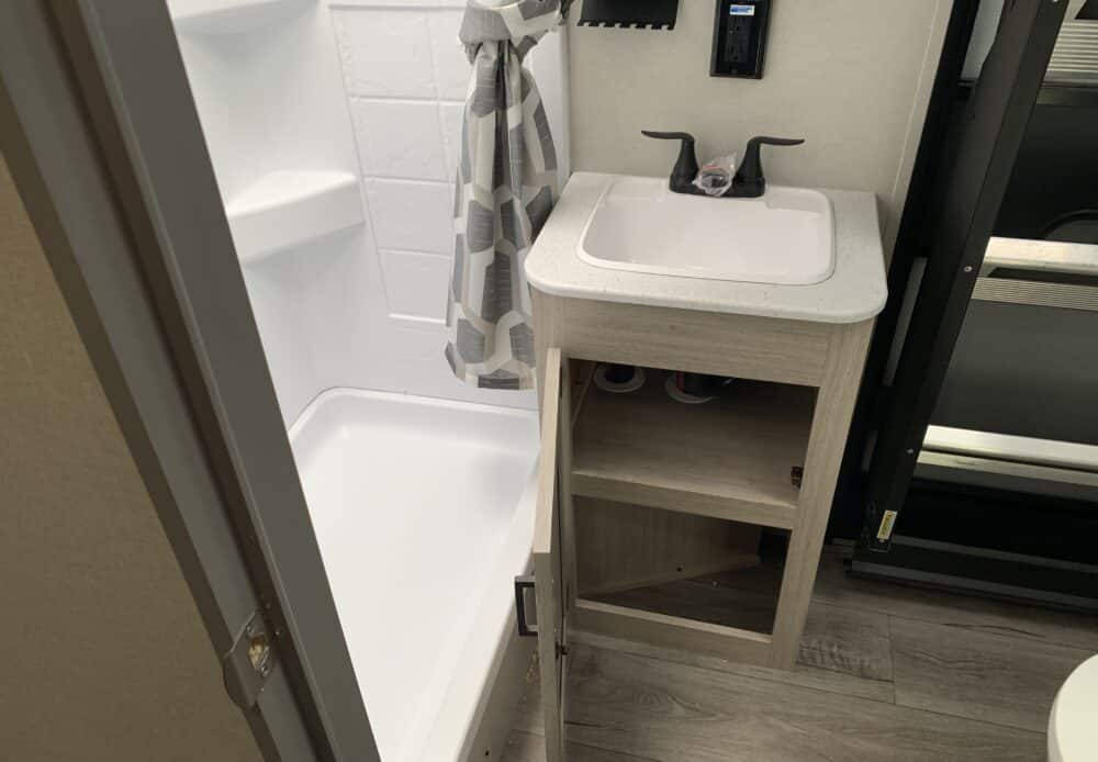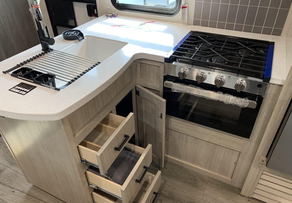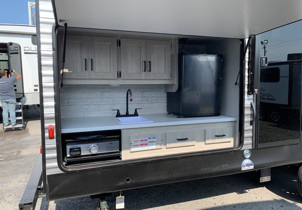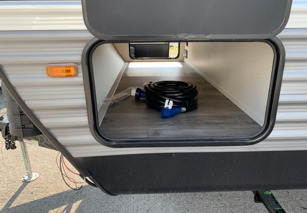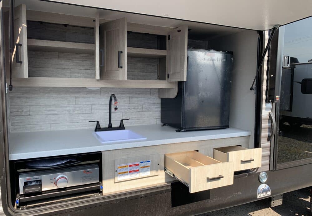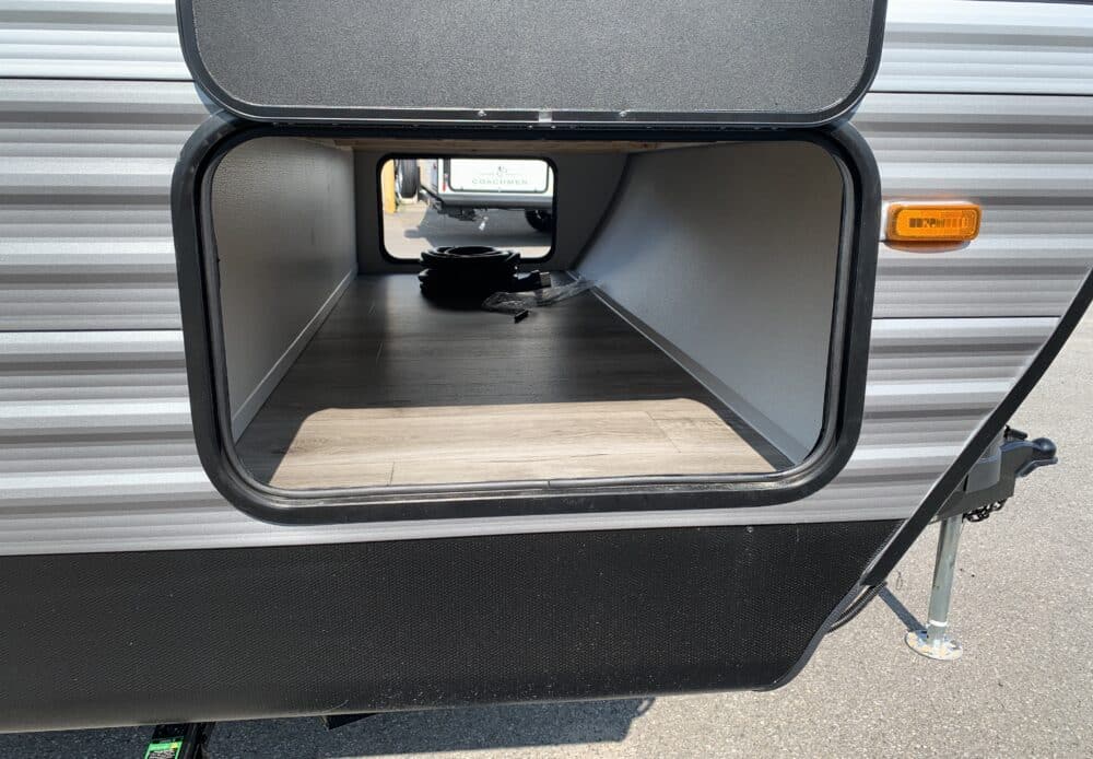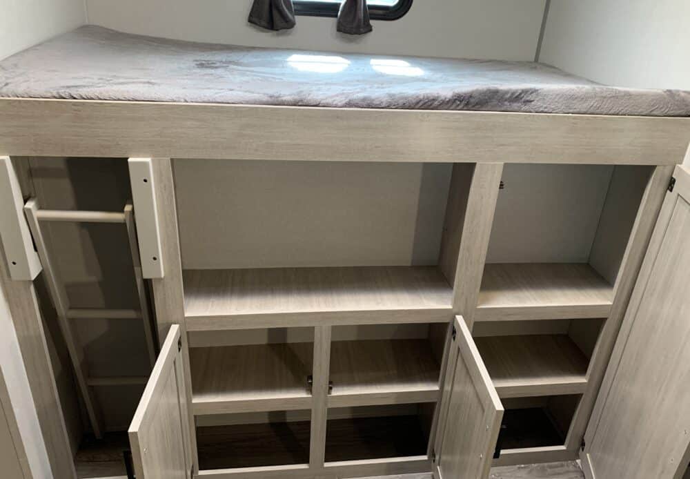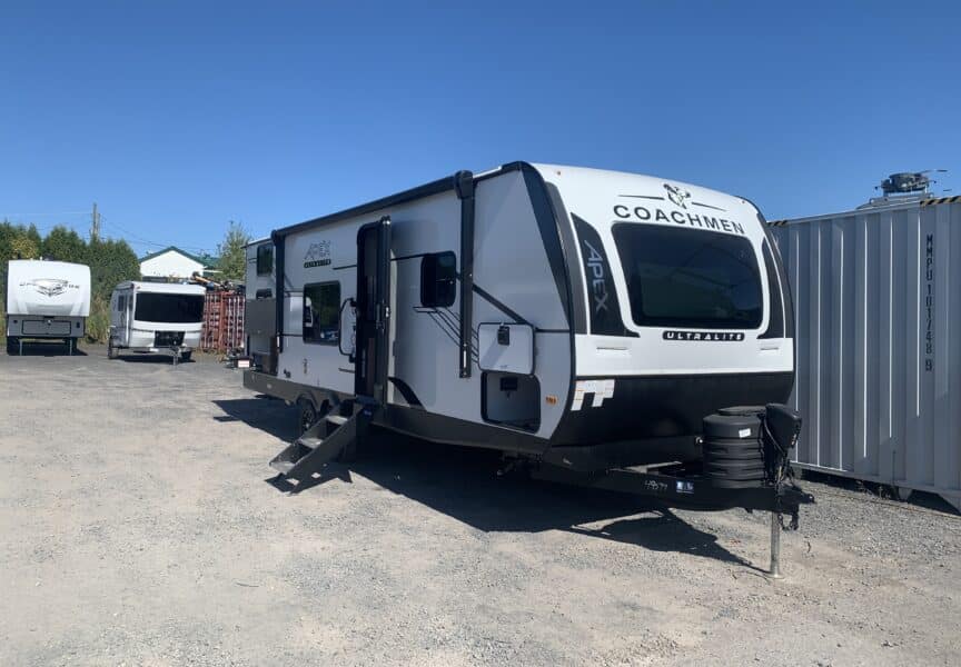 D’abord, cette roulotte a un auvent de 21 pieds et une douche pour profiterez de l’extérieur sans soucis. Puisque ses marches sont ajustables et très stables vous aurez un accès facile à l’intérieur. Les coffres ont un bel espace de rangement.