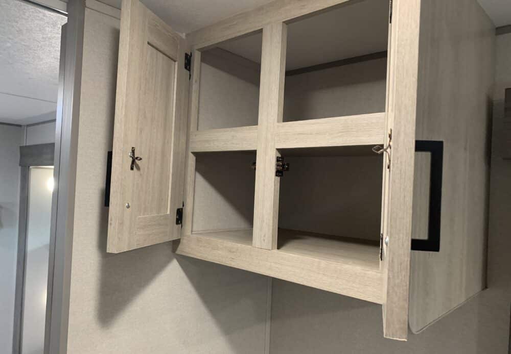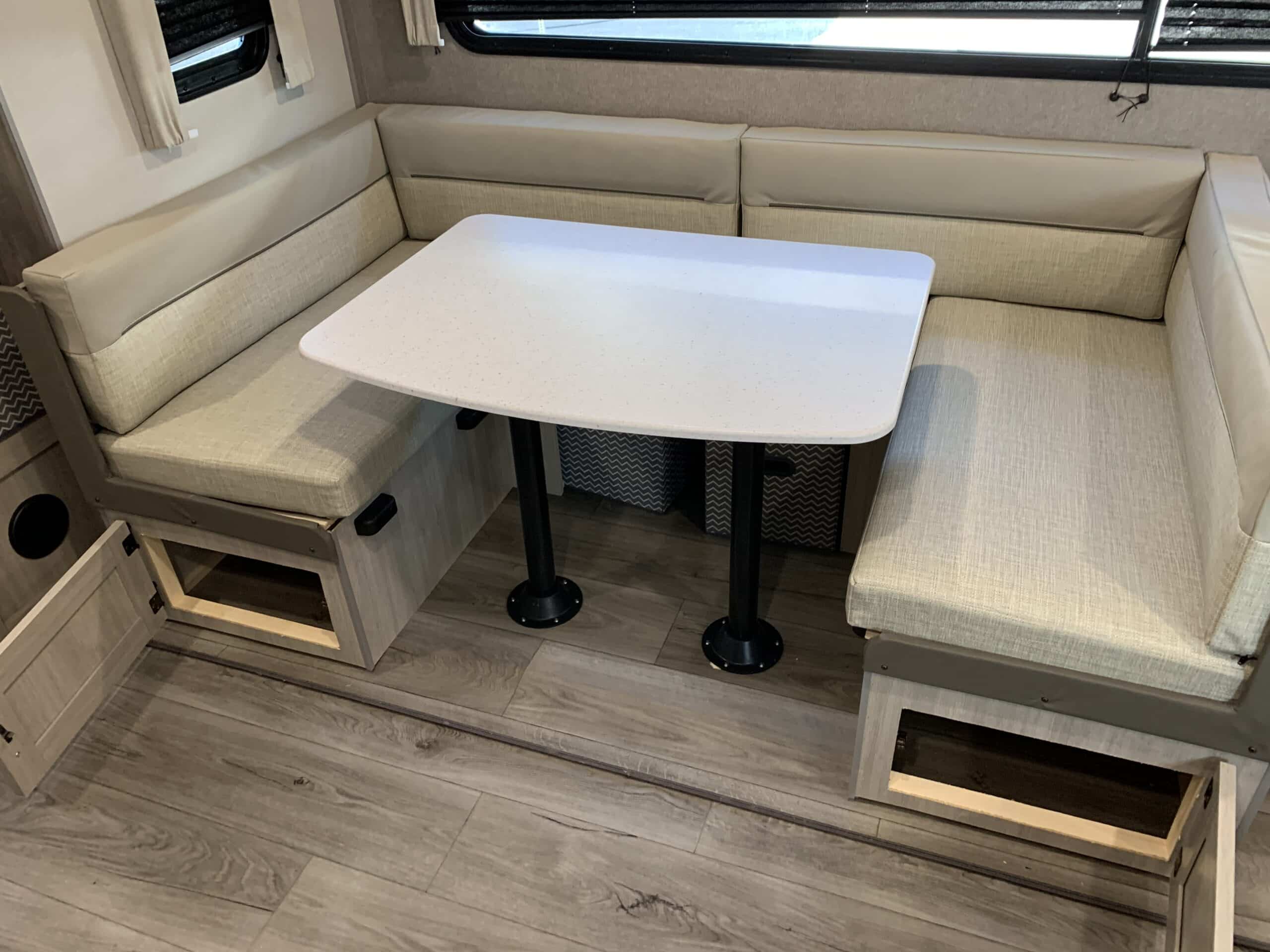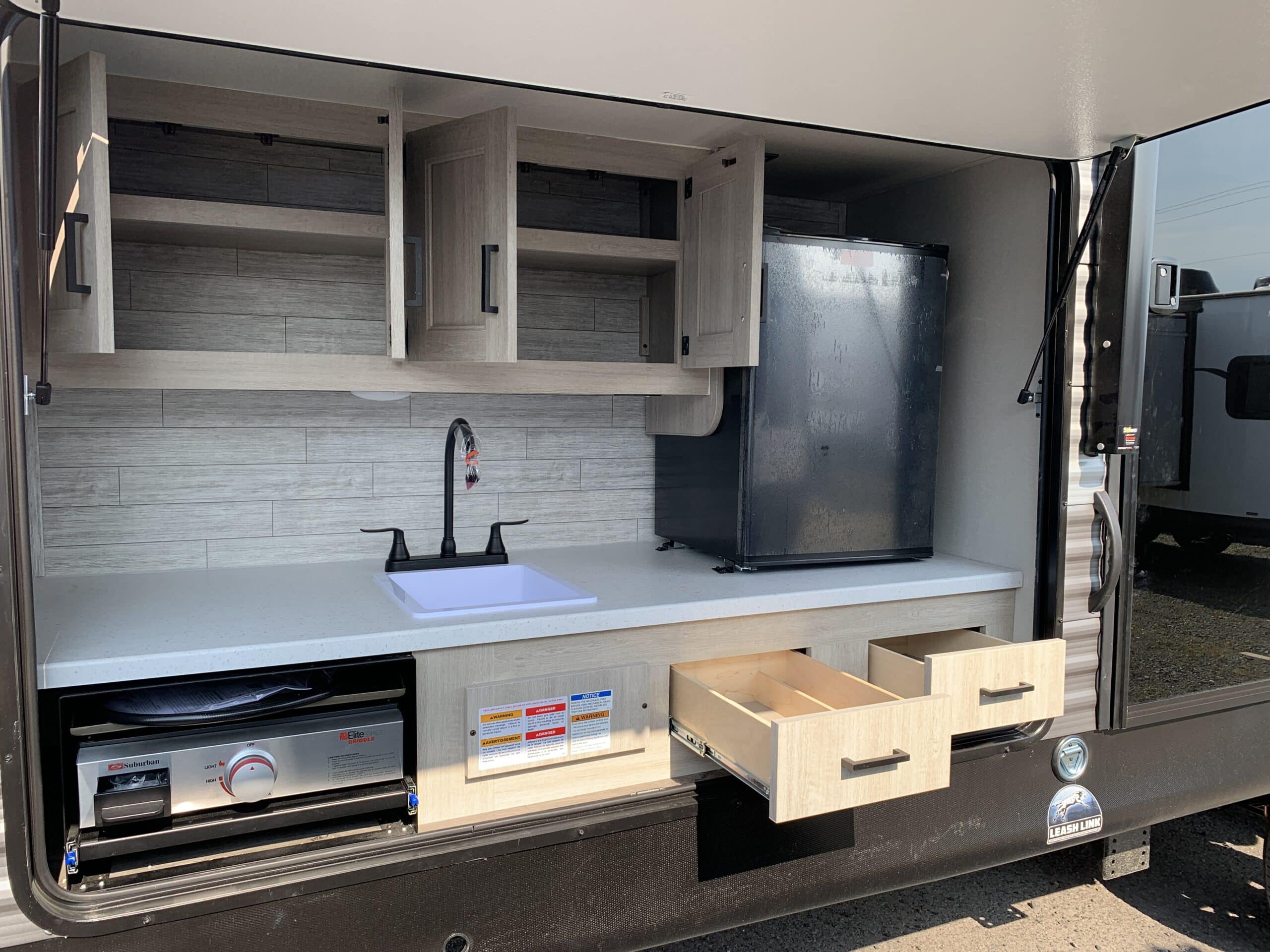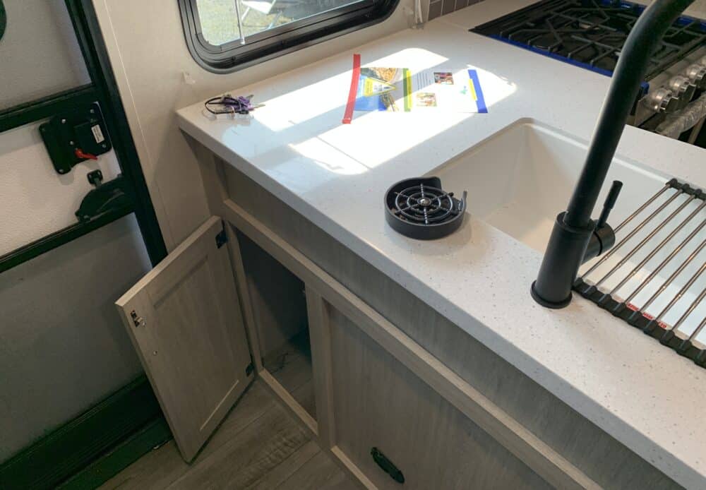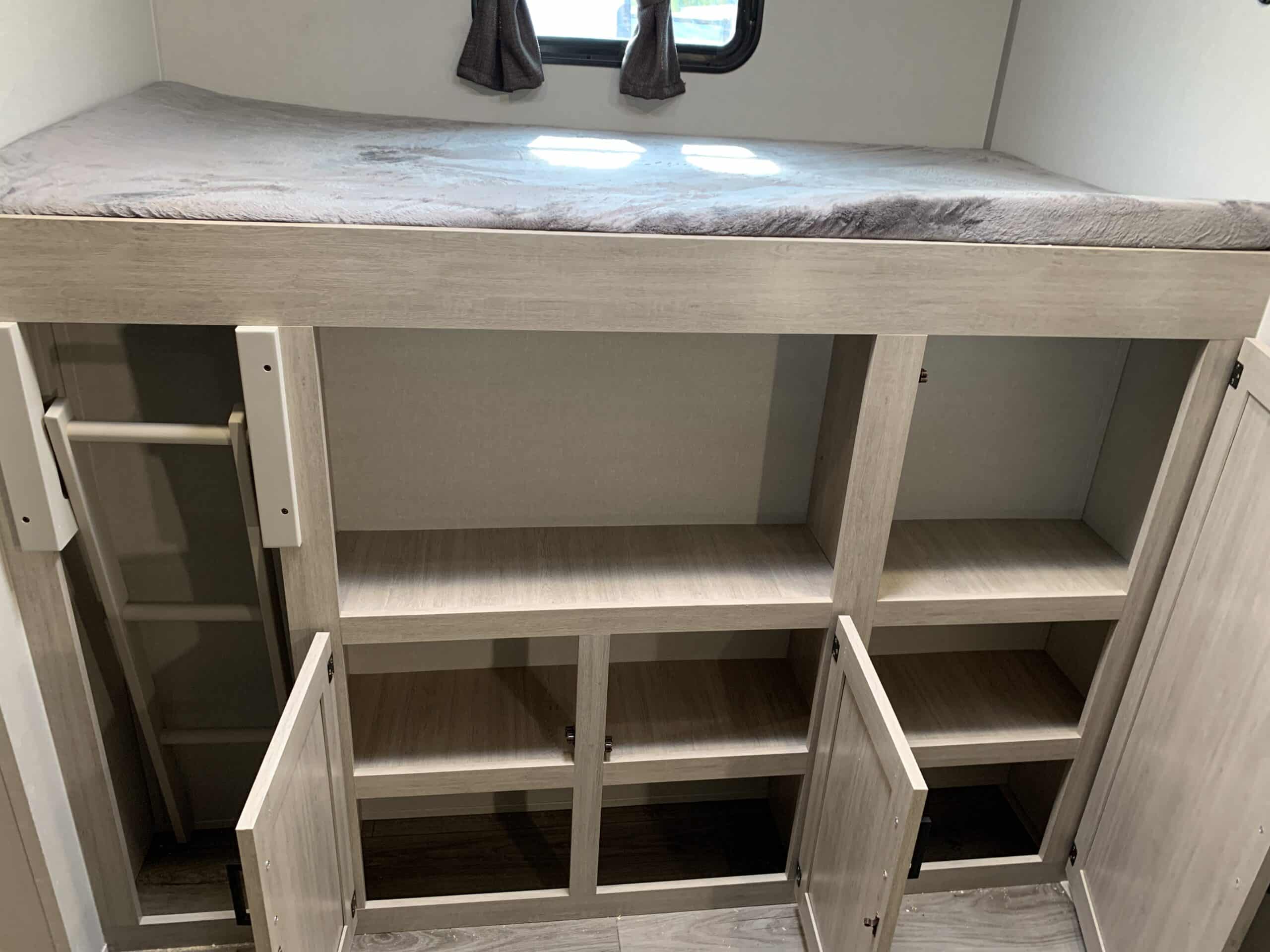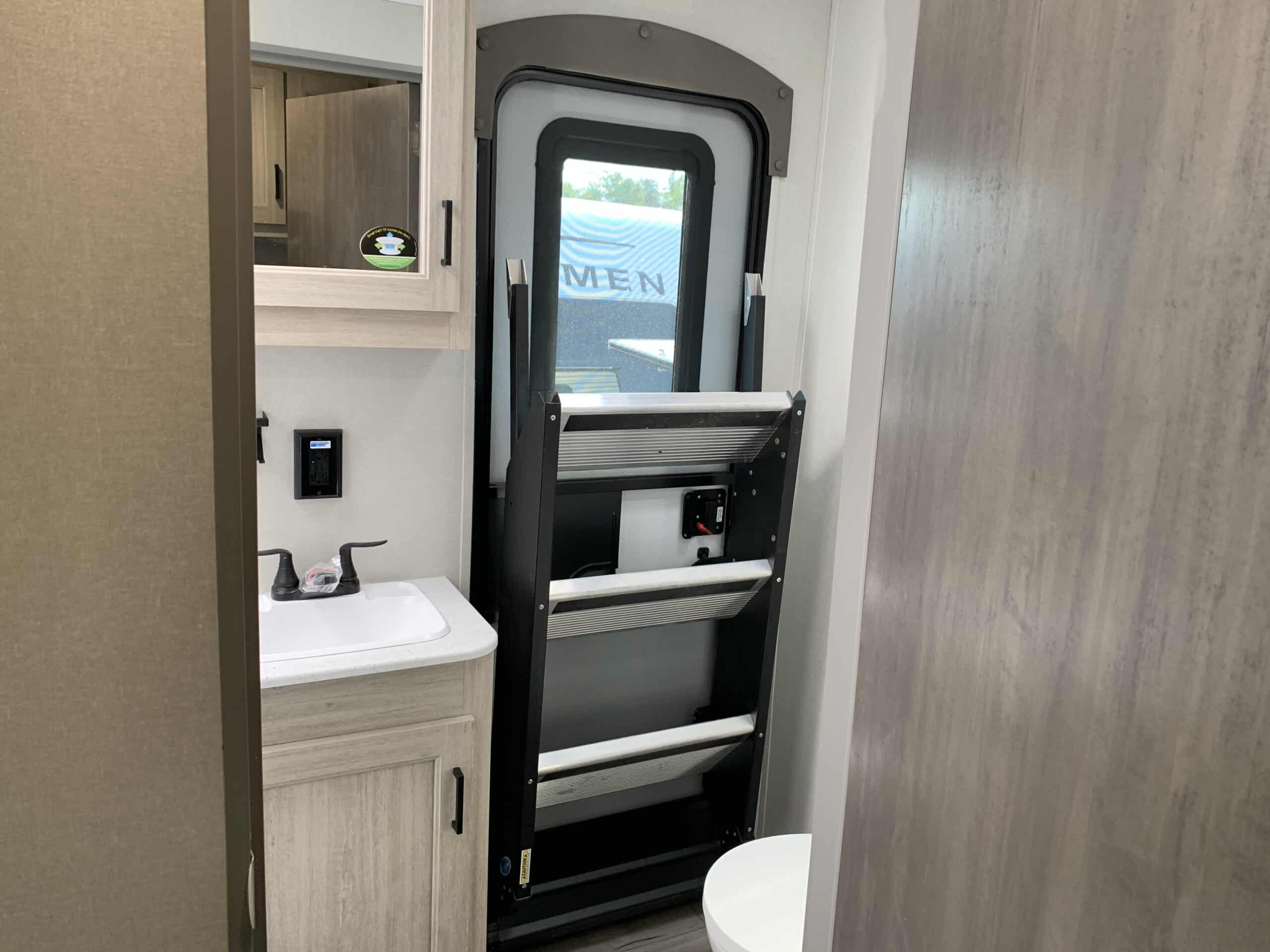D’abord, cette roulotte a un auvent de 21 pieds et une douche pour profiterez de l’extérieur sans soucis. Puisque ses marches sont ajustables et très stables vous aurez un accès facile à l’intérieur. Les coffres ont un bel espace de rangement.