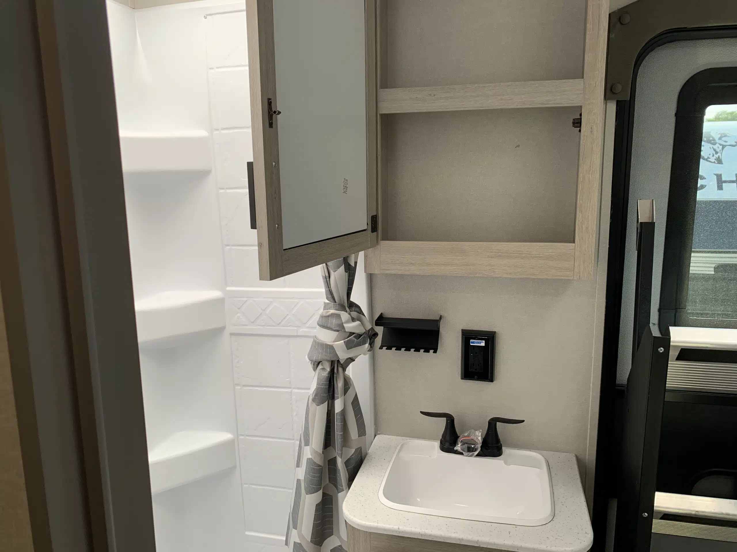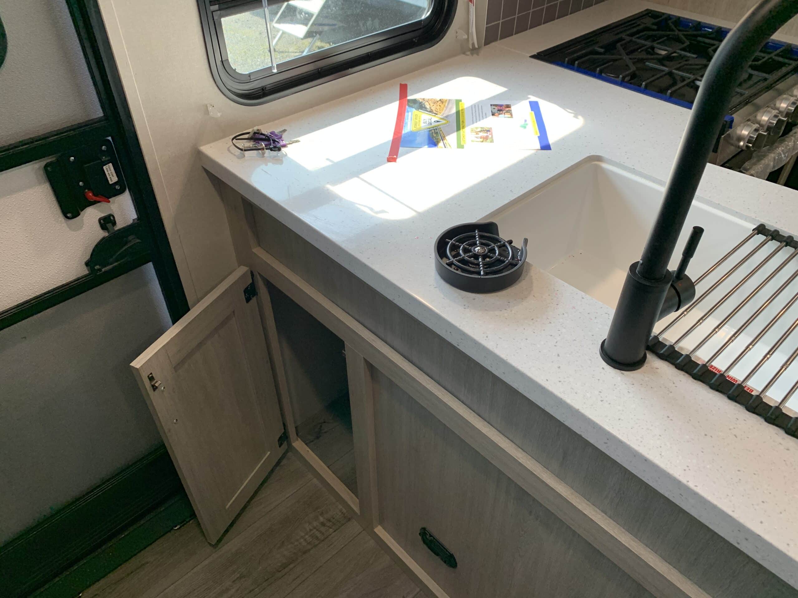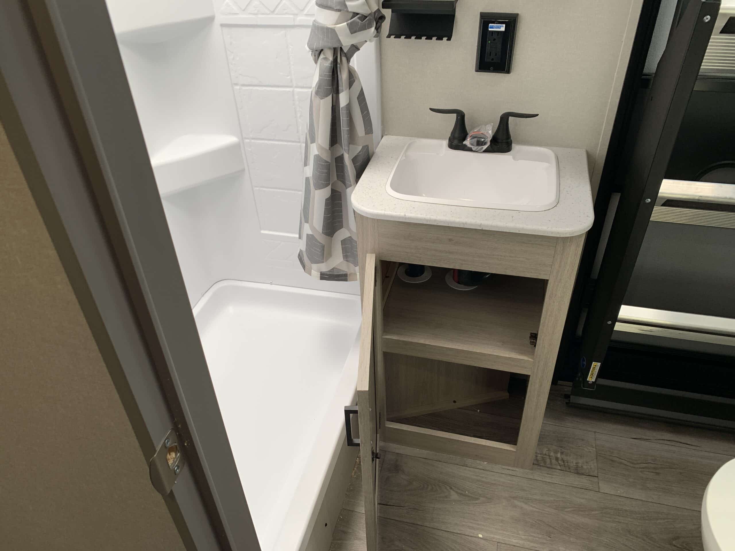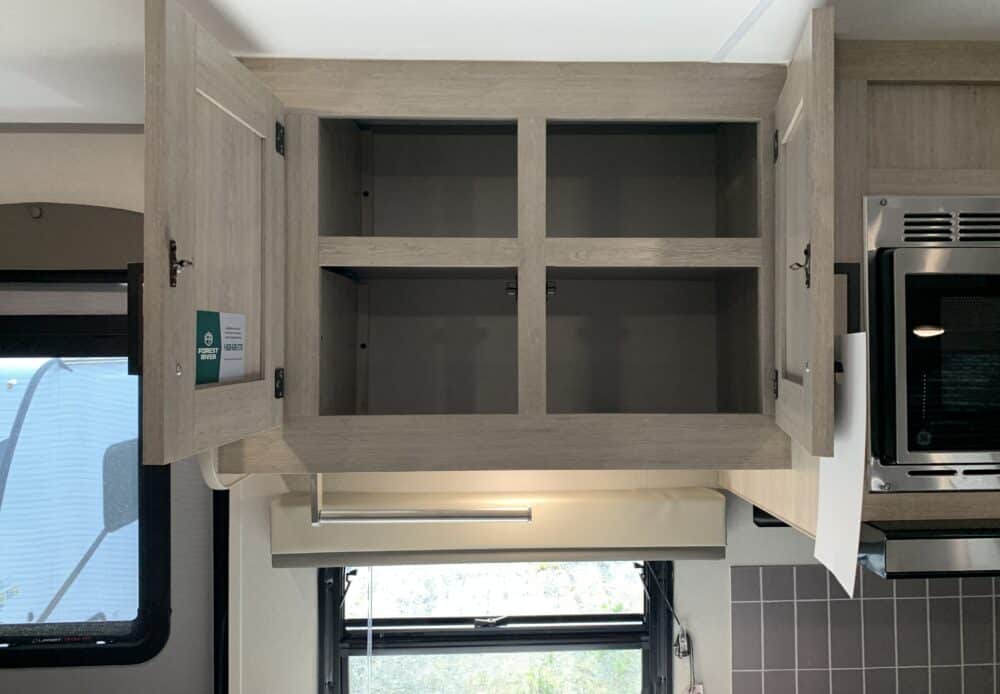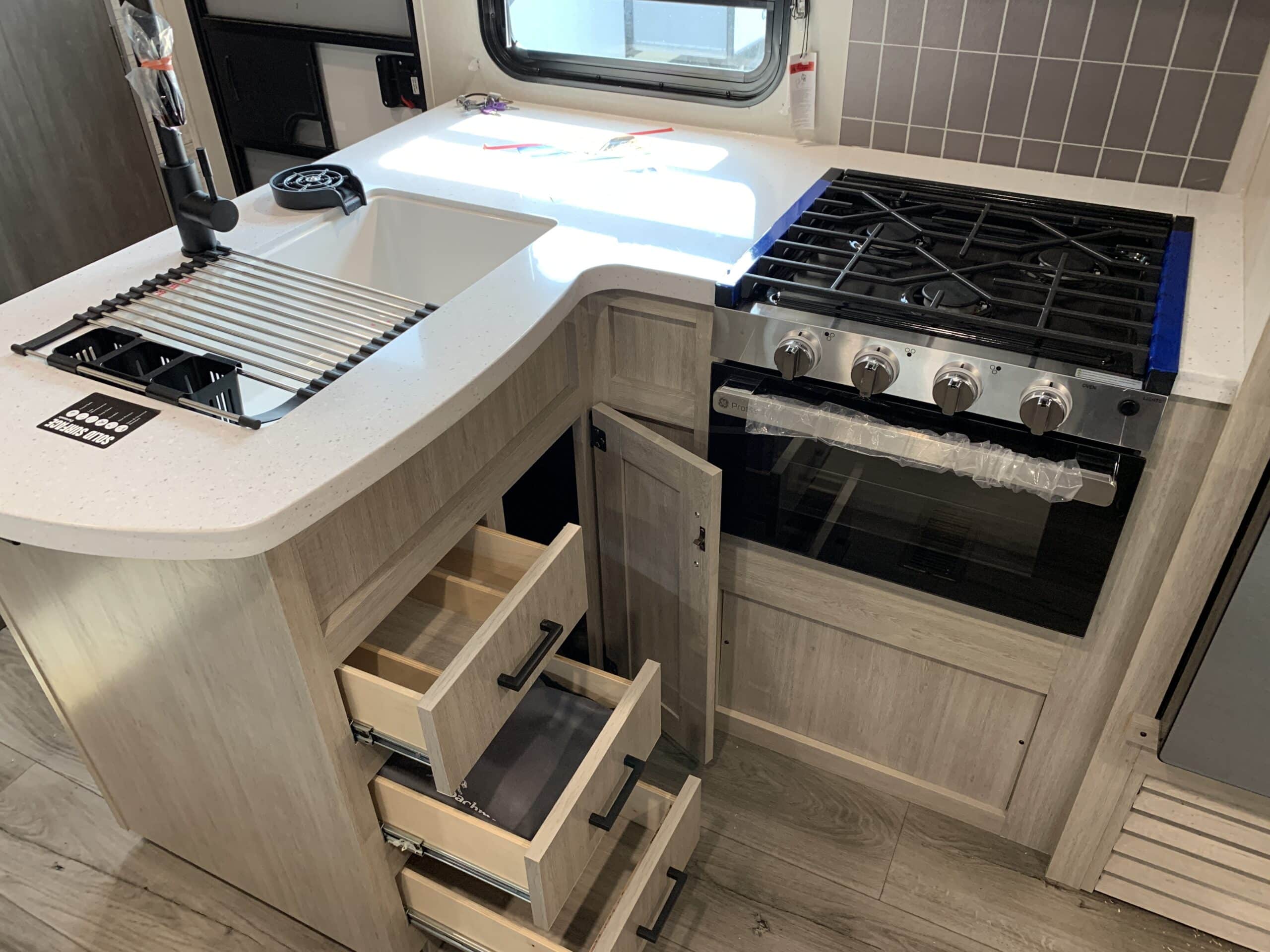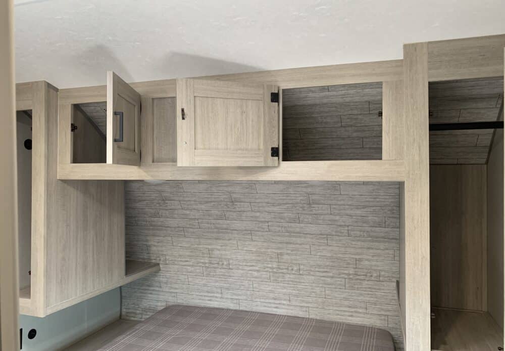 D’abord, cette roulotte a un auvent de 21 pieds et une douche pour profiterez de l’extérieur sans soucis. Puisque ses marches sont ajustables et très stables vous aurez un accès facile à l’intérieur. Les coffres ont un bel espace de rangement.
