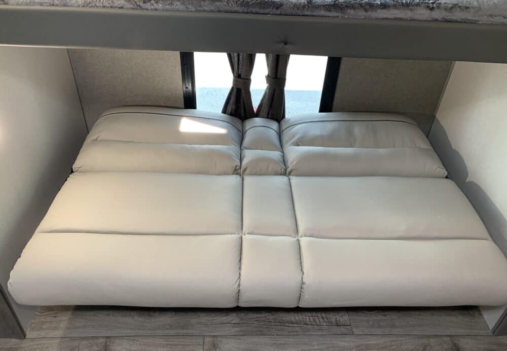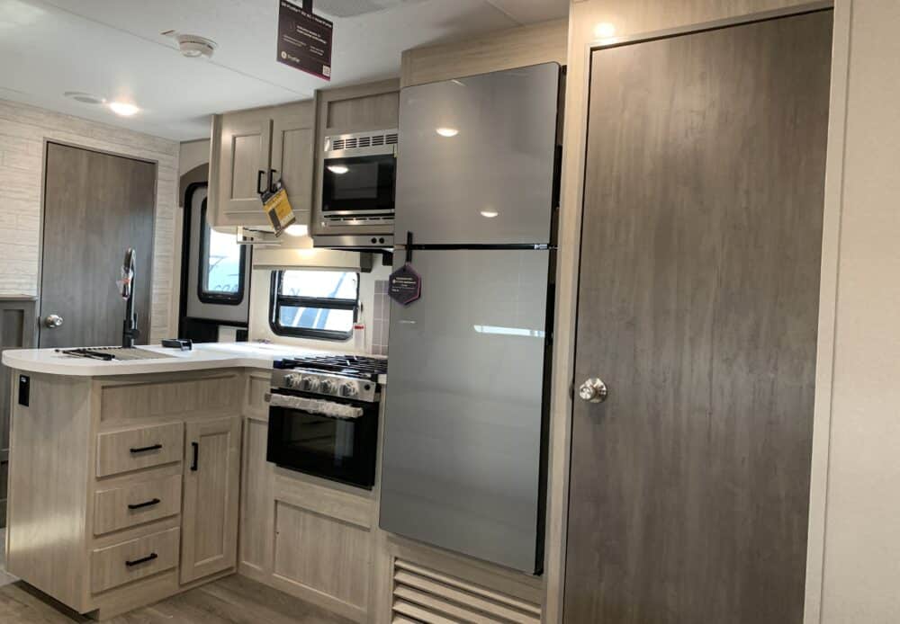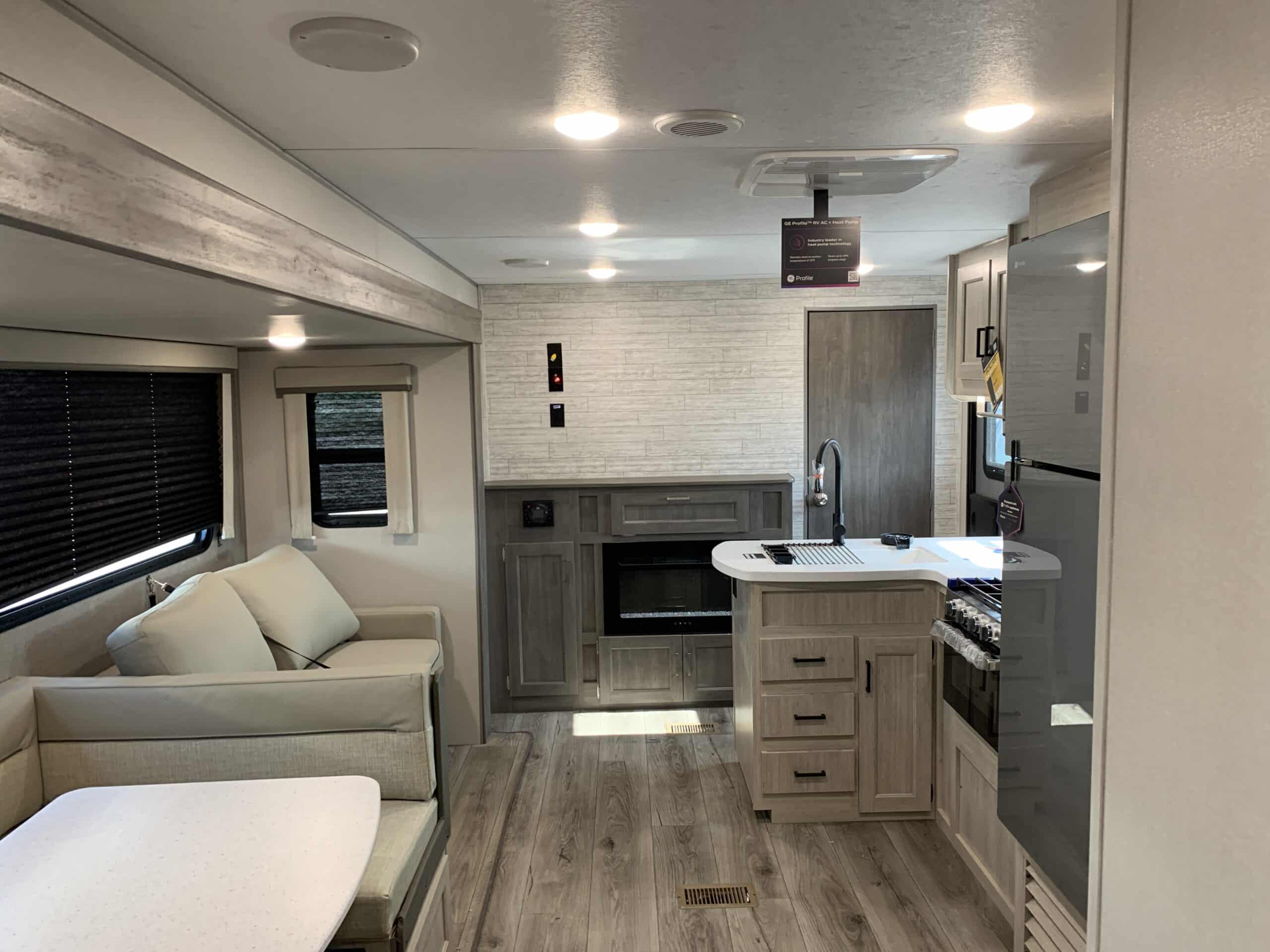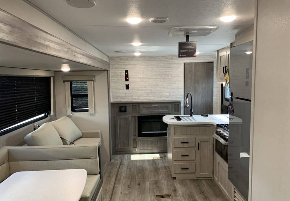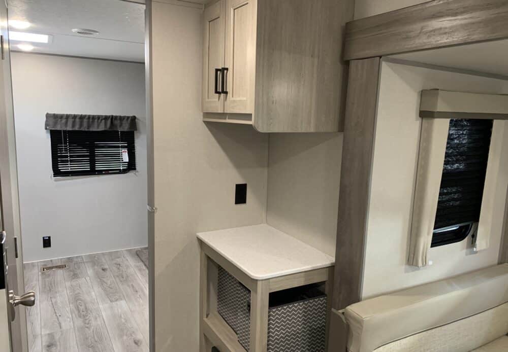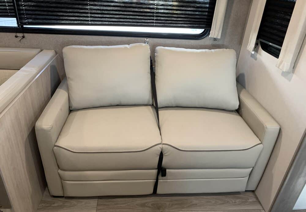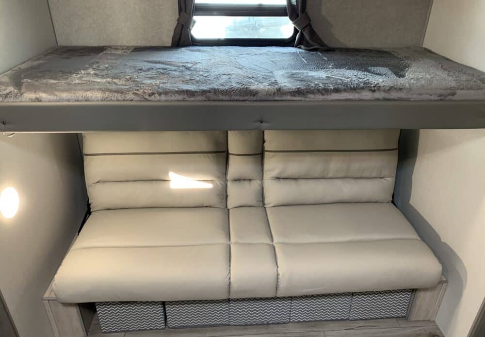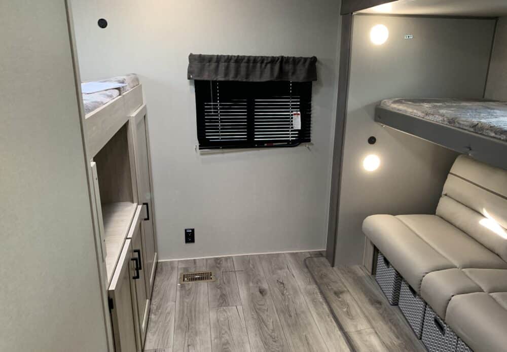 De plus, la Catalina 323BHDSCK a 1 air climatisé et un foyer qui tempéreront l’ambiance désirée. Par ailleurs, la cuisinière a un four et 3 brûleurs, un réfrigérateur et un micro-ondes. De plus, il y a une banquette, un sofa lit et un garde-manger qui peut recevoir laveuse/sécheuse. Enfin, le système audio vous permettra d’écouter votre musique préférée.