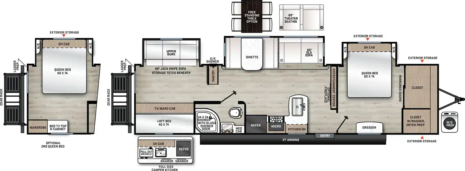 D’abord, cette roulotte a un auvent de 21 pieds et une douche pour profiterez de l’extérieur sans soucis. Puisque ses marches sont ajustables et très stables vous aurez un accès facile à l’intérieur. Les coffres ont un bel espace de rangement.