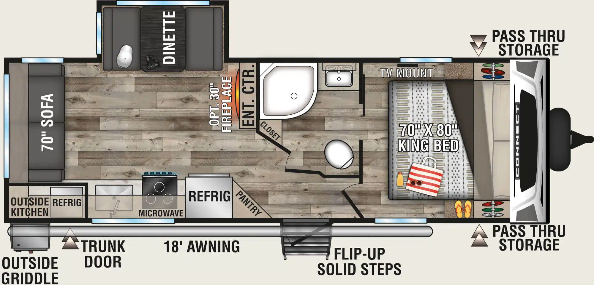 De plus, la Connect 241RLK a un air climatisé de 13500 btu et un foyer qui tempéreront l’ambiance désirée. Par ailleurs, la cuisinière a un four et 3 brûleurs, un réfrigérateur gaz/électrique, un micro-ondes et un garde-manger. De plus, une banquette qui se transforme en lit. Enfin, le système audio vous permettra d’écouter votre musique préférée.