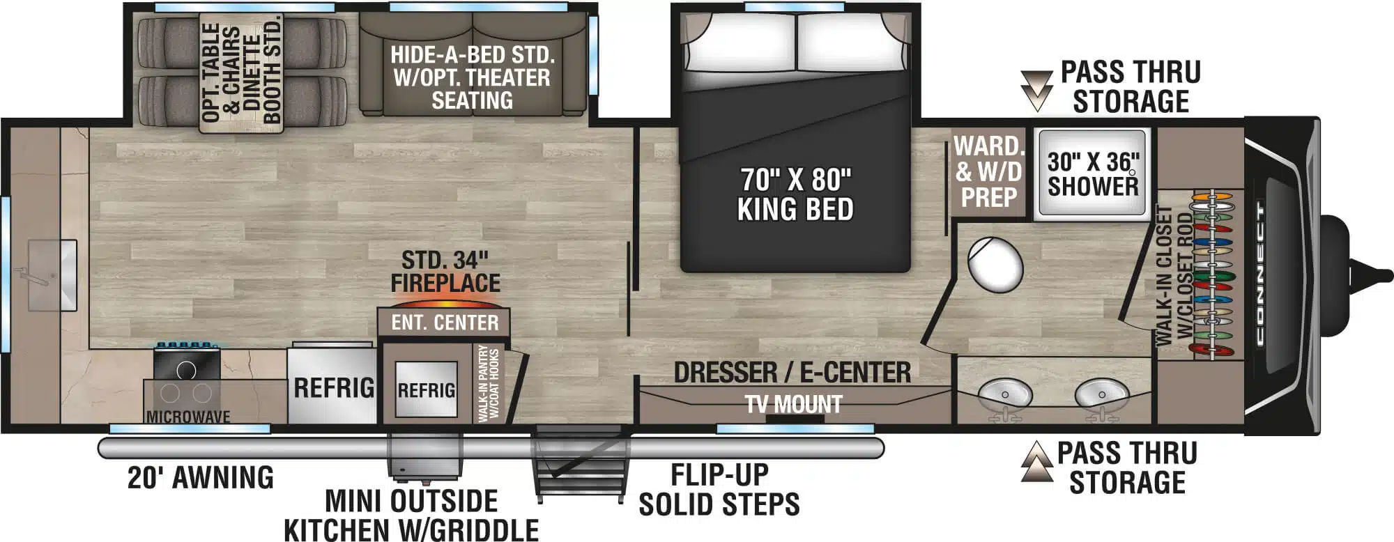 De plus, la Connect 302FK a un air climatisé de 15000 btu et un foyer qui tempéreront l’ambiance désirée. Par ailleurs, la cuisinière a un four et 3 brûleurs, un réfrigérateur, un micro-ondes et un grand garde-manger. De plus, une table avec banquette pour le coin repas.