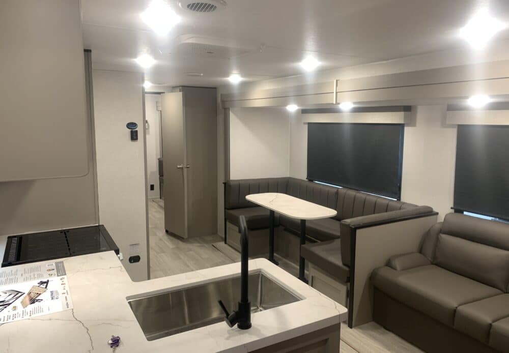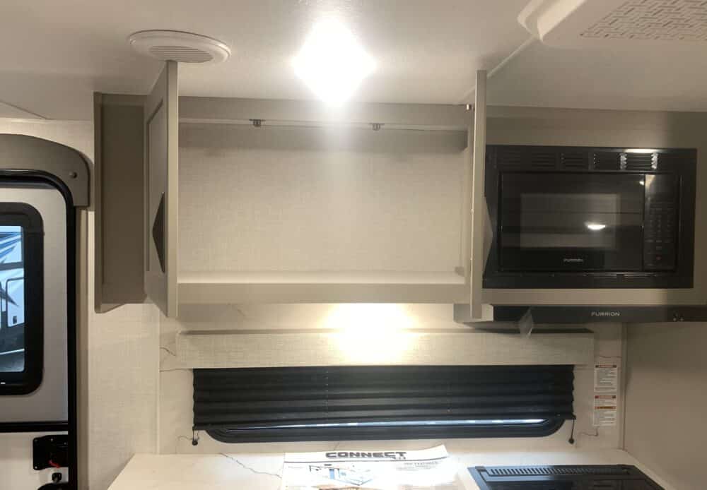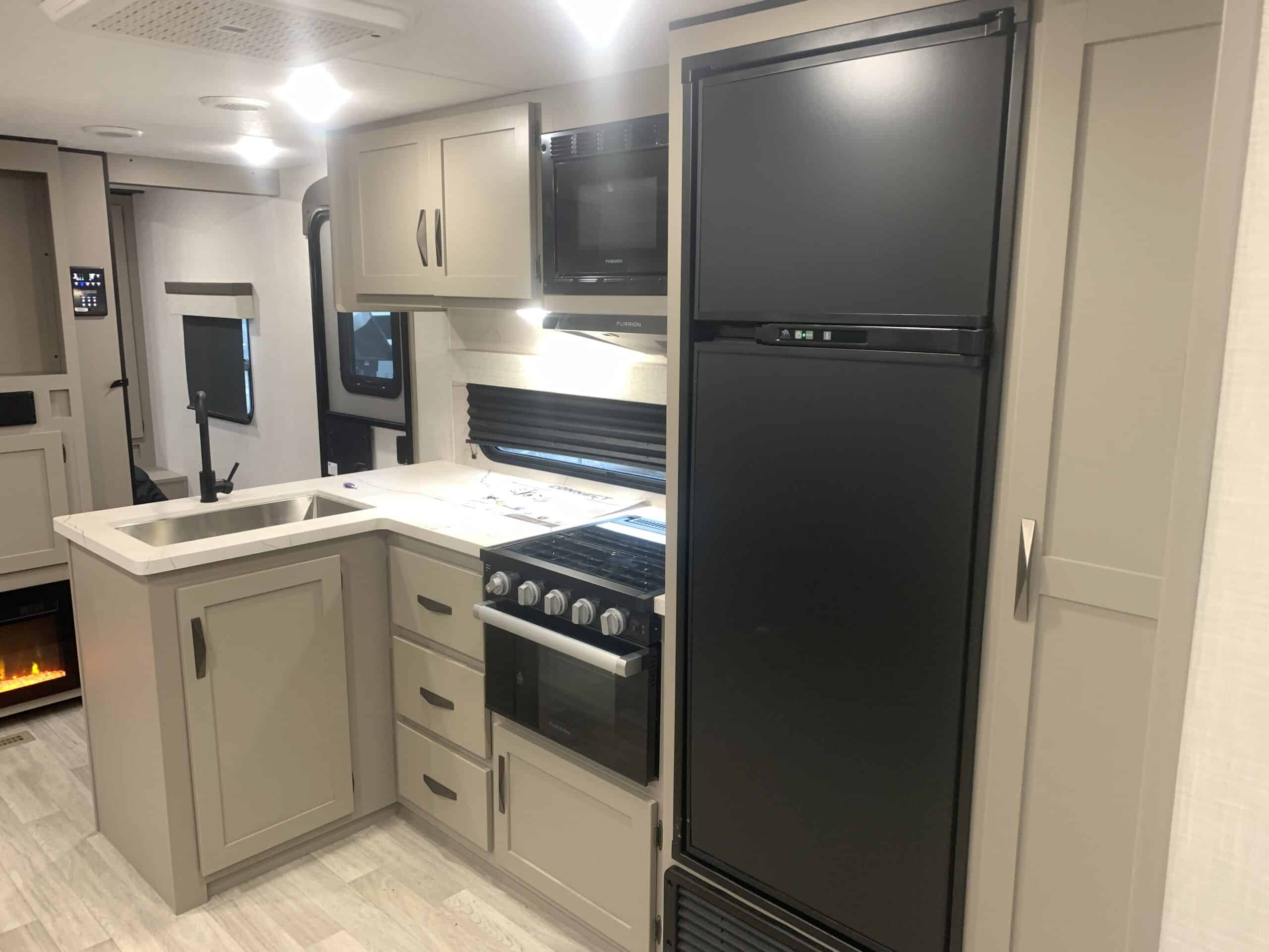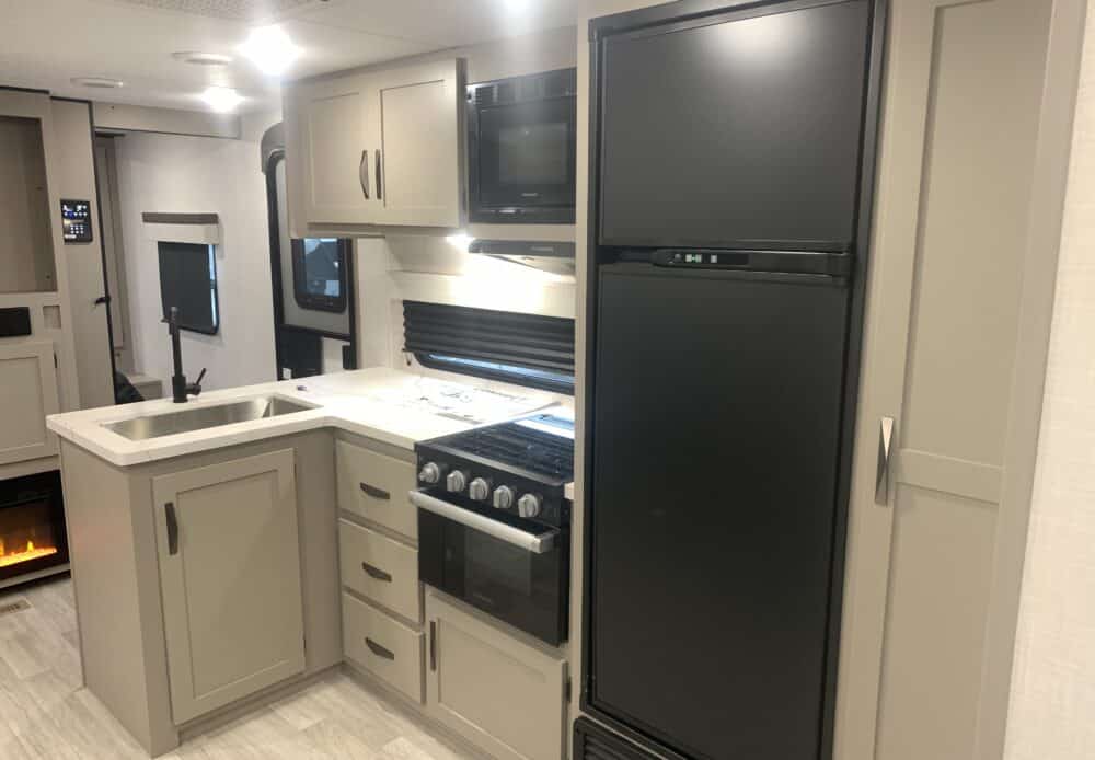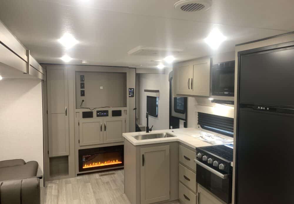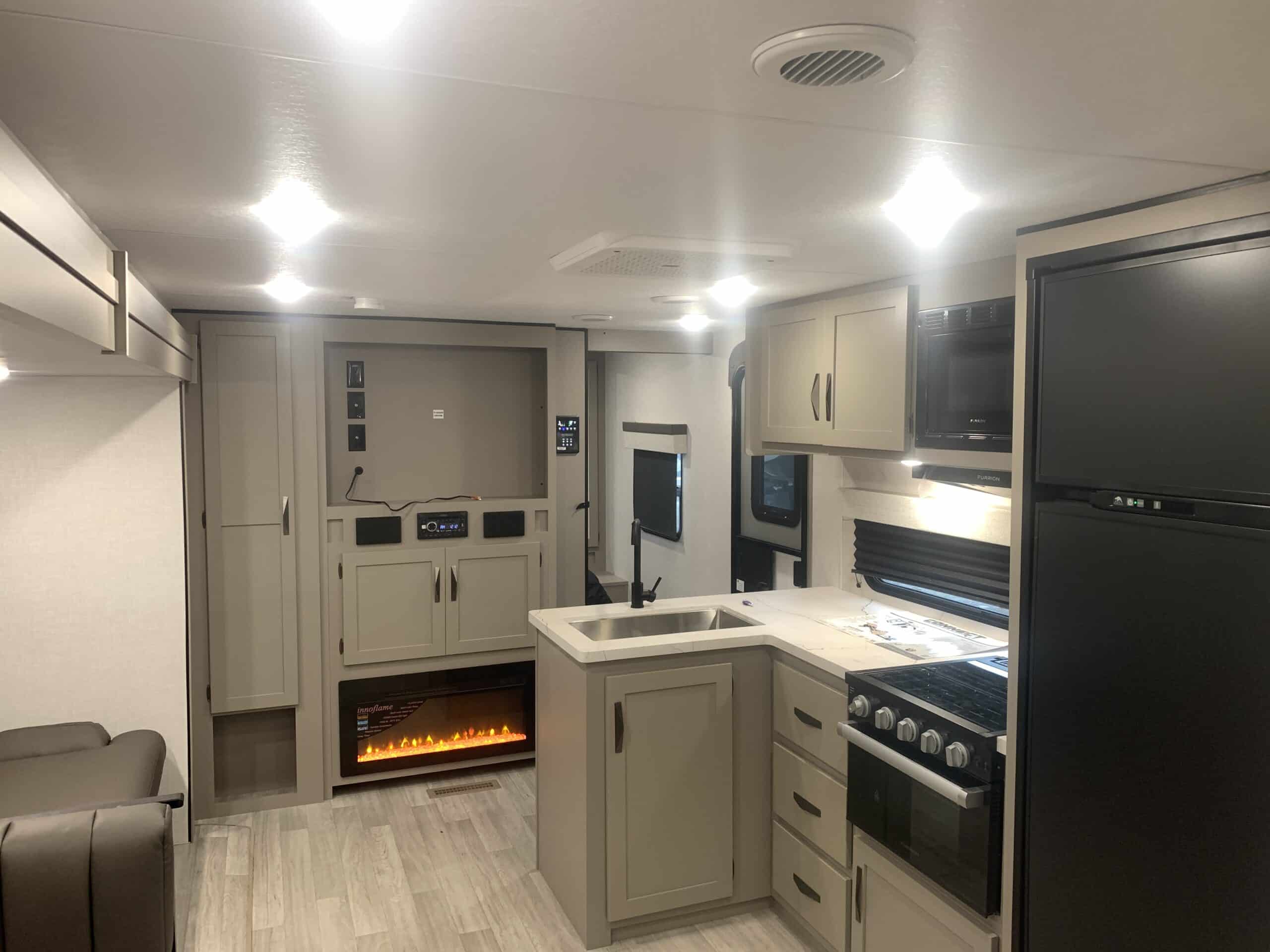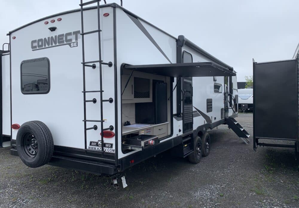 De plus, la Connect 312BHKSE a un air climatisé de 13500 btu. qui tempérera  l’ambiance désirée. Aussi, la cuisine a un poêle avec 3 brûleurs, un micro-ondes et un réfrigérateur 8p.c. gaz/électrique. Également une banquette, un sofa lit et un garde-manger. Enfin, le système audio vous permettra d’écouter votre musique préférée.