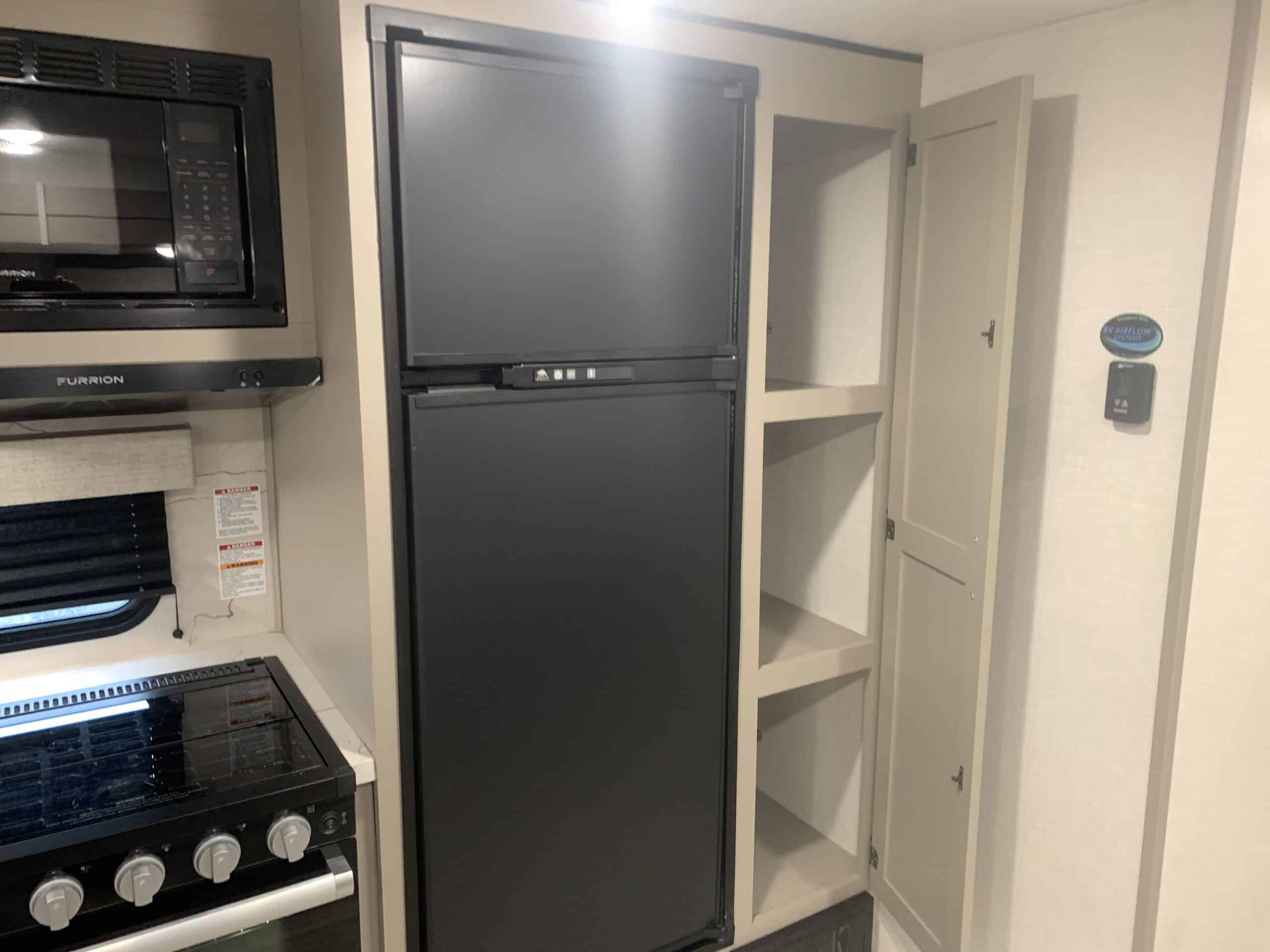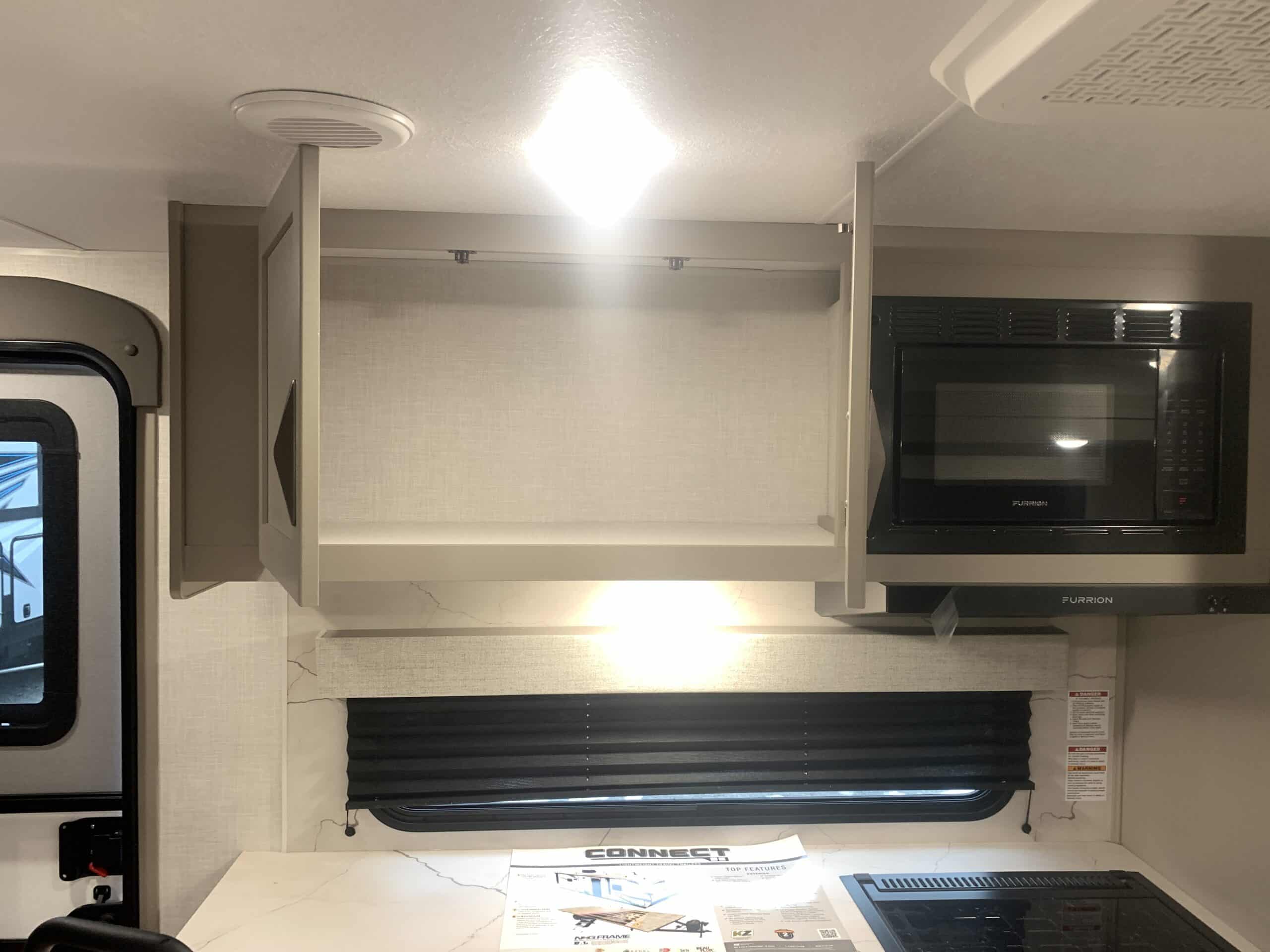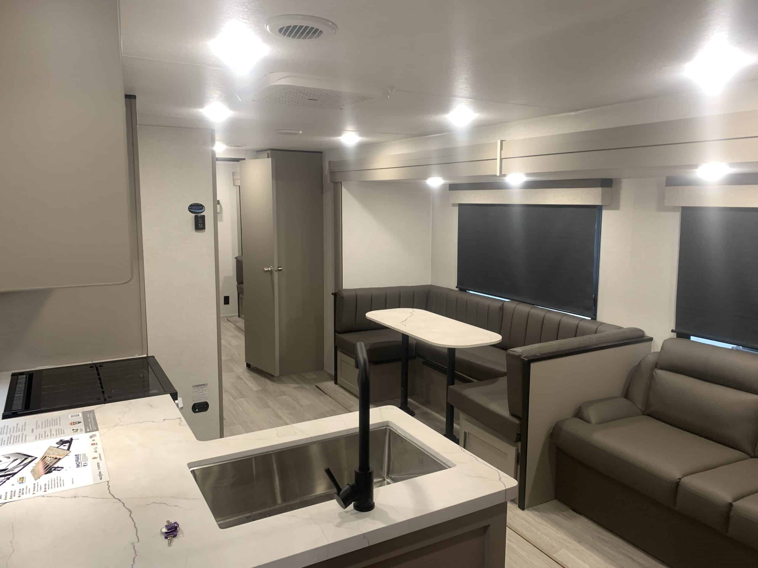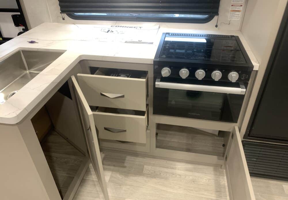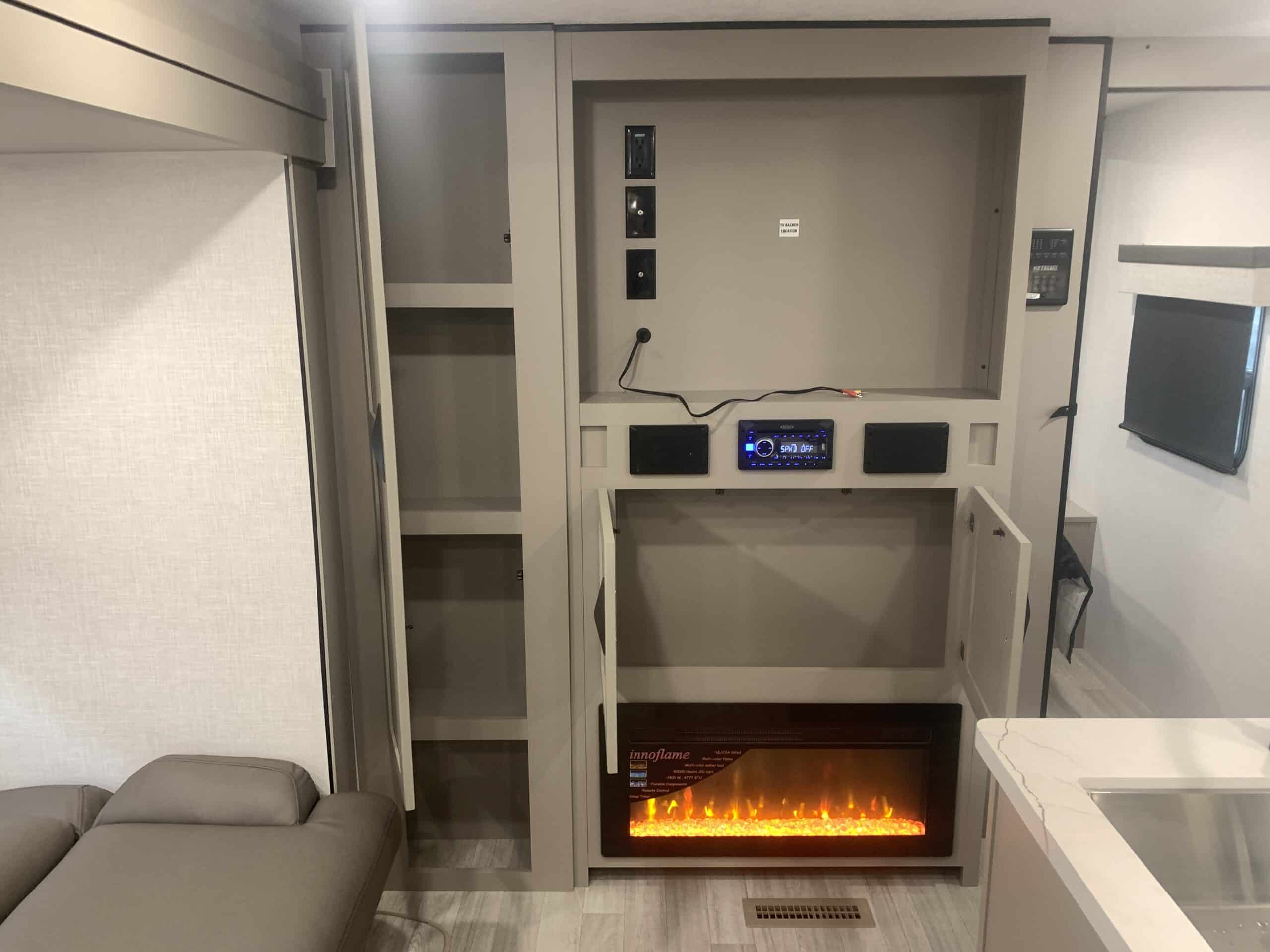 De plus, la Connect 312BHKSE a un air climatisé de 13500 btu. qui tempérera  l’ambiance désirée. Aussi, la cuisine a un poêle avec 3 brûleurs, un micro-ondes et un réfrigérateur 8p.c. gaz/électrique. Également une banquette, un sofa lit et un garde-manger. Enfin, le système audio vous permettra d’écouter votre musique préférée.