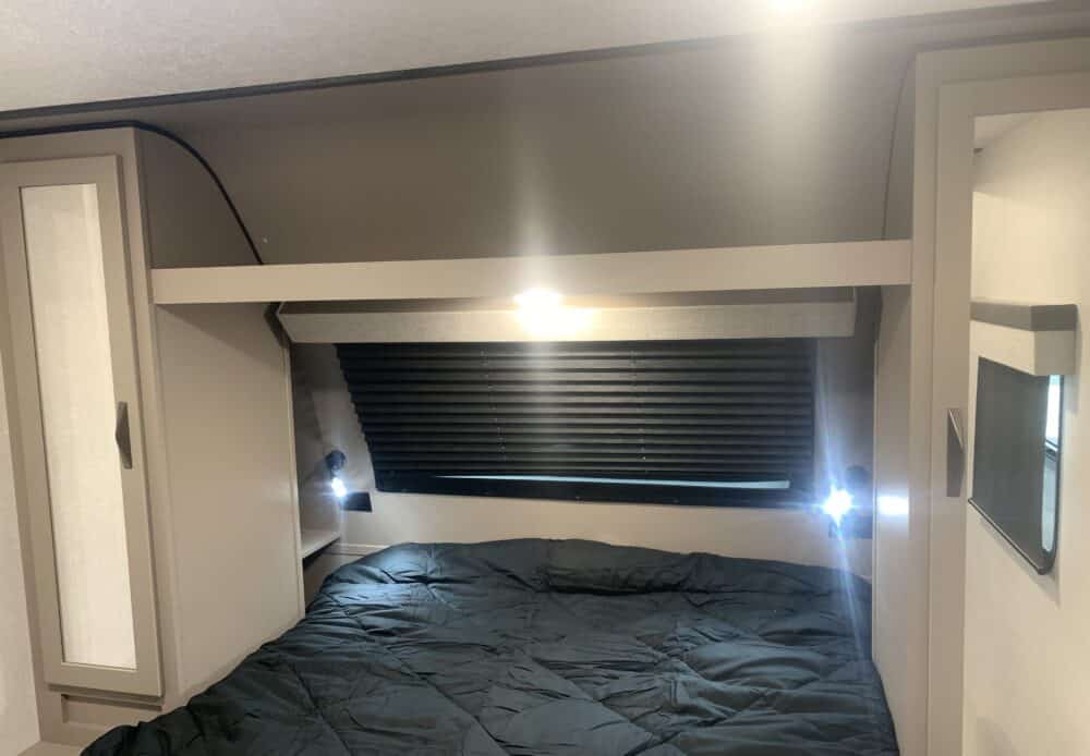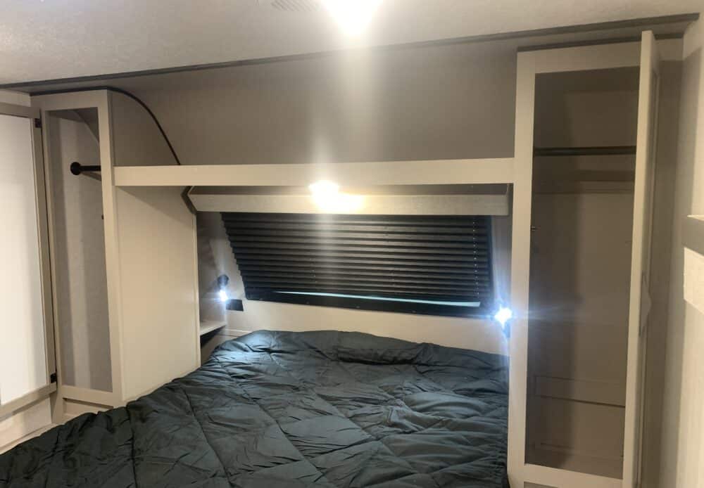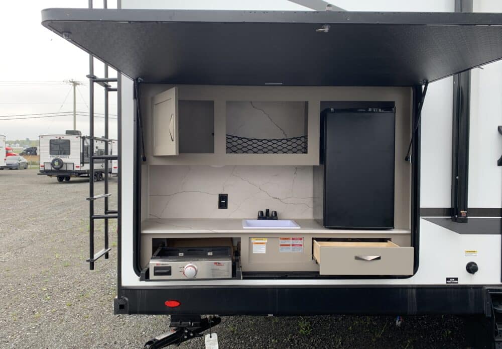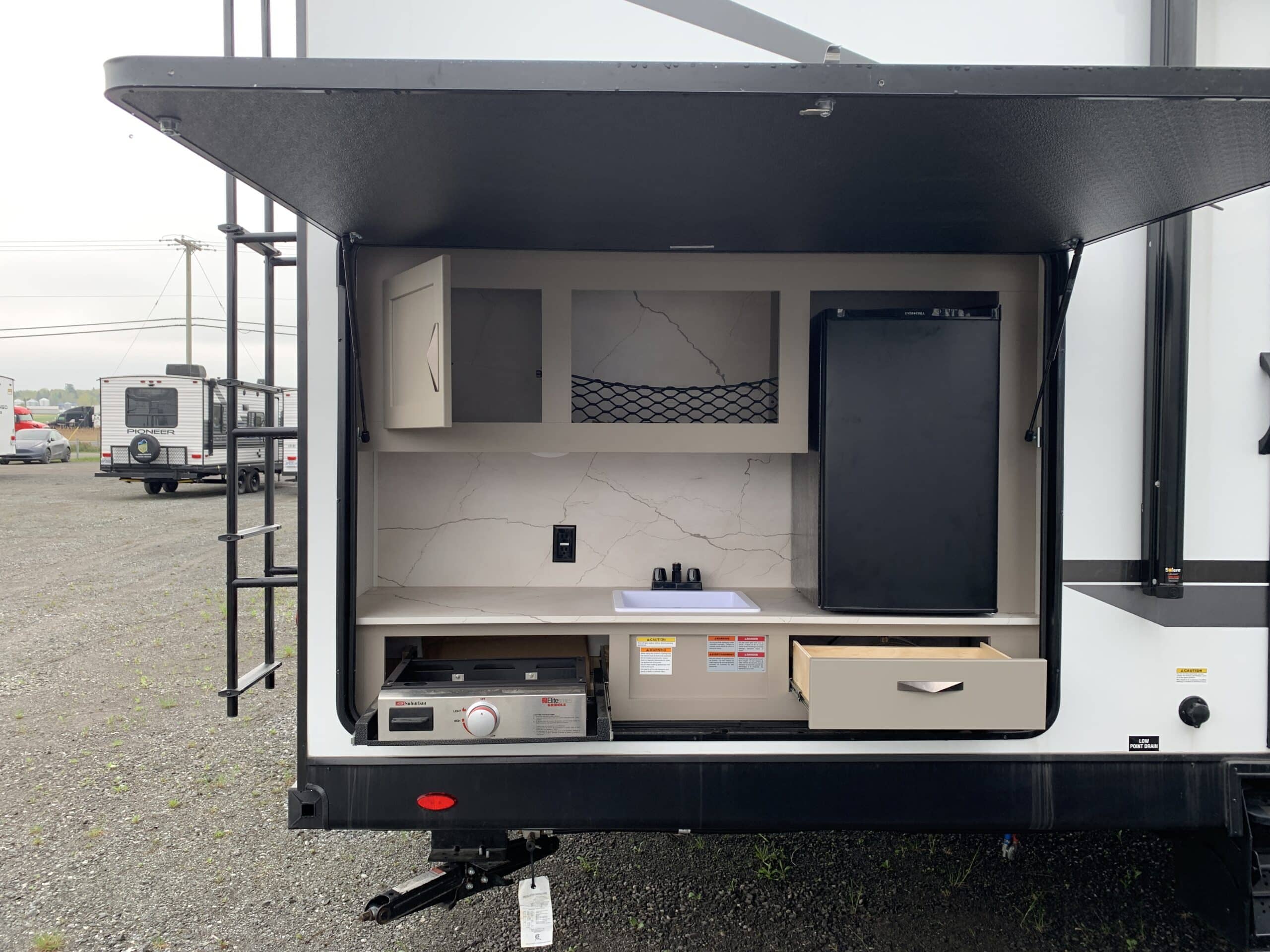 D’abord, cette roulotte a une auvent de 19 pieds, une cuisine et une douche pour profiterez de l’extérieur sans soucis. Puisque ses marches sont ajustable et très stable vous aurez un accès facile à l’intérieur. Les coffres ont également un bel espace de rangement.