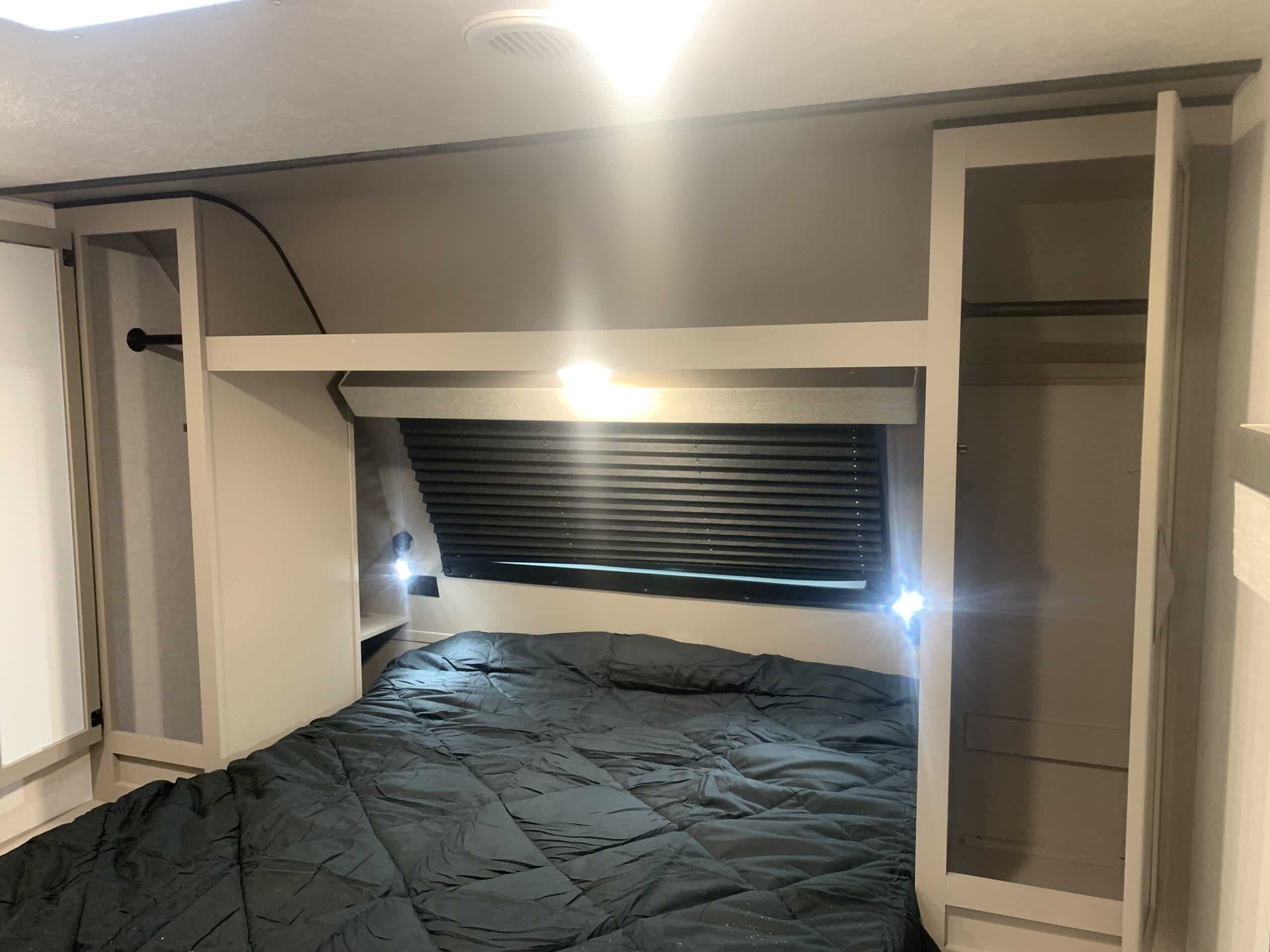Chambre principale fermée avec un lit queen et des penderies de chaque côté.