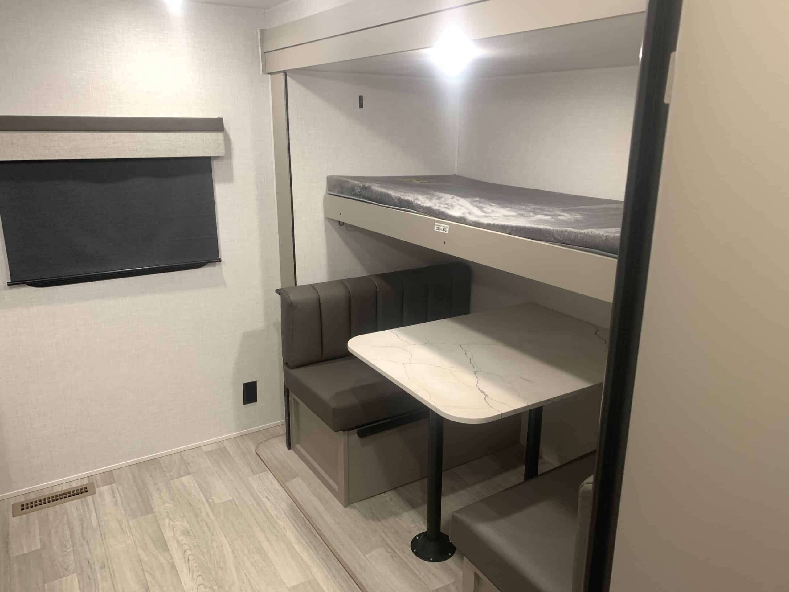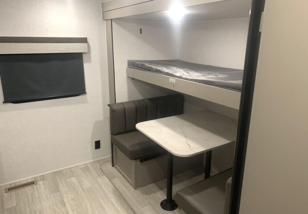 La chambre fermée pour les enfants comprend 2 lits superposés et une table avec banquette. Les enfants y passeront des heures de plaisir.