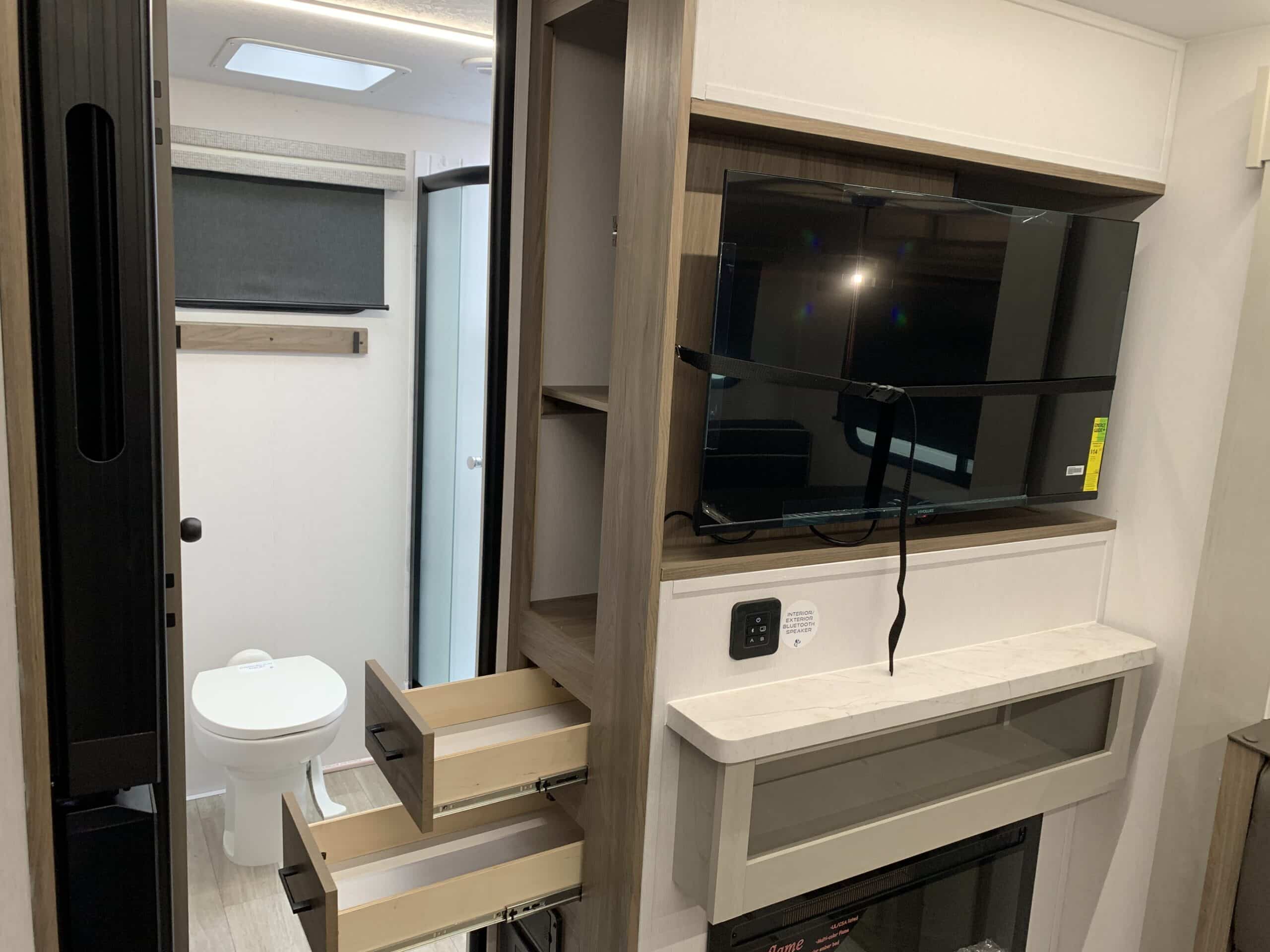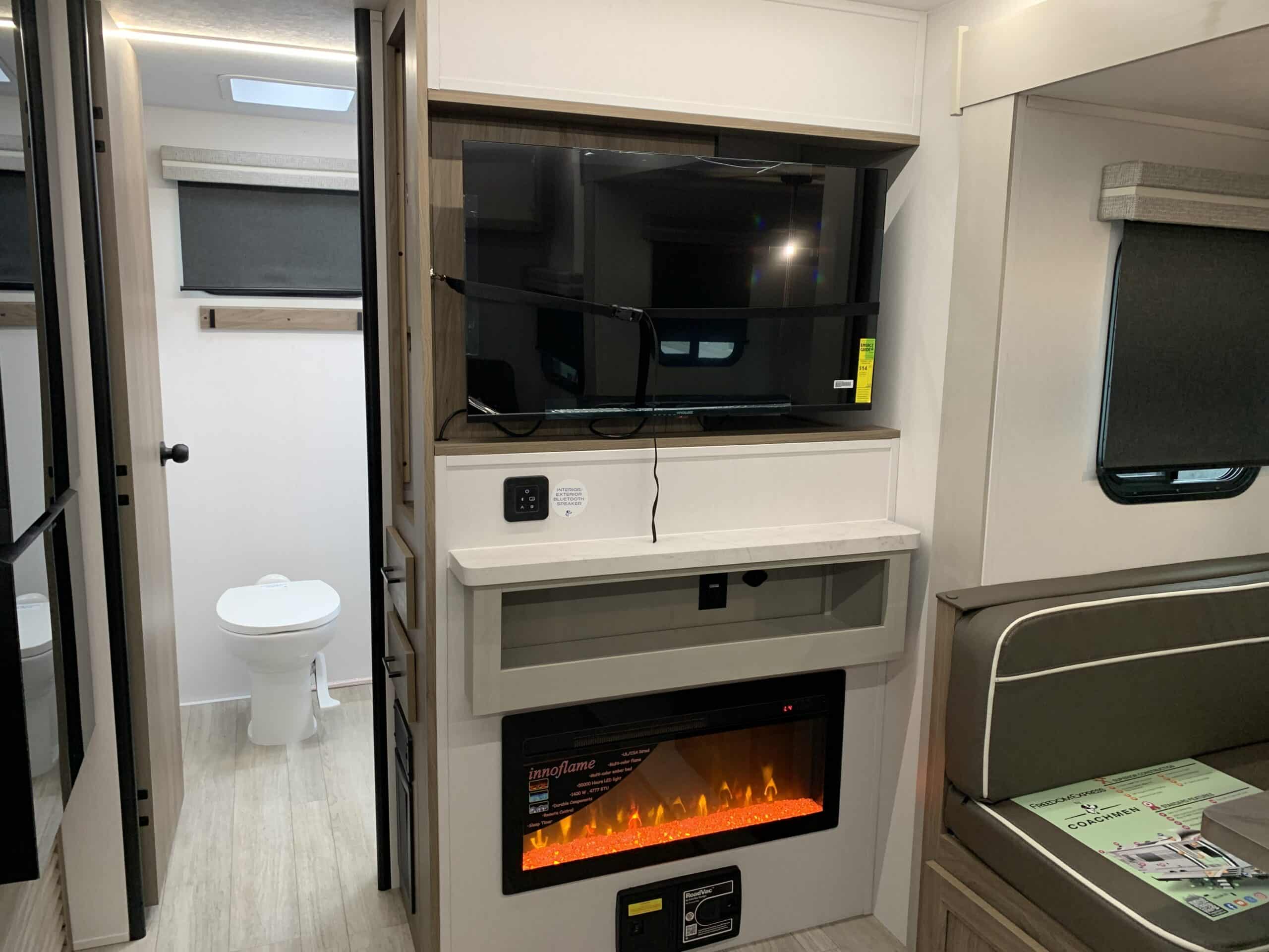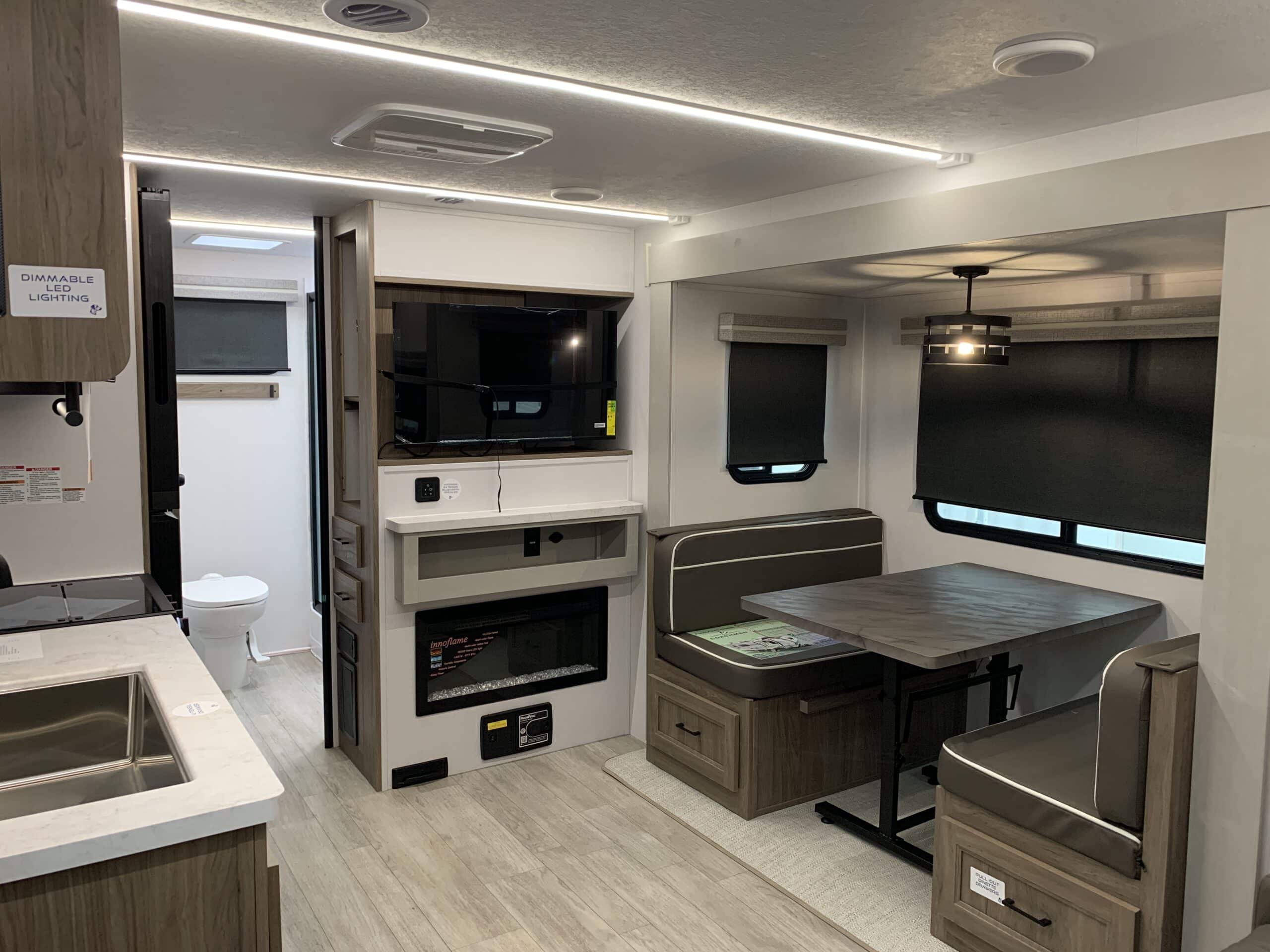 Son aménagement met l’accent sur un espace de vie central ouvert et une grande salle de bain arrière, ce qui la distingue de plusieurs modèles similaires.