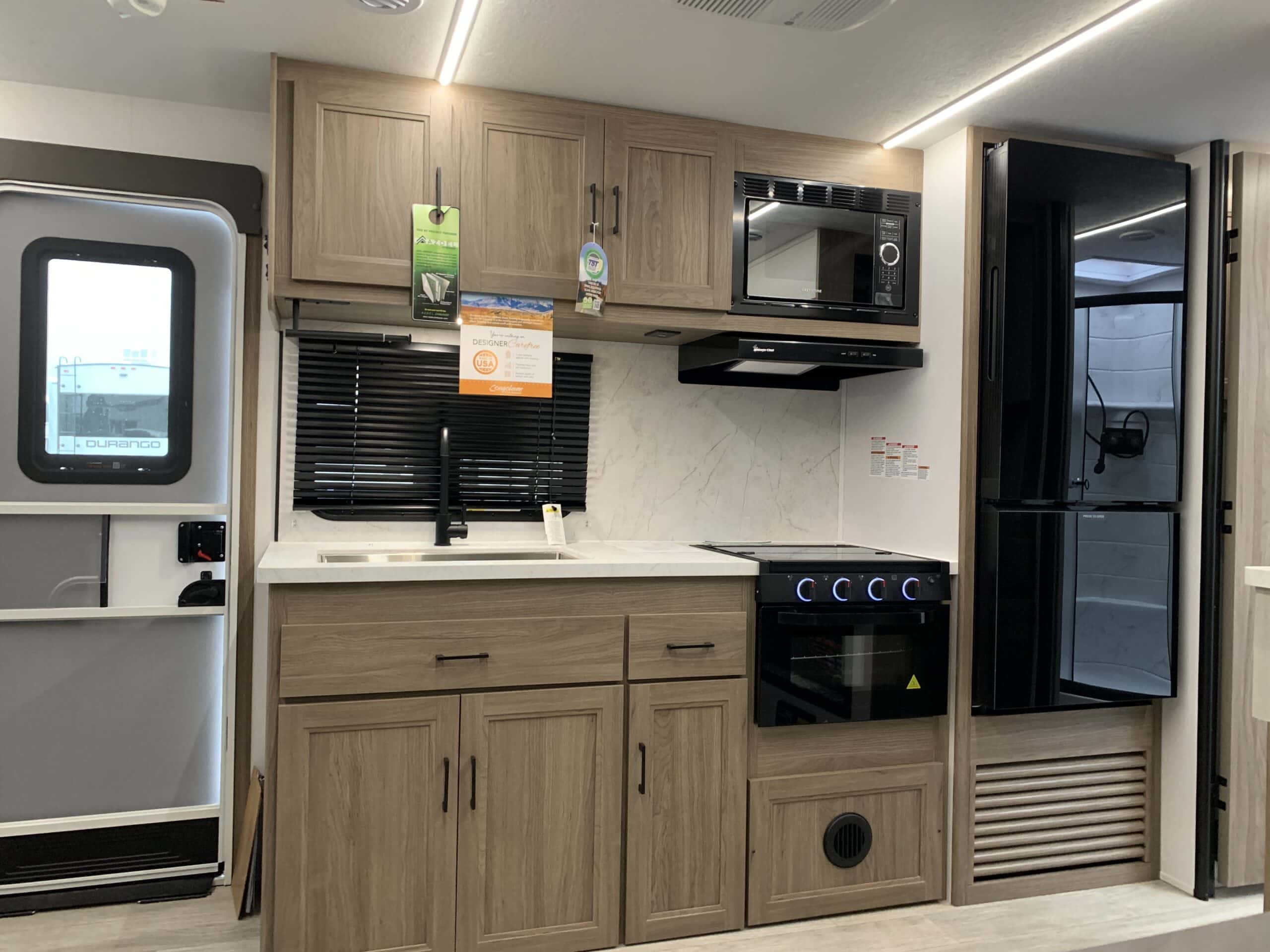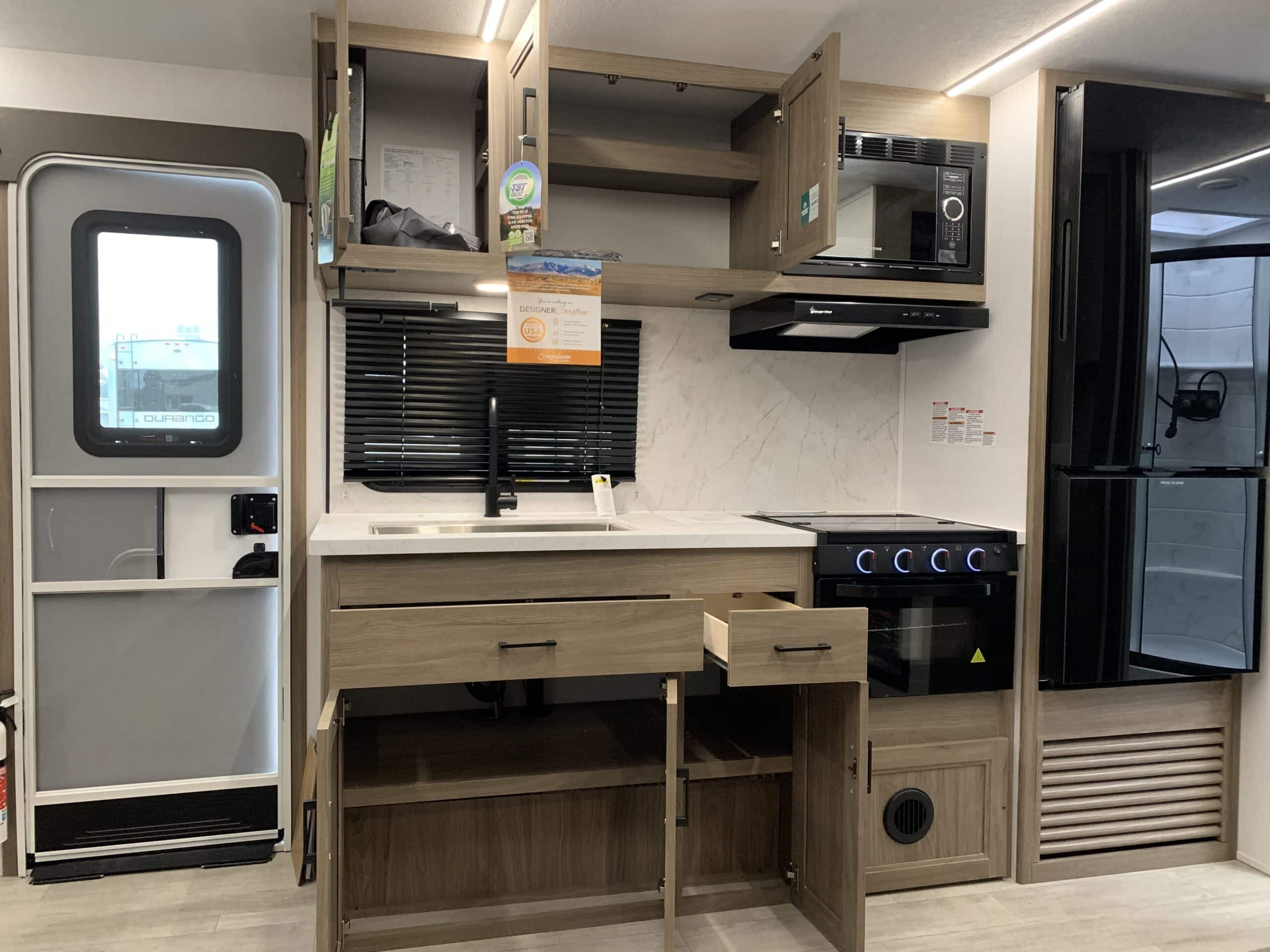 Cuisine complète avec cuisinière 3 ronds, micro-ondes, grand frigo 12V