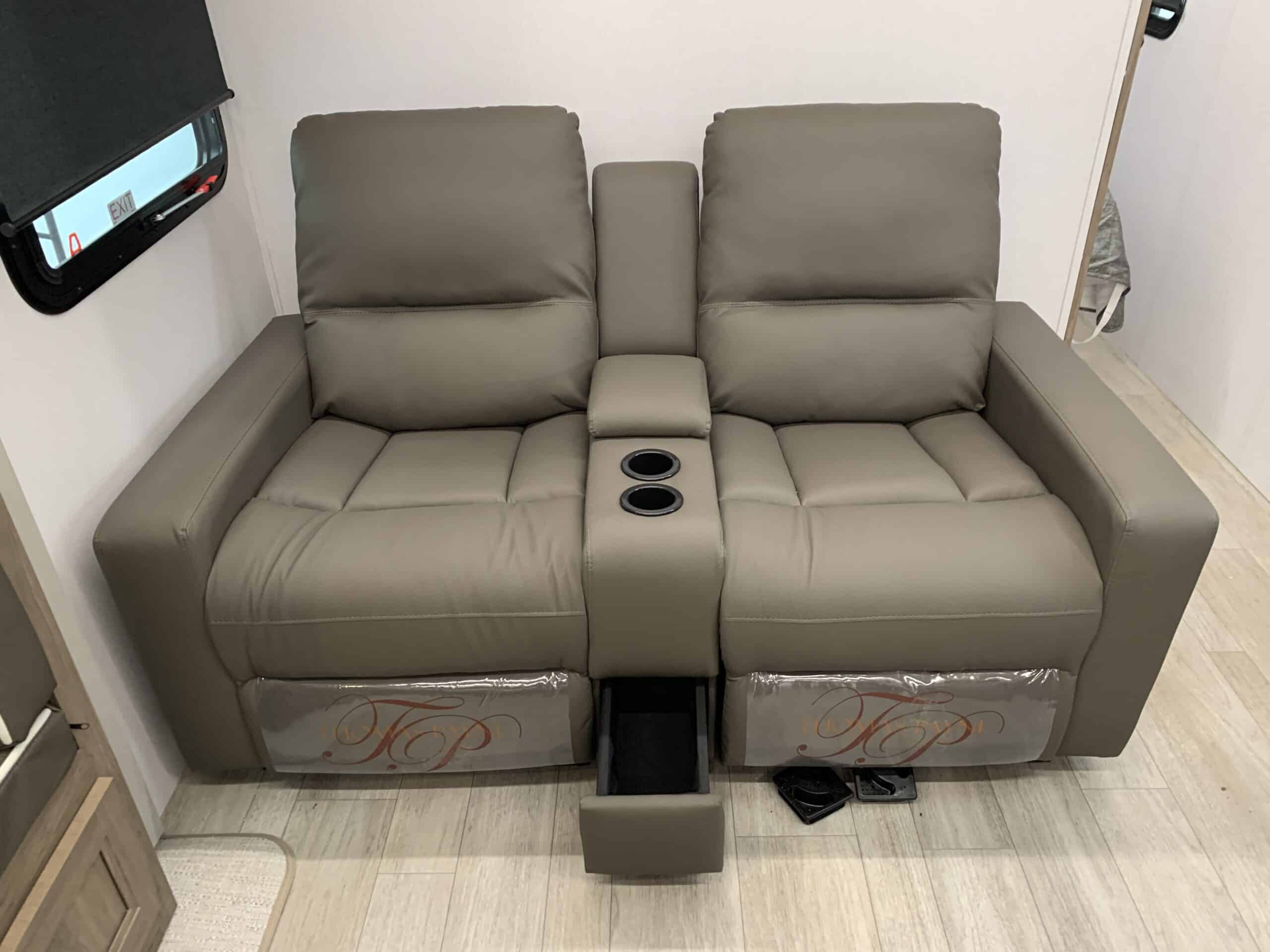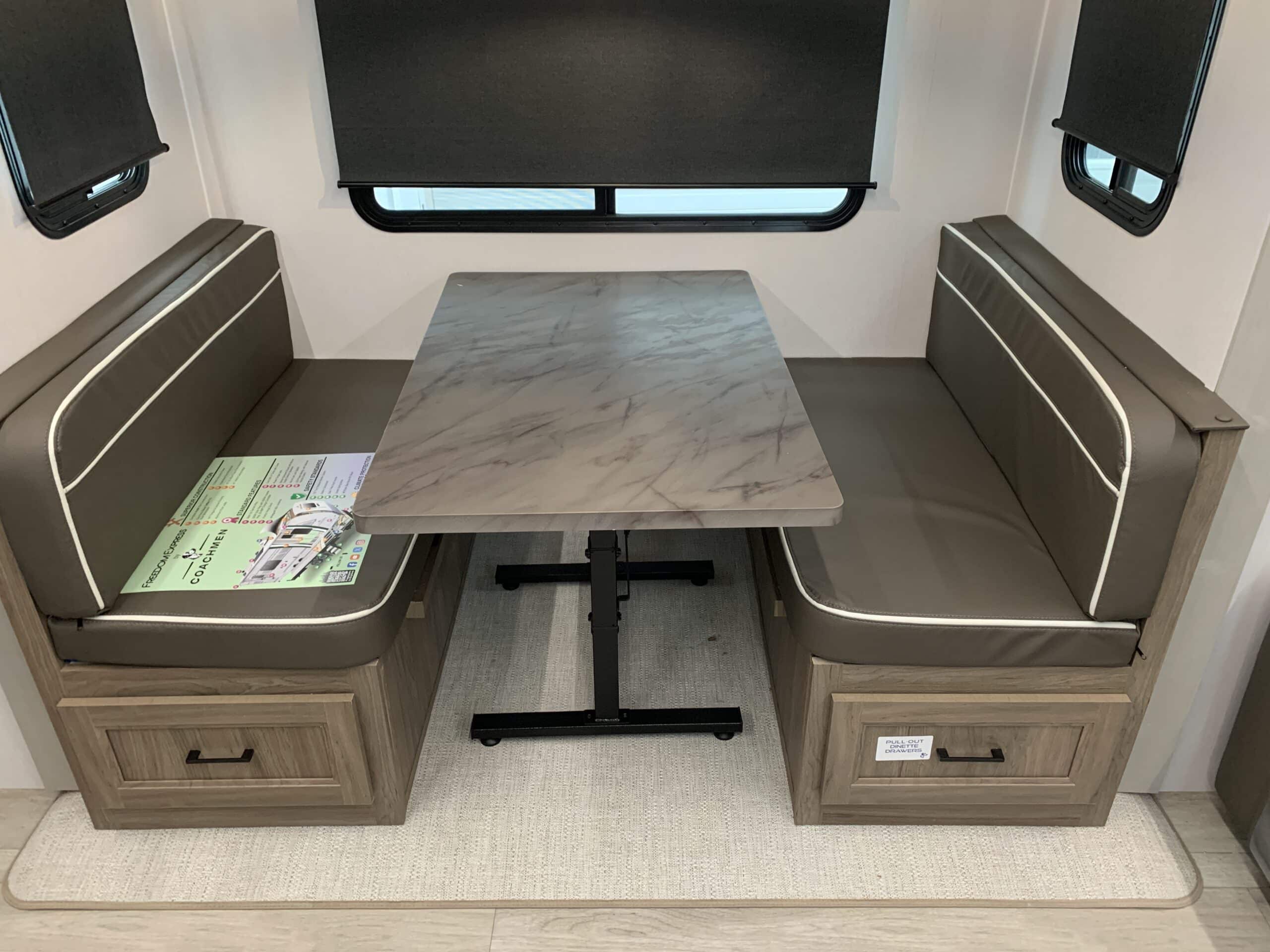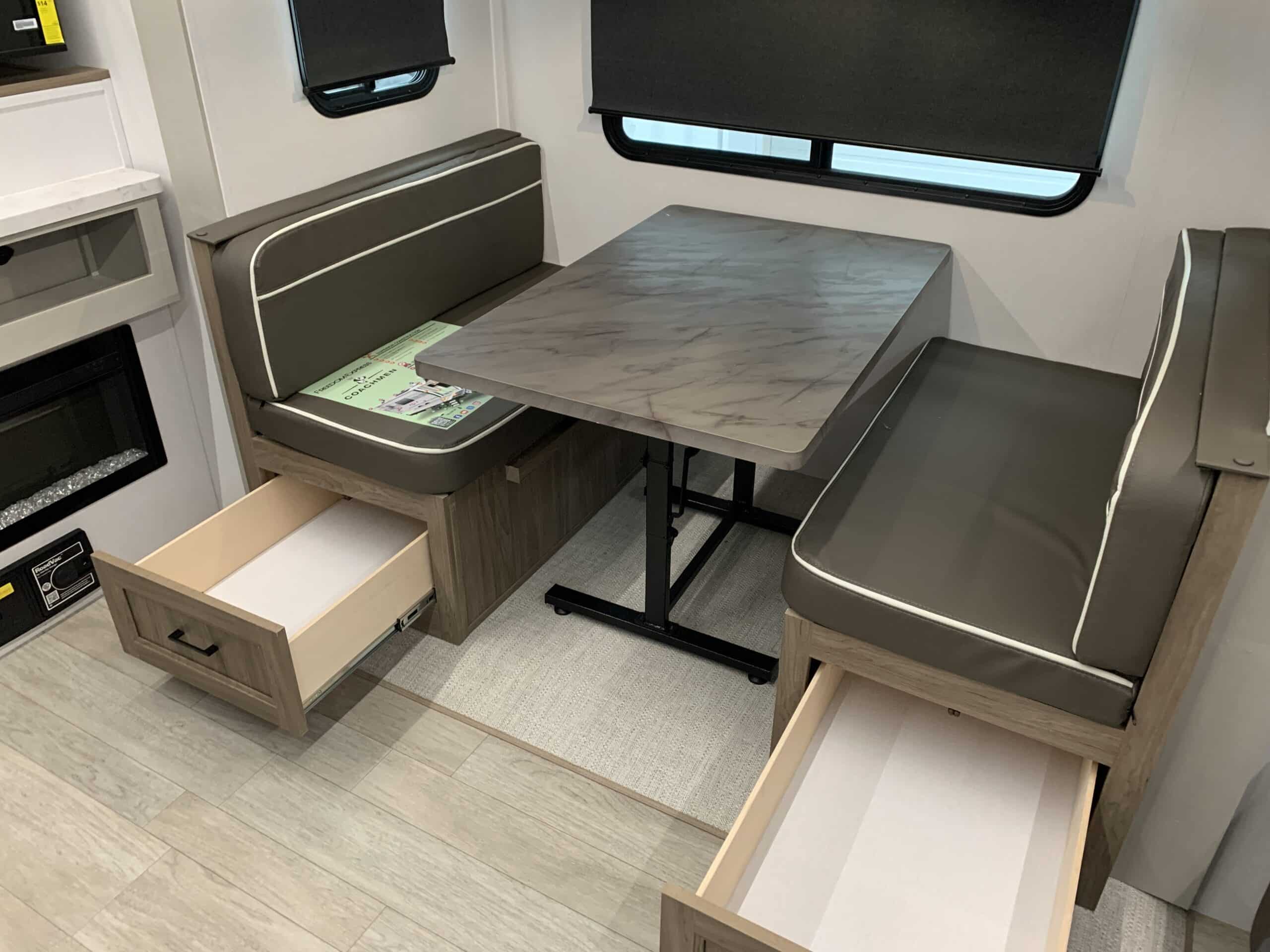 Salon central avec divan (convertible) et dinette dans un slide-out