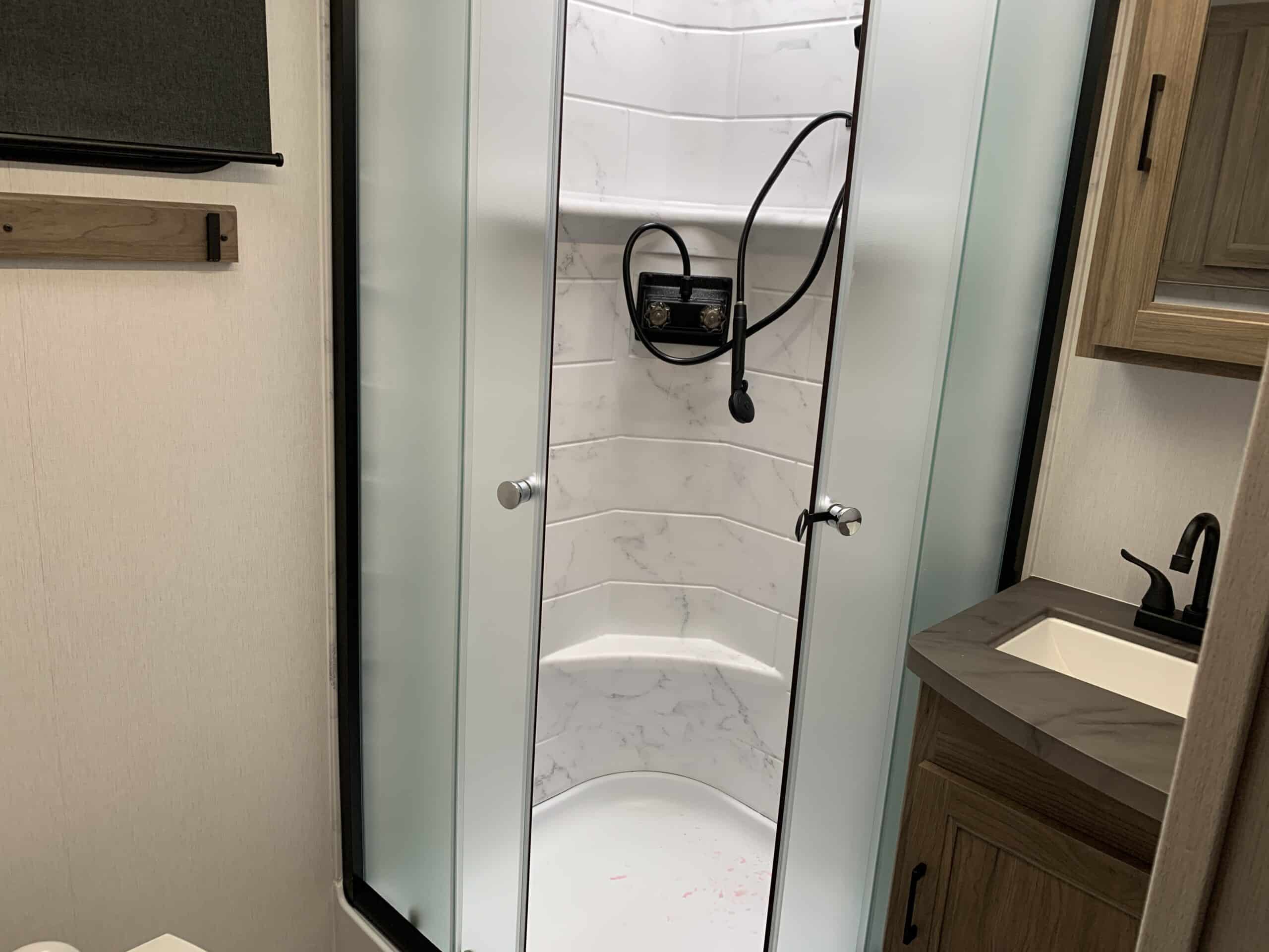 Salle de bain arrière spacieuse avec douche, toilette en porcelaine et rangement