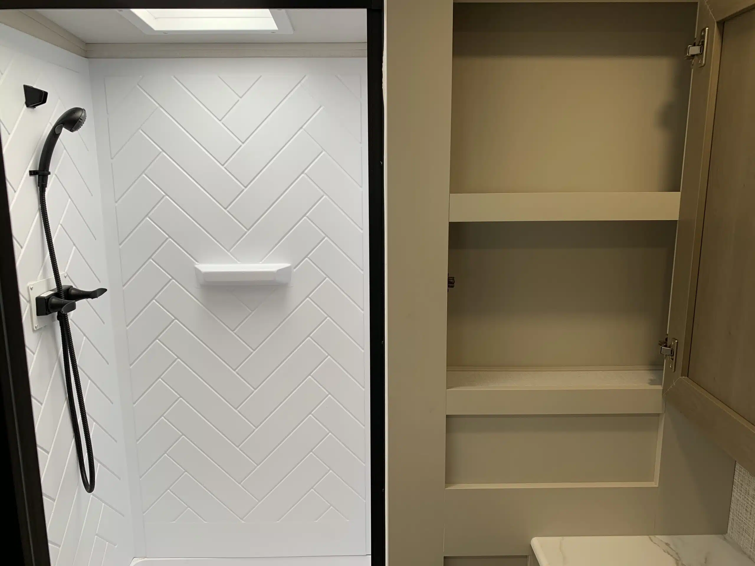 D’abord, cette roulotte a 2 auvents de 10 et 12 pieds, une cuisine et une douche pour profiterez de l’extérieur sans soucis. Aussi muni d’une prise 50 ampères pour une meilleure qualité de courant et d’un panneau solaire. Puisque ses marches sont ajustables et très stables vous aurez un accès facile à l’intérieur. Les coffres ont un bel espace de rangement.