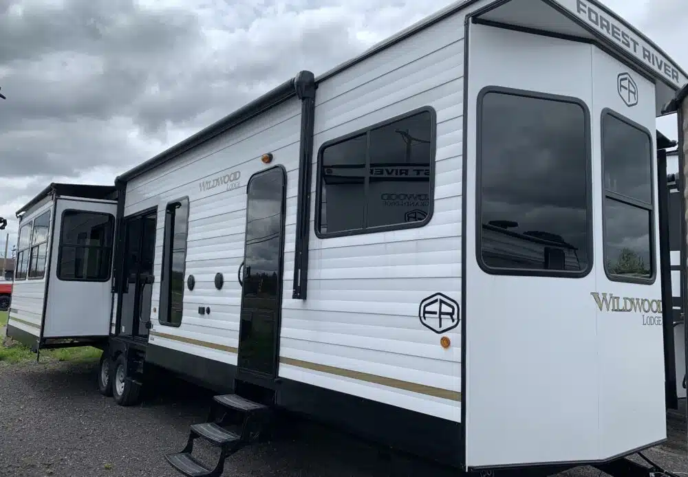 2026 Wildwood 40RLB, roulotte stationnaire pour couple de 43 pieds à 11521 lbs avec 2 essieux, extérieur en aluminium et 3 extensions.