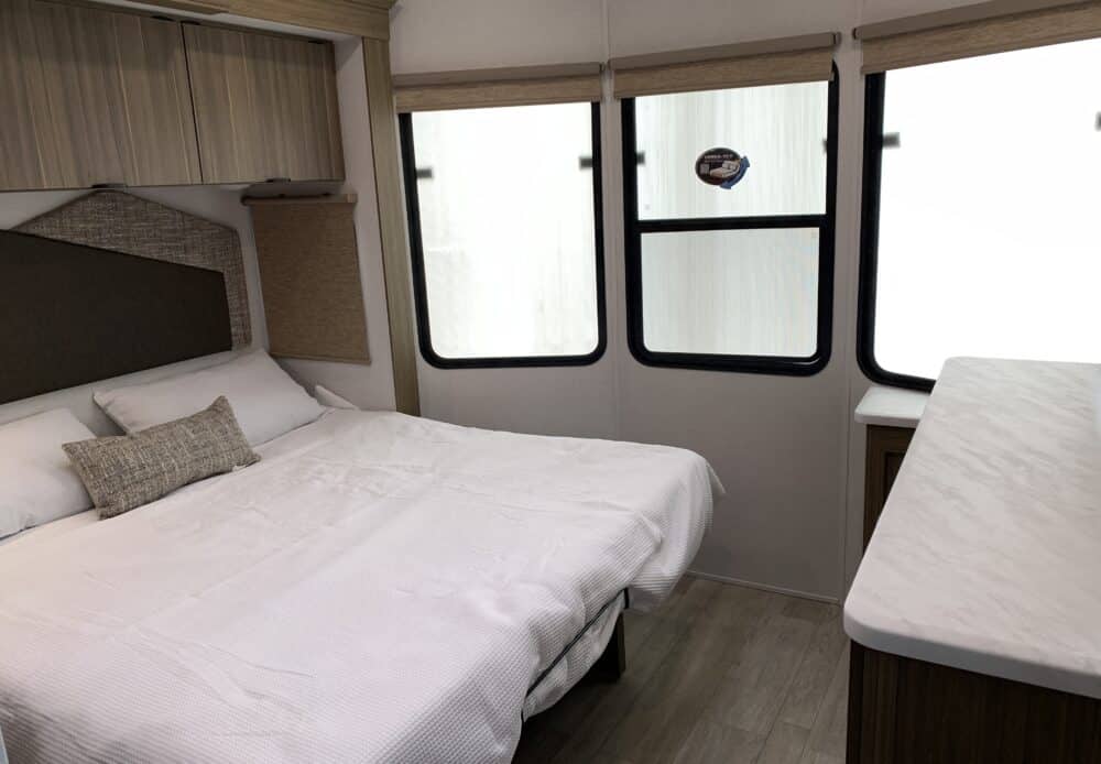 De plus, la Wildwood 40RLB a un air climatisés de 15000 btu. et un foyer qui tempéreront l’ambiance désirée. Par ailleurs, la cuisine a un micro-ondes, un poêle avec four et 3brûleurs et un réfrigérateur 12 volts. Vous trouverez également un comptoir lunch avec 2 bancs, une table avec 4 chaises, un garde-manger et un grand rangement derrière la Tv. Enfin le système audio vous permettra d’écouter votre musique préférée.