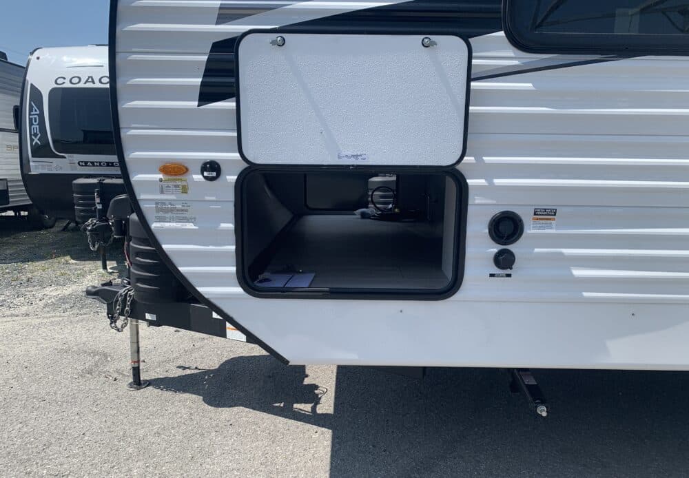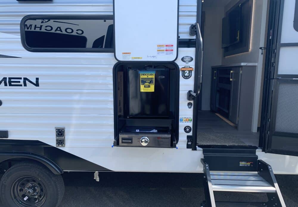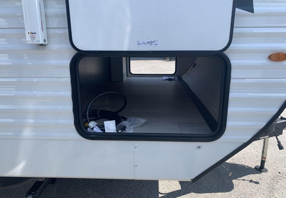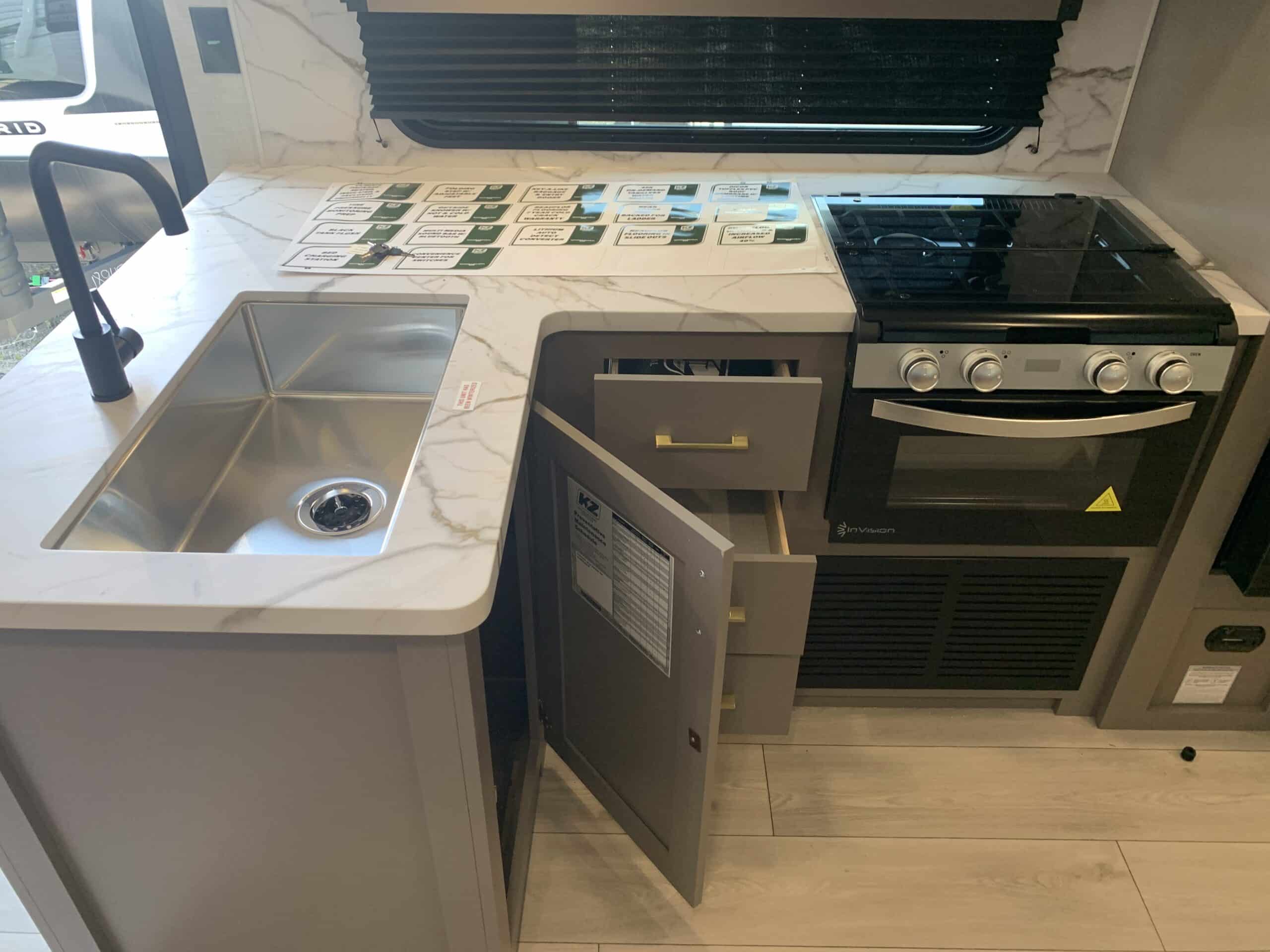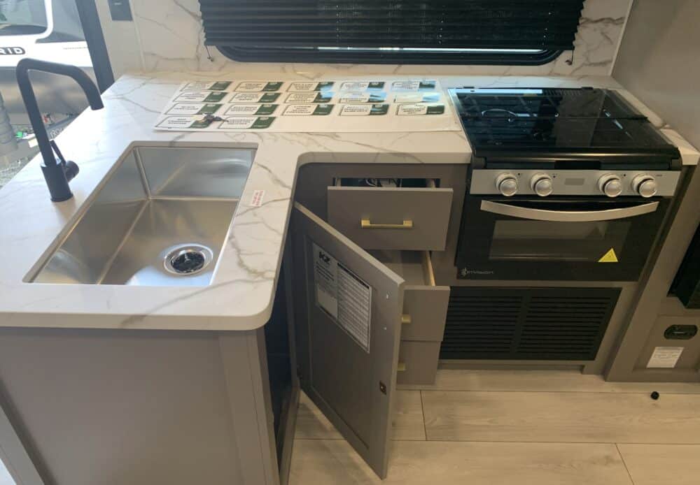 D’abord, cette roulotte a un auvent de 18 pieds, une petite cuisine et son grill pour profiter de l’extérieur sans soucis. Puisque ses marches sont ajustables et très stables vous aurez un accès facile à l’intérieur. Aussi, elle est pré-filé pour panneau solaire et caméra de recul. Les coffres ont un bel espace de rangement.