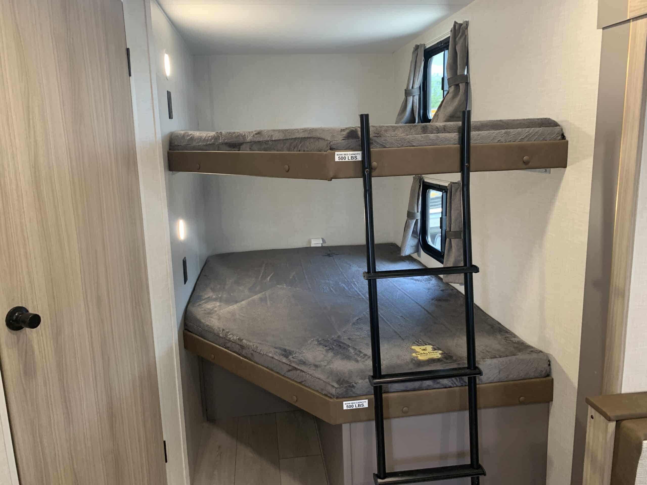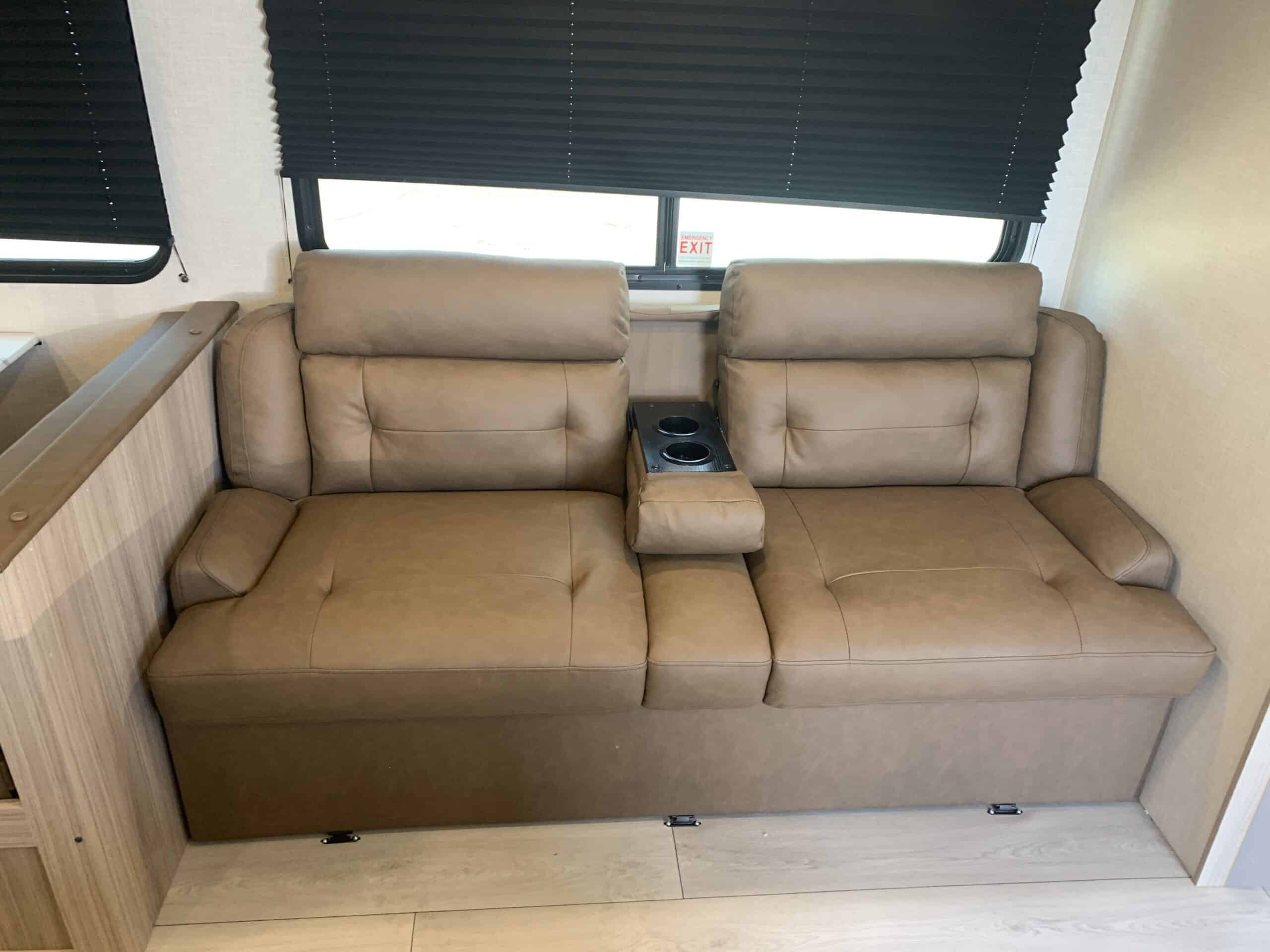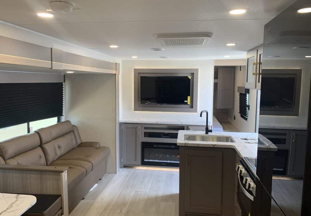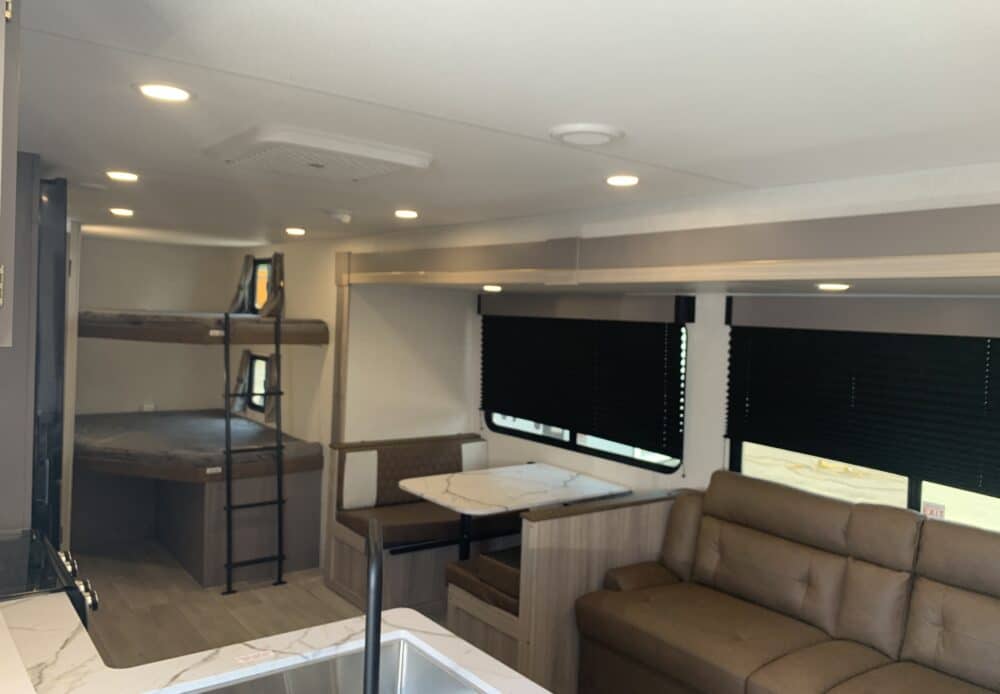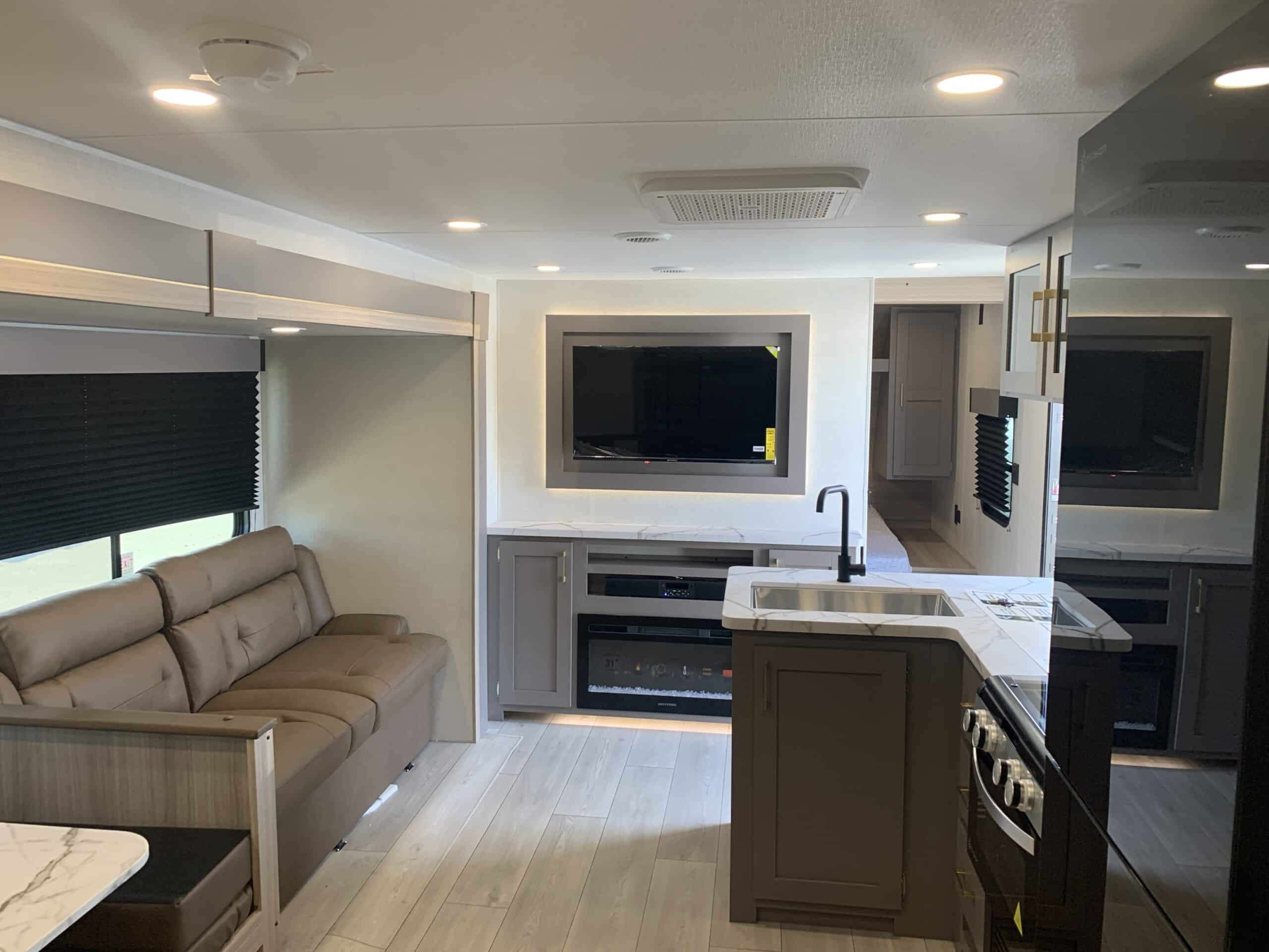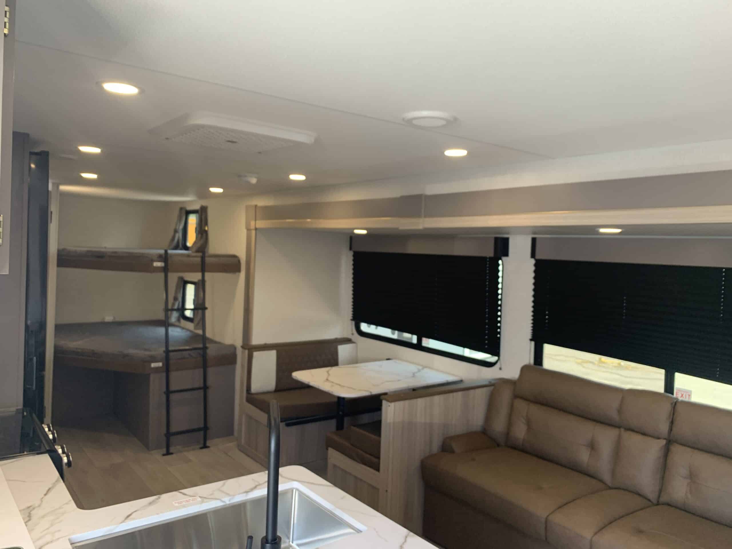 De plus la Sportsmen 261BHKSE a 2 airs climatisés de 15000 btu et un foyer pour tempérer l’ambiance désirée. Par ailleurs, la cuisine a un micro-ondes, un poêle avec dessus en verre et un réfrigérateur de 12 volts. Aussi une banquette et un sofa situé dans l’extension se transforment en lit. Une armoire-penderie pour faciliter le rangement. Enfin la radio et ses haut-parleurs vous permettront de relaxer en écoutant votre musique préférée.