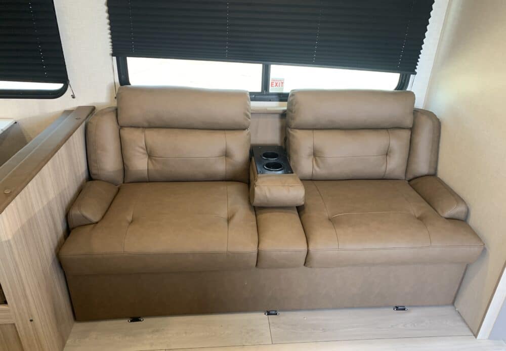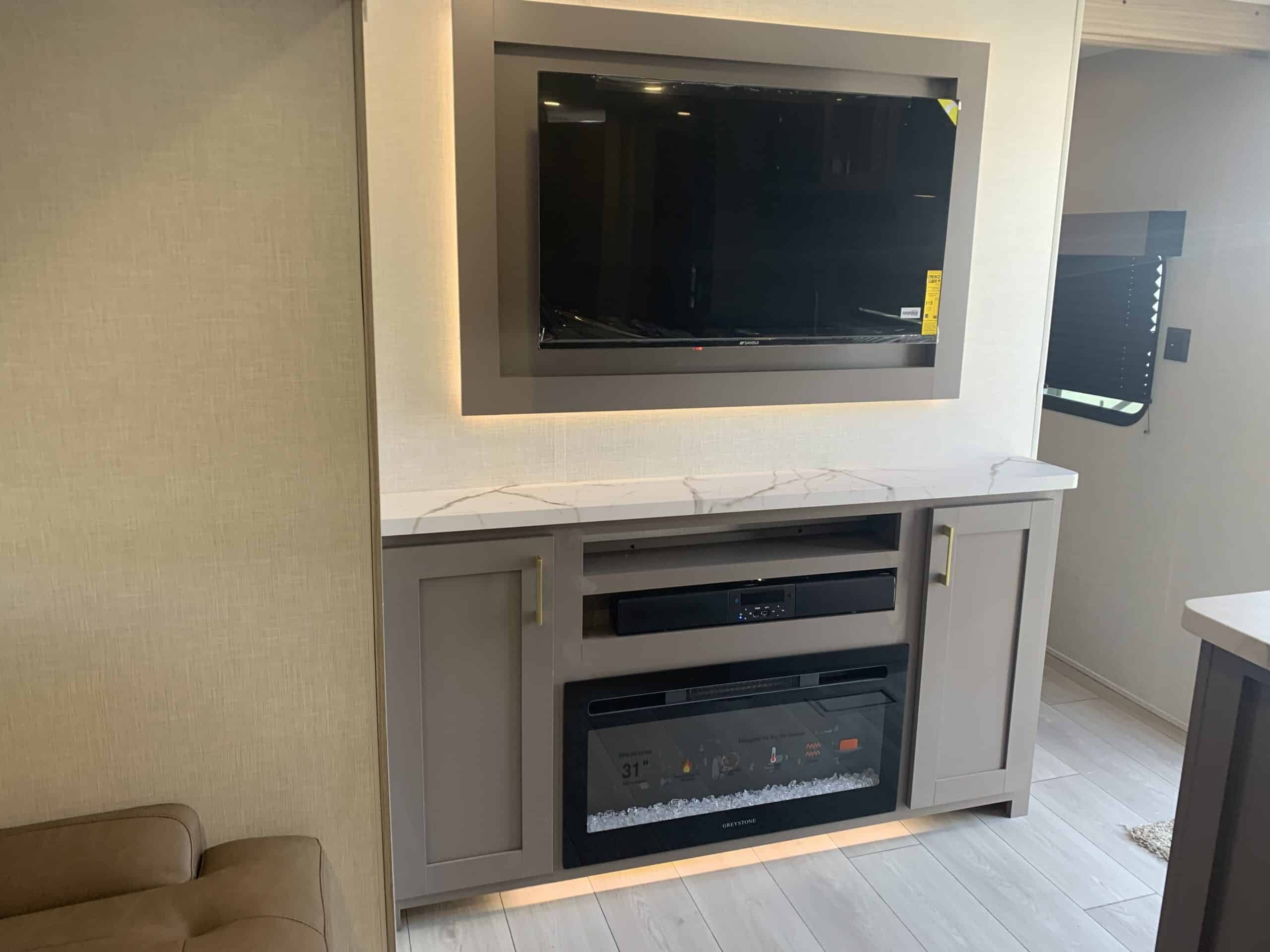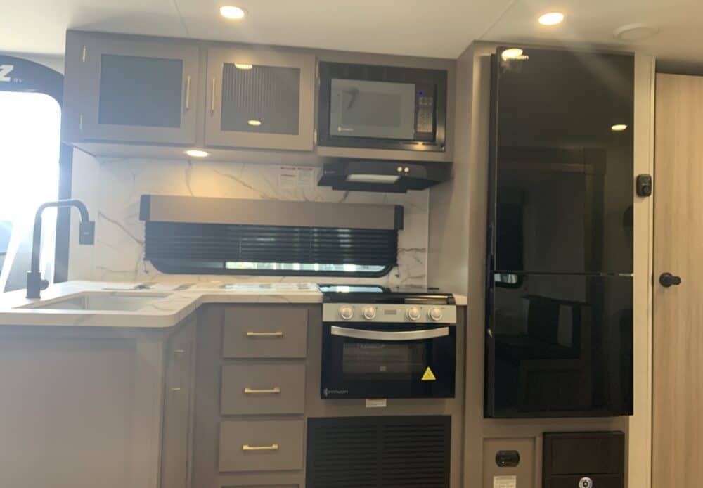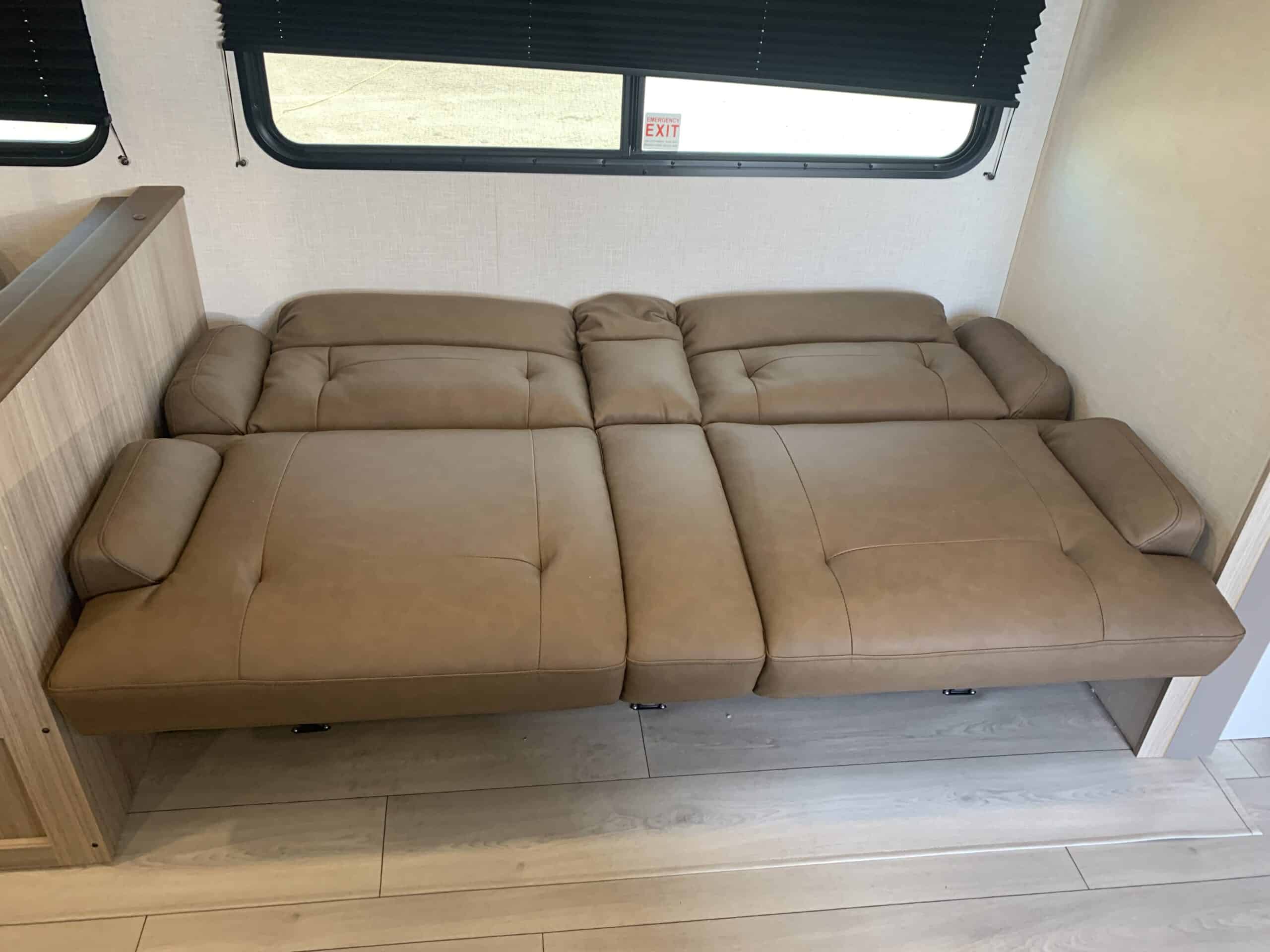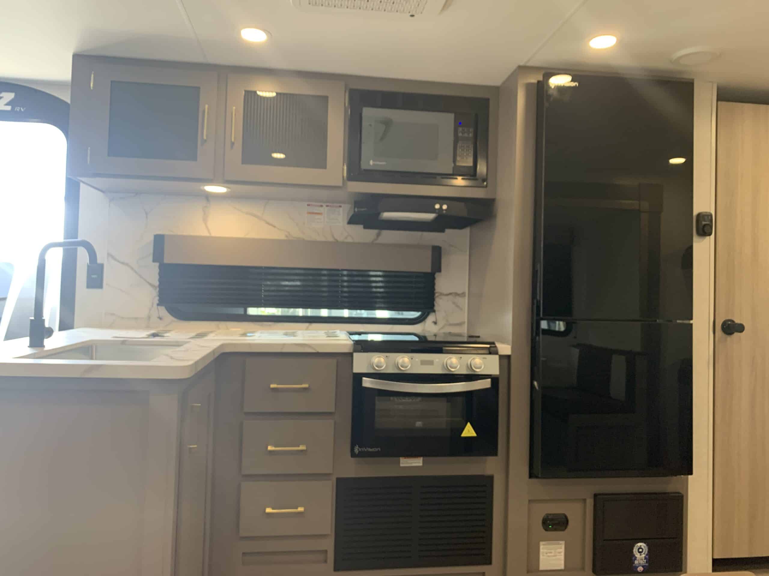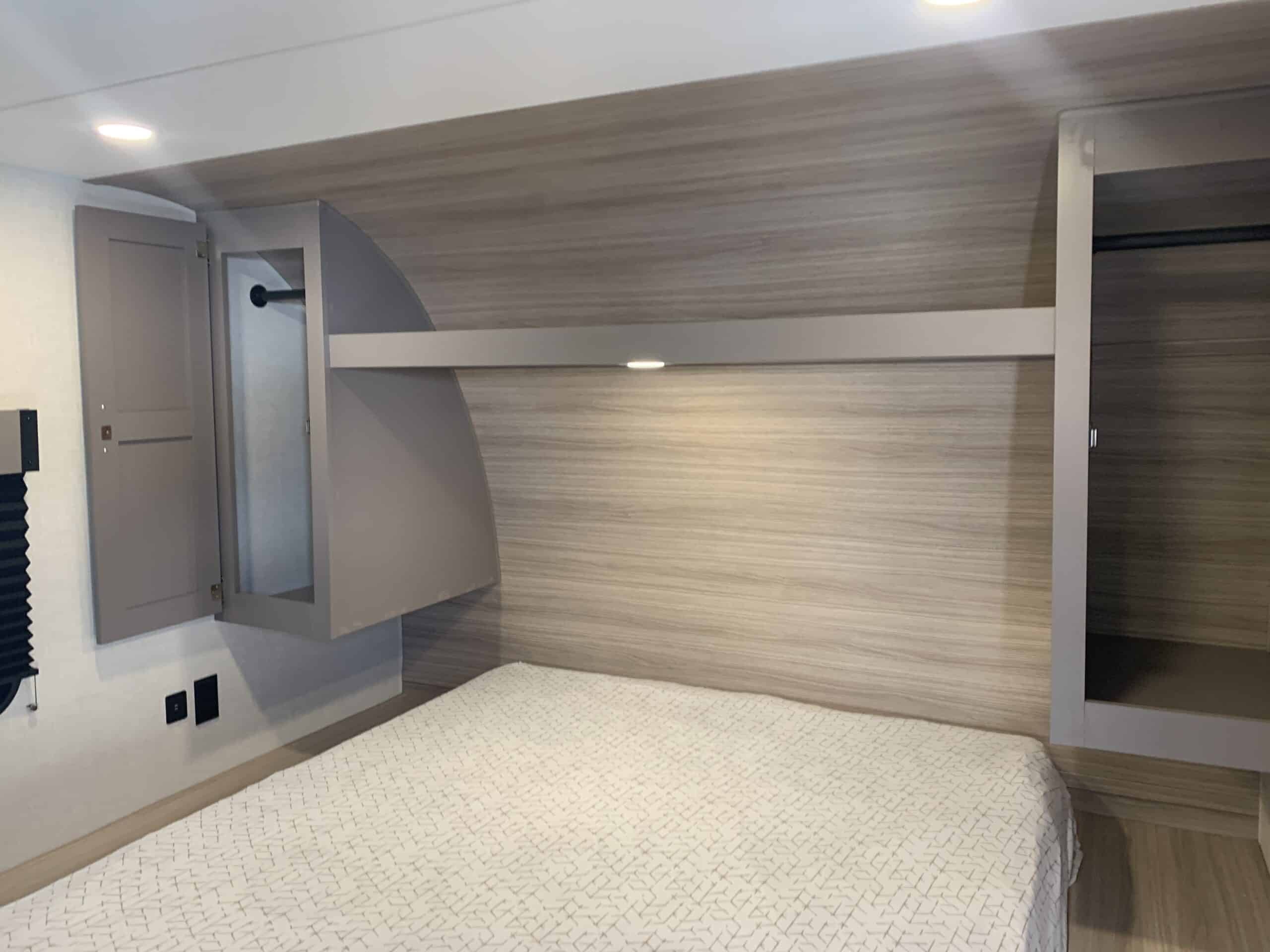 De plus la Sportsmen 261BHKSE a 2 airs climatisés de 15000 btu et un foyer pour tempérer l’ambiance désirée. Par ailleurs, la cuisine a un micro-ondes, un poêle avec dessus en verre et un réfrigérateur de 12 volts. Aussi une banquette et un sofa situé dans l’extension se transforment en lit. Une armoire-penderie pour faciliter le rangement. Enfin la radio et ses haut-parleurs vous permettront de relaxer en écoutant votre musique préférée.
