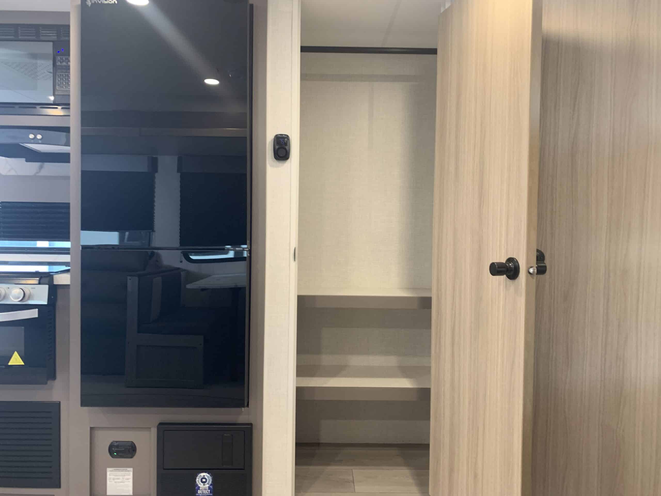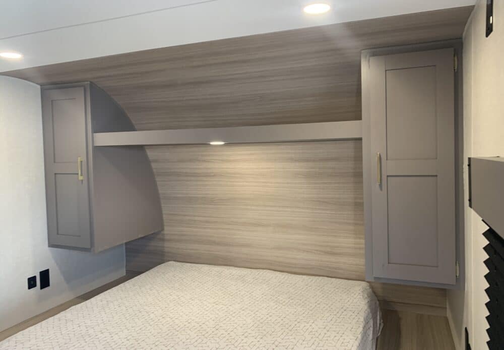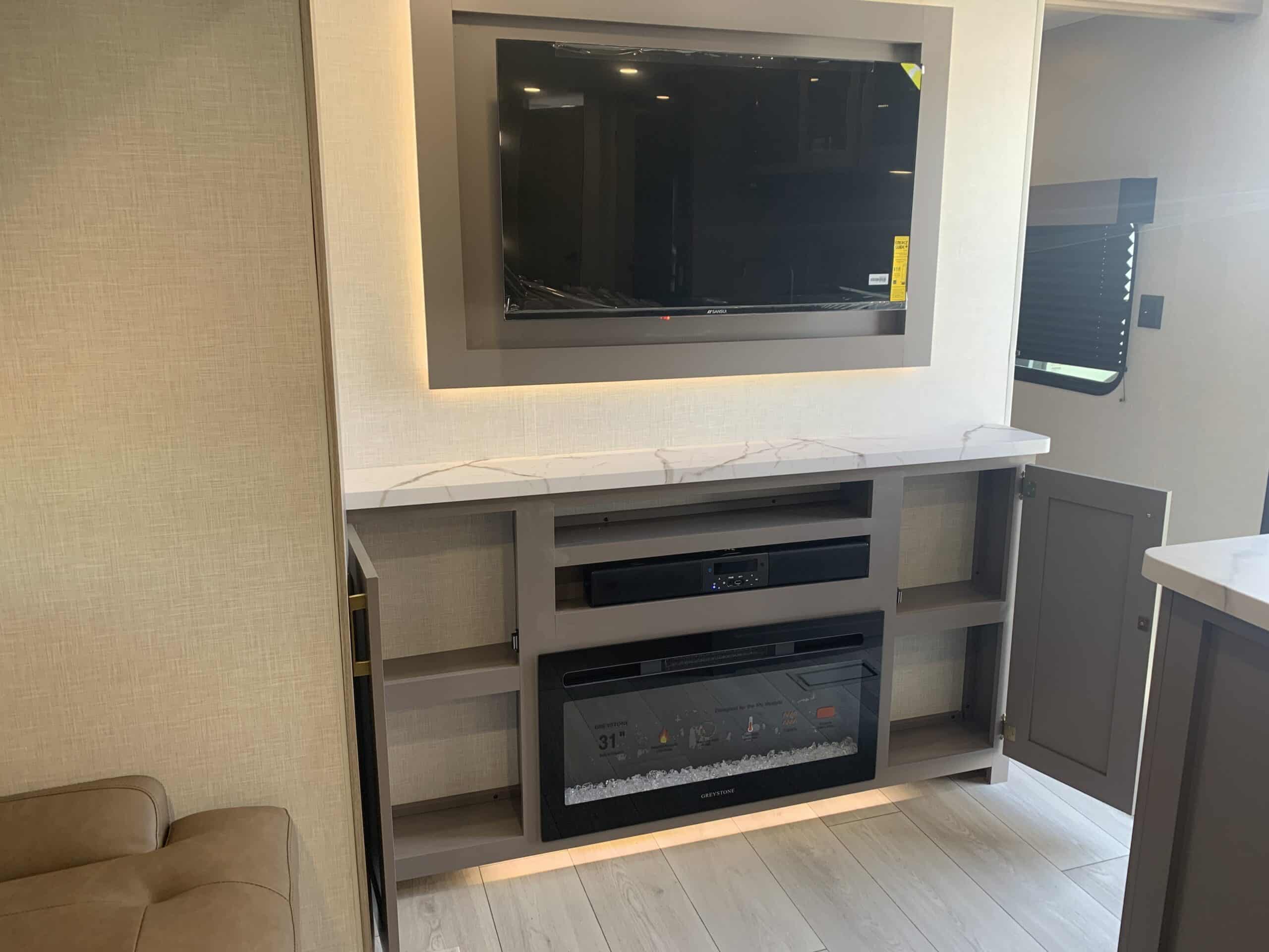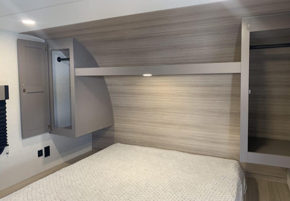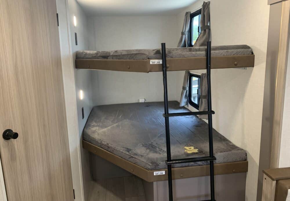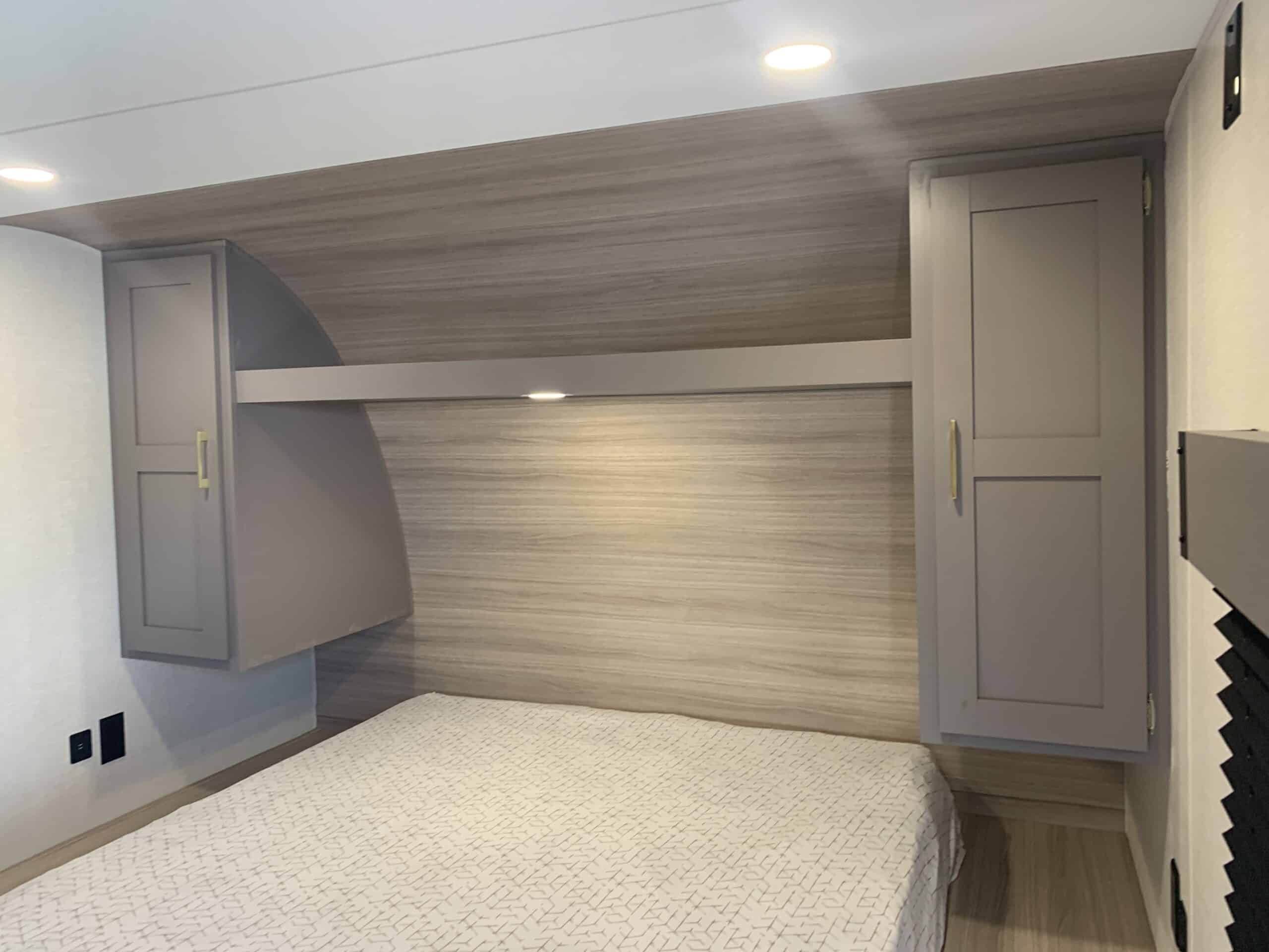 De plus la Sportsmen 261BHKSE a 2 airs climatisés de 15000 btu et un foyer pour tempérer l’ambiance désirée. Par ailleurs, la cuisine a un micro-ondes, un poêle avec dessus en verre et un réfrigérateur de 12 volts. Aussi une banquette et un sofa situé dans l’extension se transforment en lit. Une armoire-penderie pour faciliter le rangement. Enfin la radio et ses haut-parleurs vous permettront de relaxer en écoutant votre musique préférée.