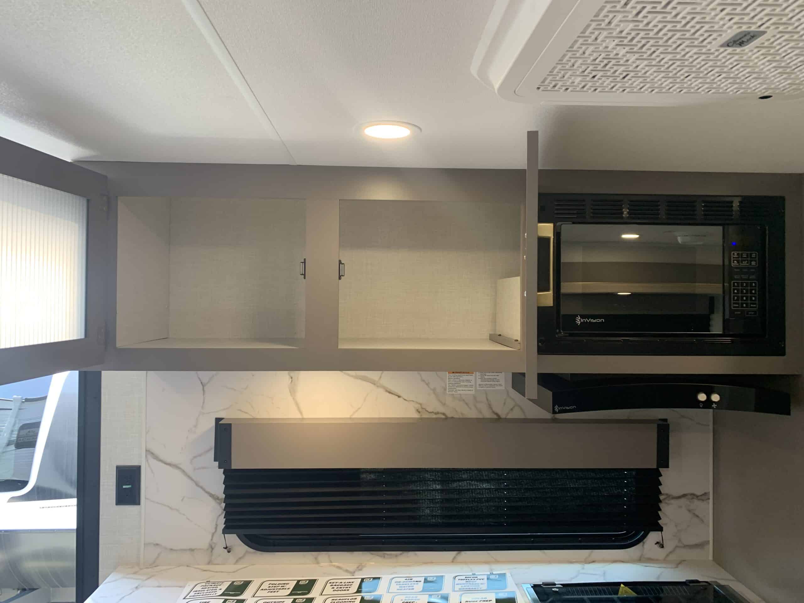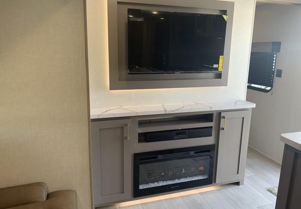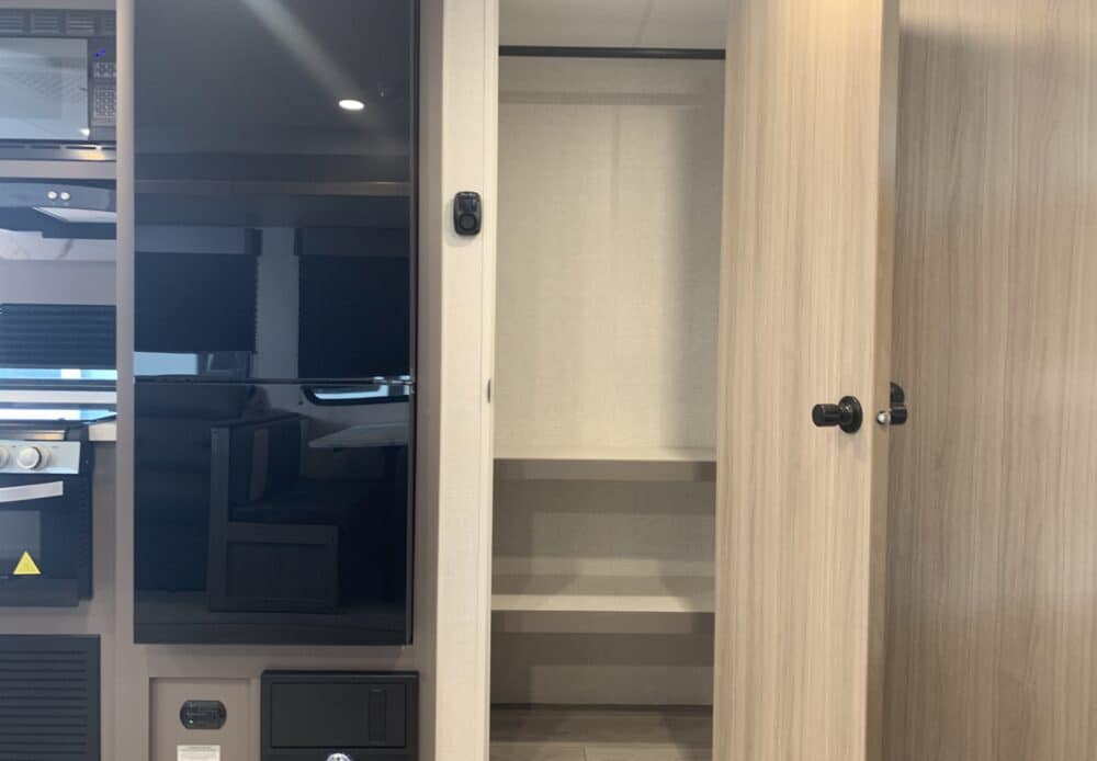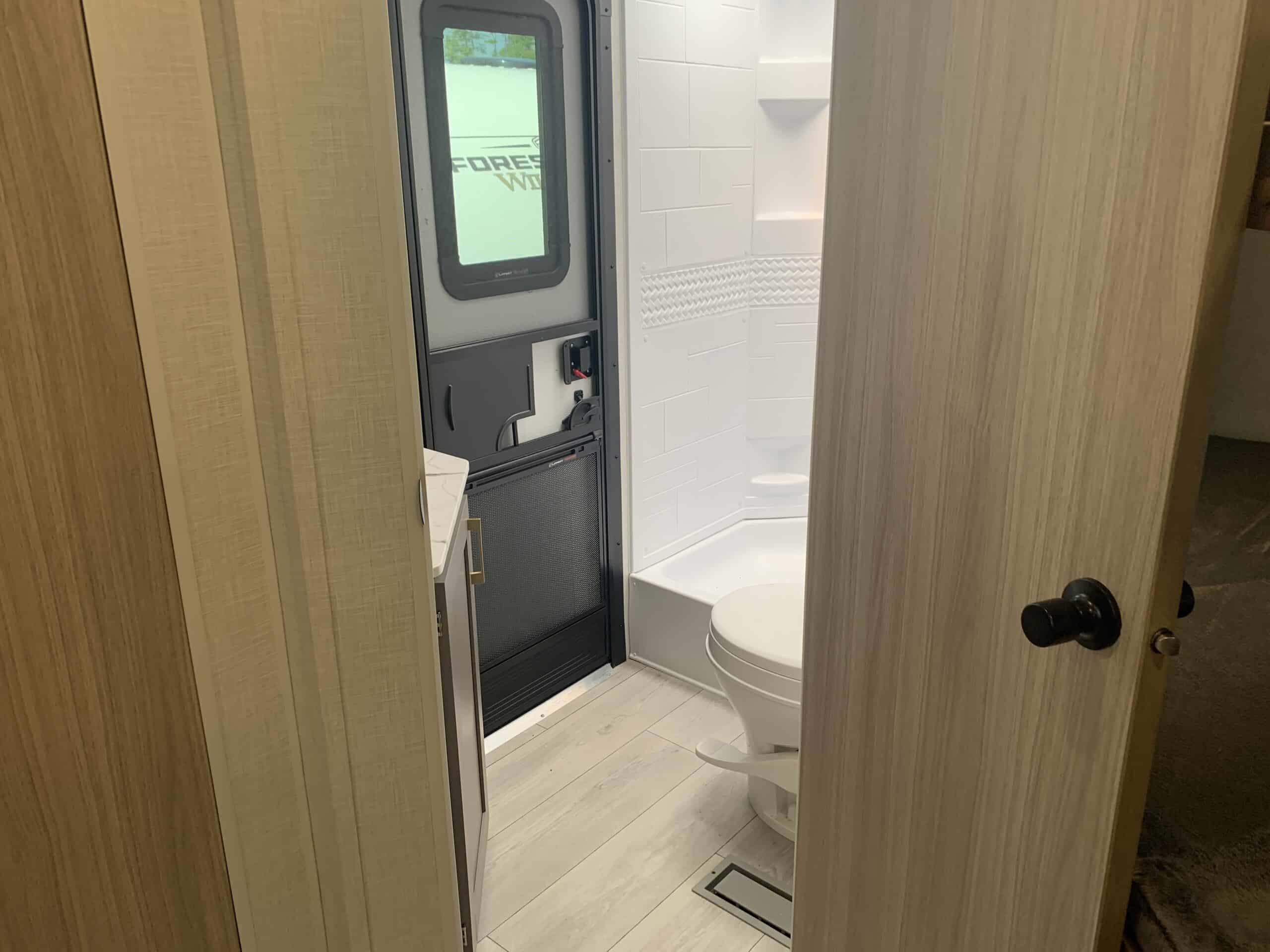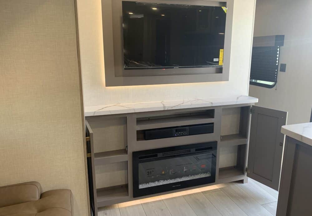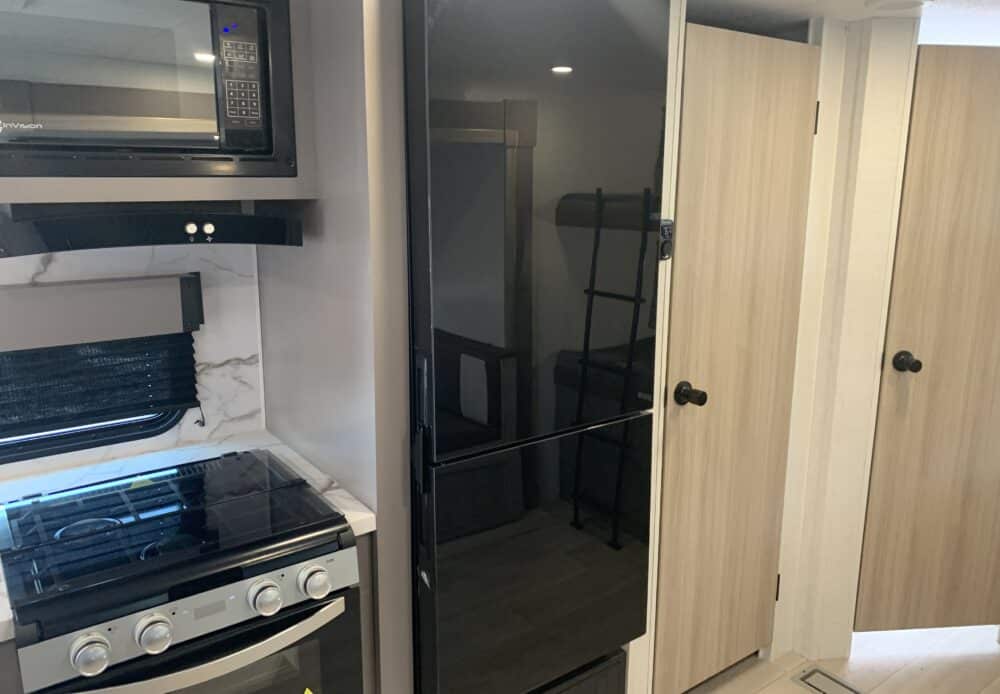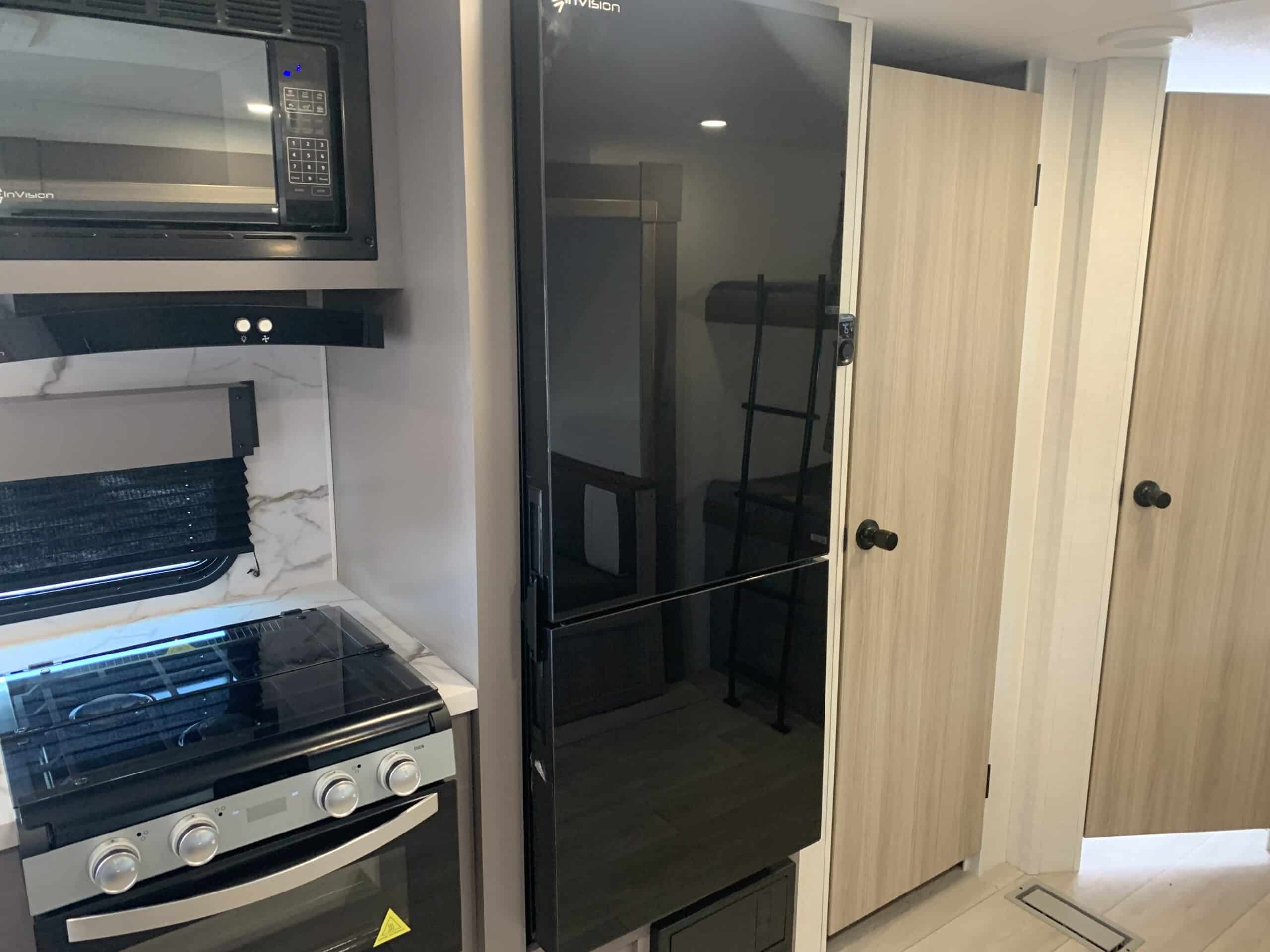 De plus la Sportsmen 261BHKSE a 2 airs climatisés de 15000 btu et un foyer pour tempérer l’ambiance désirée. Par ailleurs, la cuisine a un micro-ondes, un poêle avec dessus en verre et un réfrigérateur de 12 volts. Aussi une banquette et un sofa situé dans l’extension se transforment en lit. Une armoire-penderie pour faciliter le rangement. Enfin la radio et ses haut-parleurs vous permettront de relaxer en écoutant votre musique préférée.