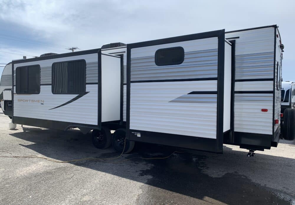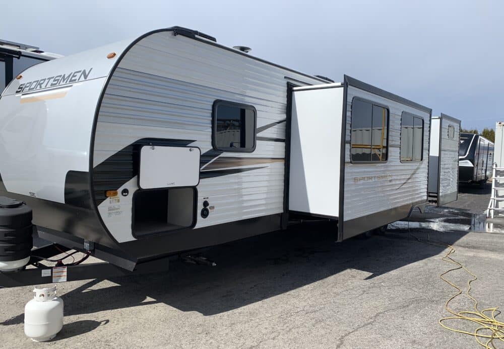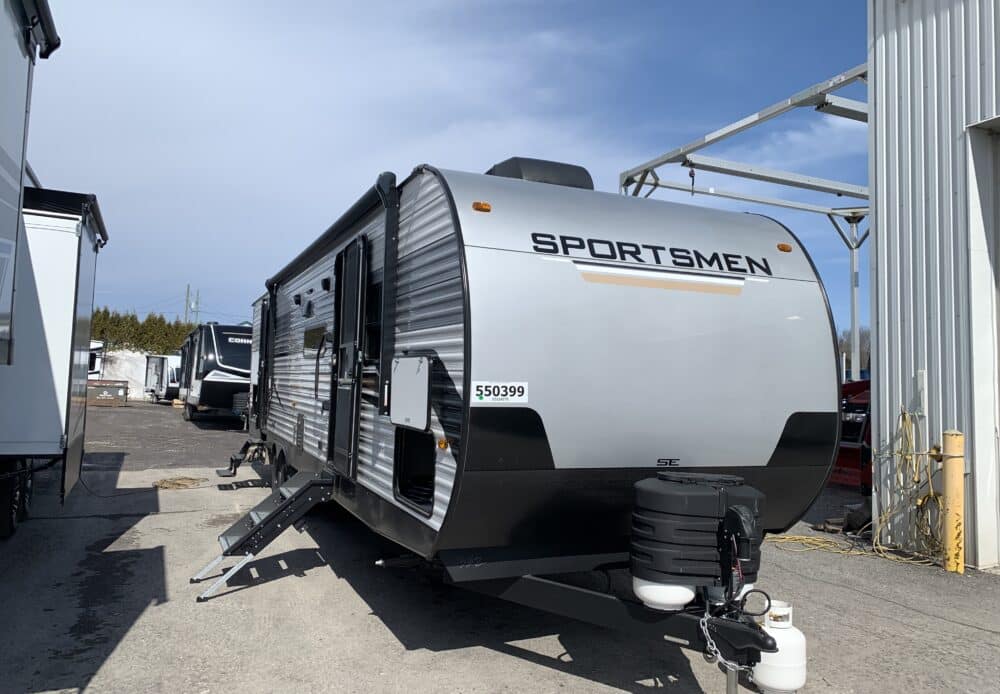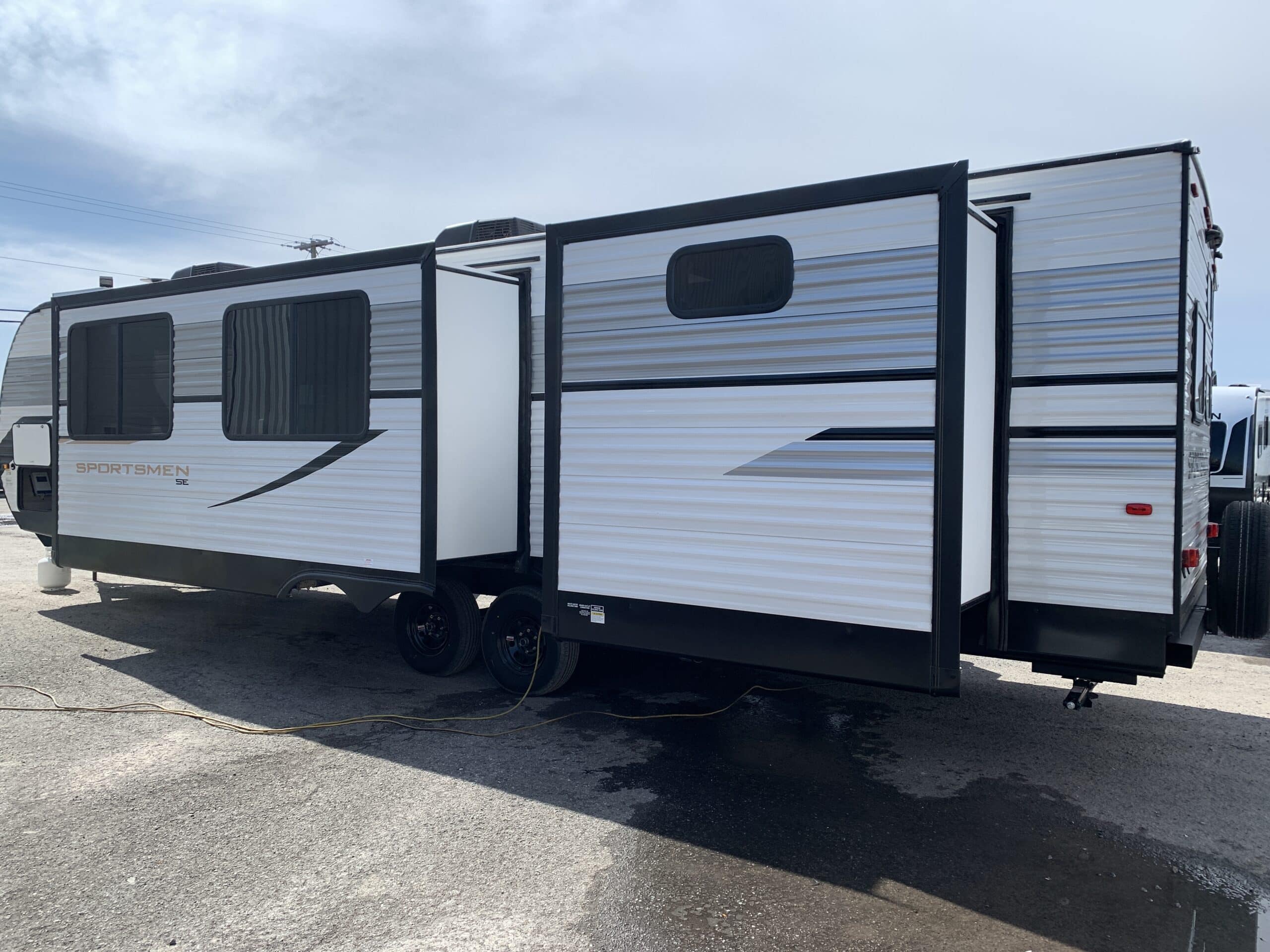 2025 Sportsmen 332BHKSE, familiale de 37.3 pieds à 7440 lbs avec 2 essieux, extérieur en aluminium et 2 extensions.