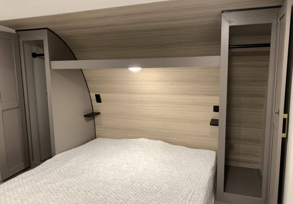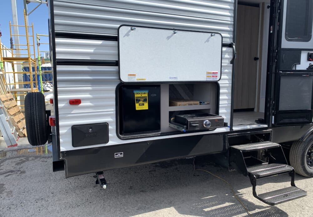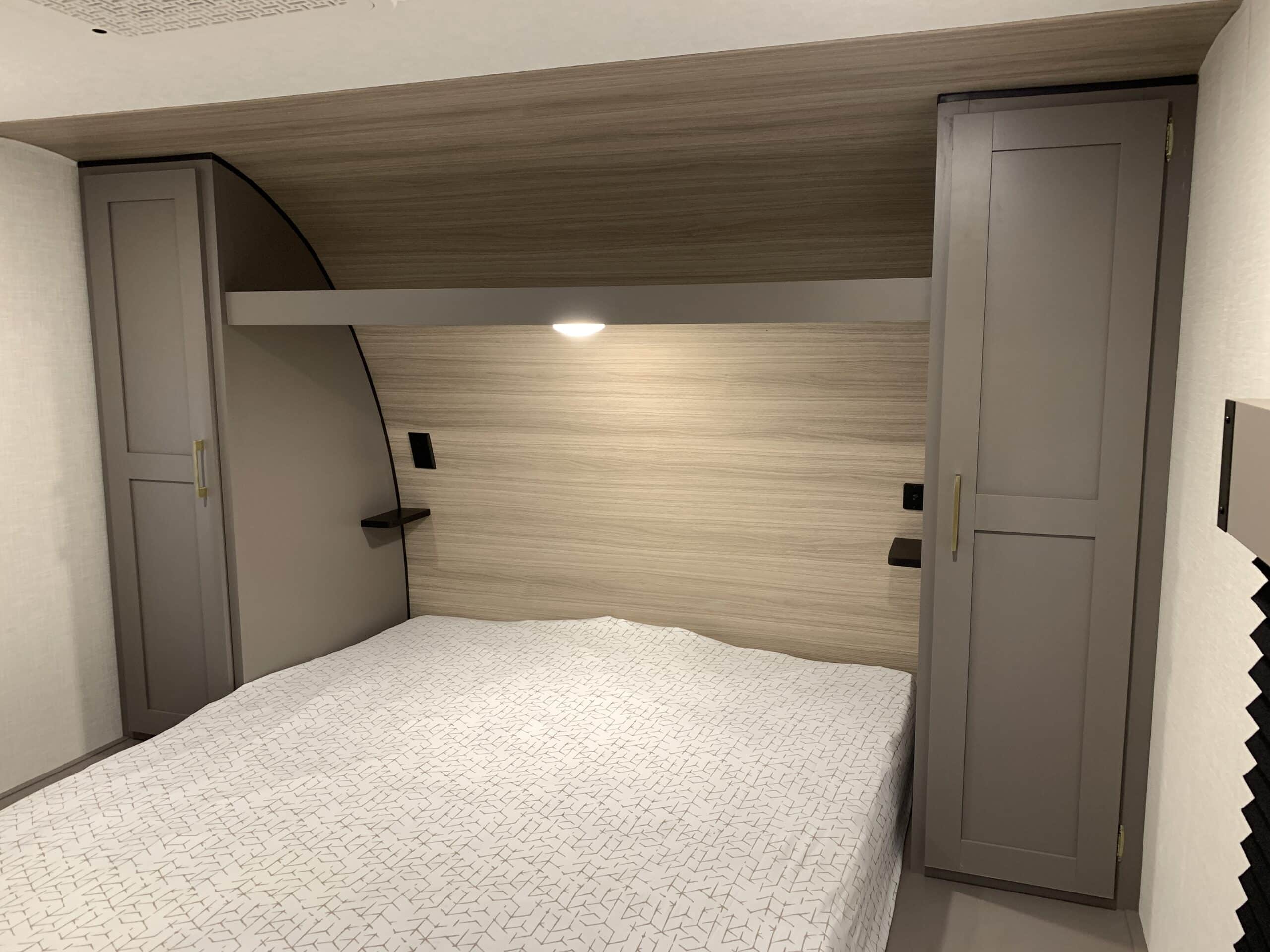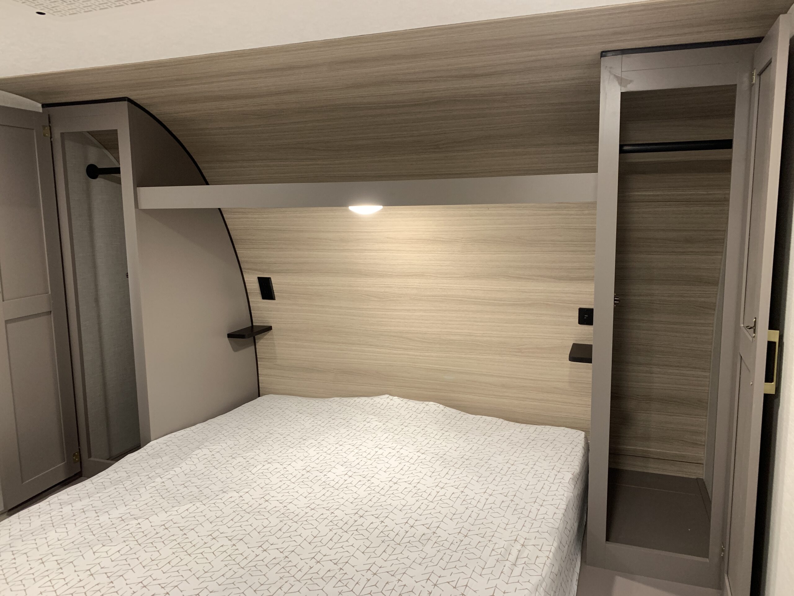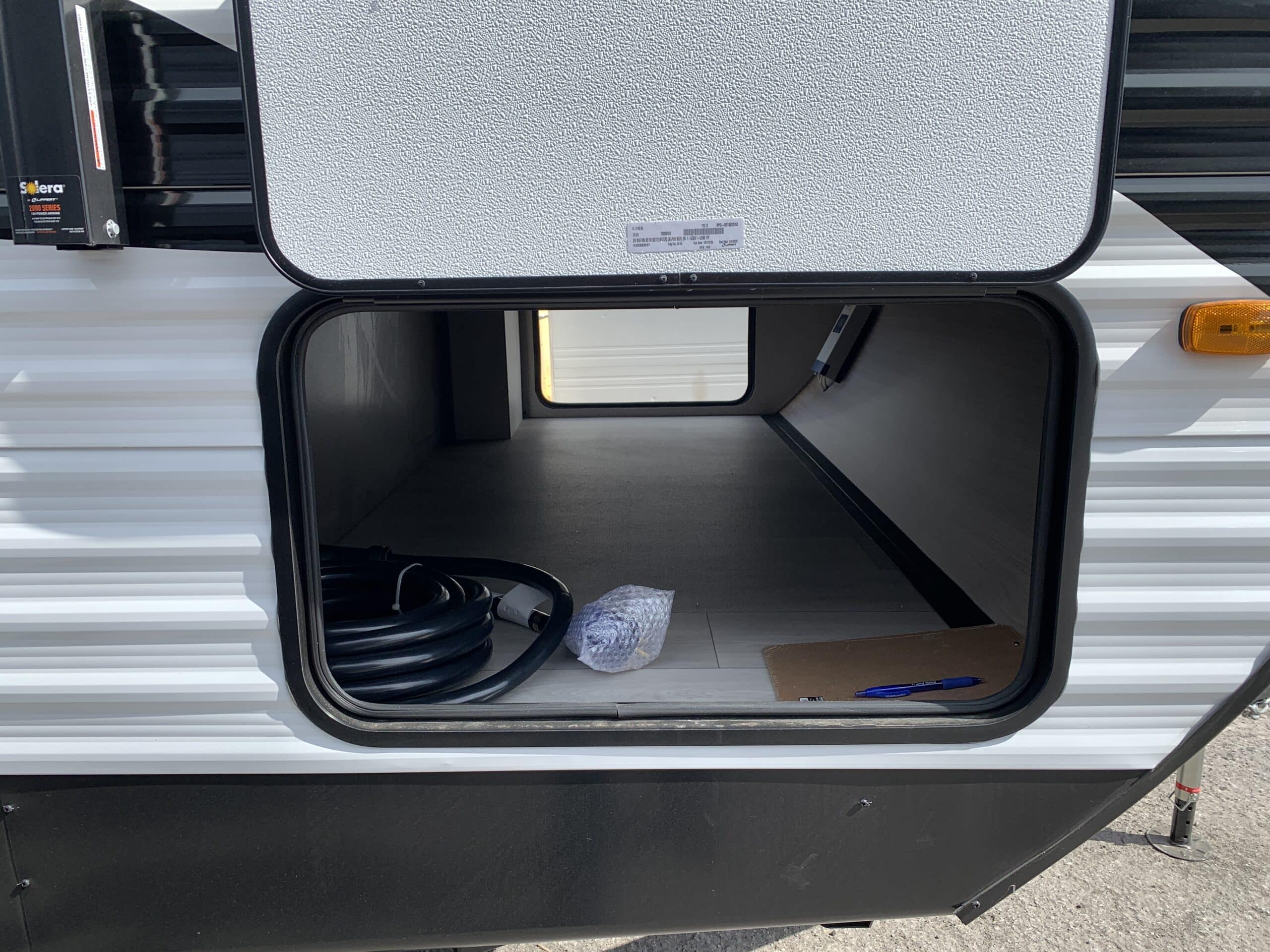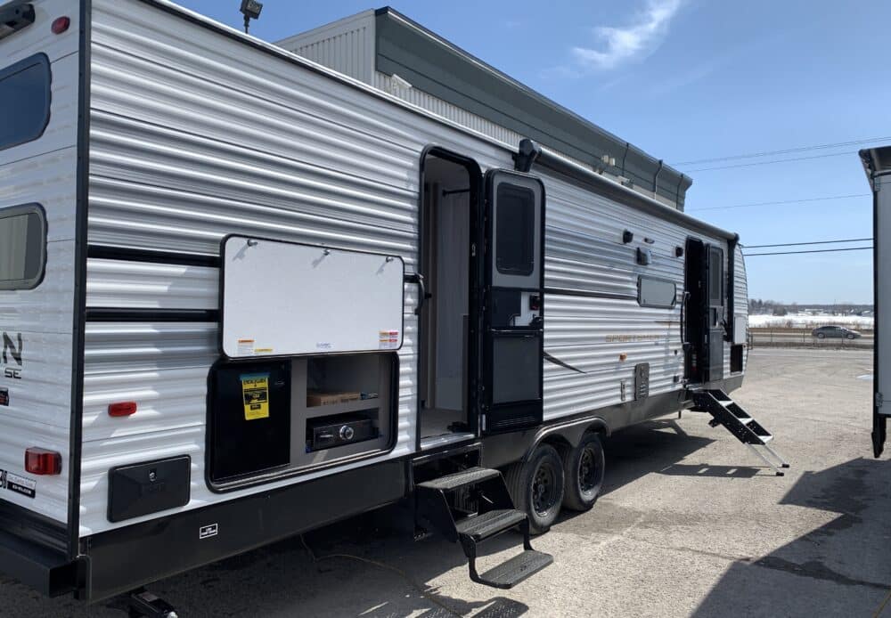 D’abord, cette roulotte a un auvent de 20 pieds avec lumières del. Grâce à sa cuisine et sa douche vous profiterez de l’extérieur sans soucis. Puisque ses marches sont ajustables et très stables vous aurez un accès facile à l’intérieur. Aussi, elle est pré-filé pour panneau solaire et caméra de recul. Les coffres ont un bel espace de rangement.