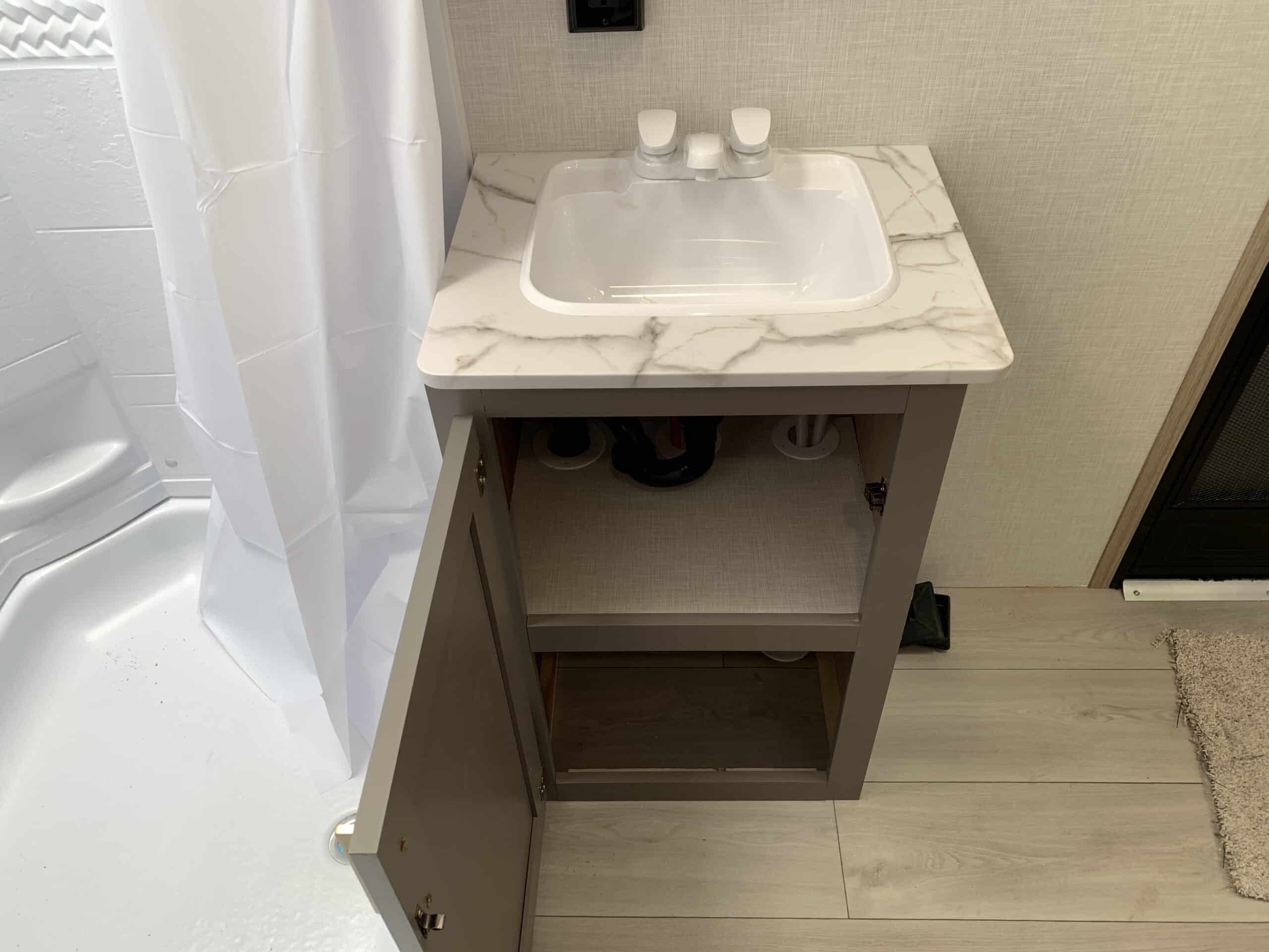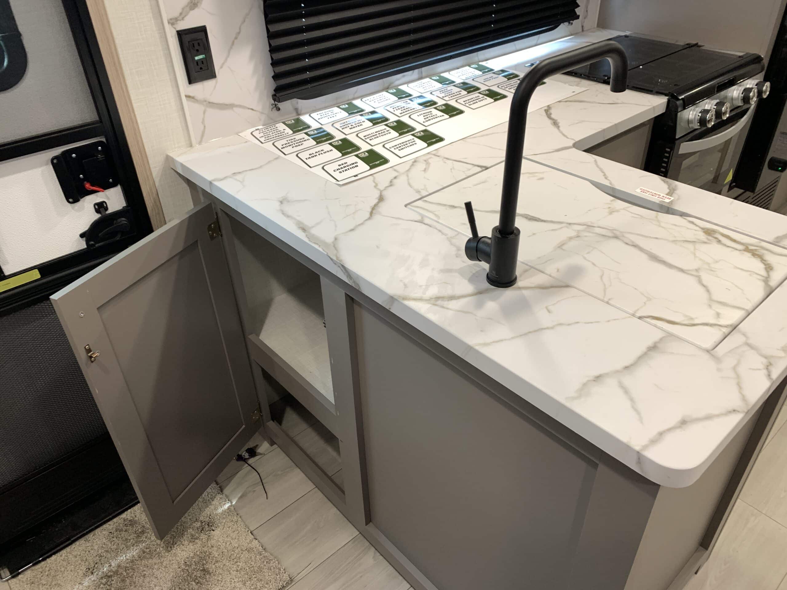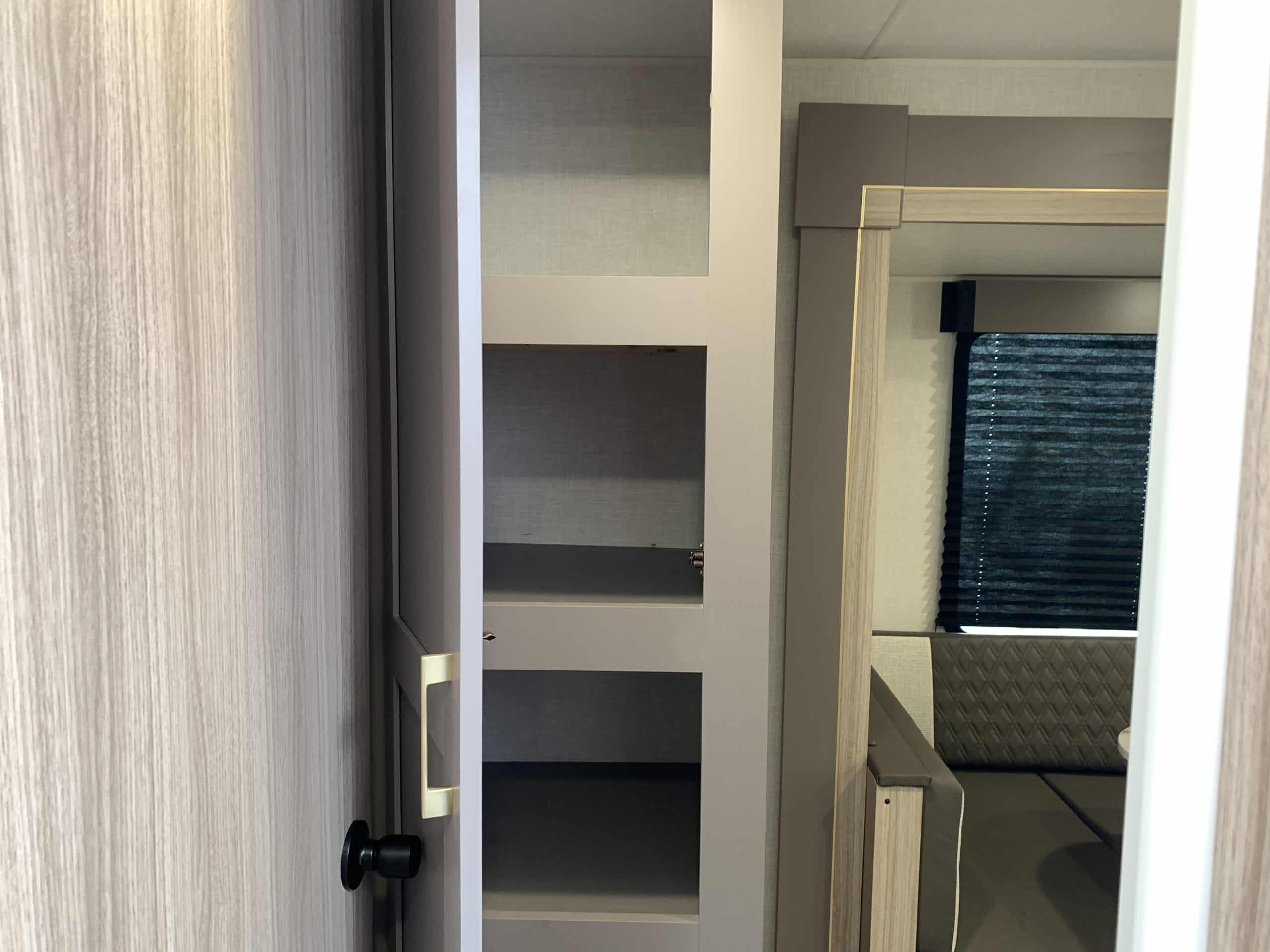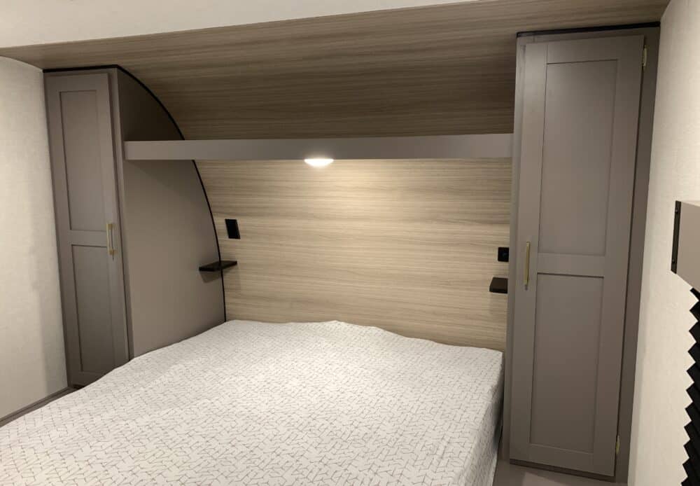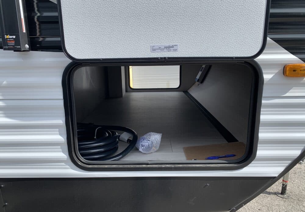 D’abord, cette roulotte a un auvent de 20 pieds avec lumières del. Grâce à sa cuisine et sa douche vous profiterez de l’extérieur sans soucis. Puisque ses marches sont ajustables et très stables vous aurez un accès facile à l’intérieur. Aussi, elle est pré-filé pour panneau solaire et caméra de recul. Les coffres ont un bel espace de rangement.