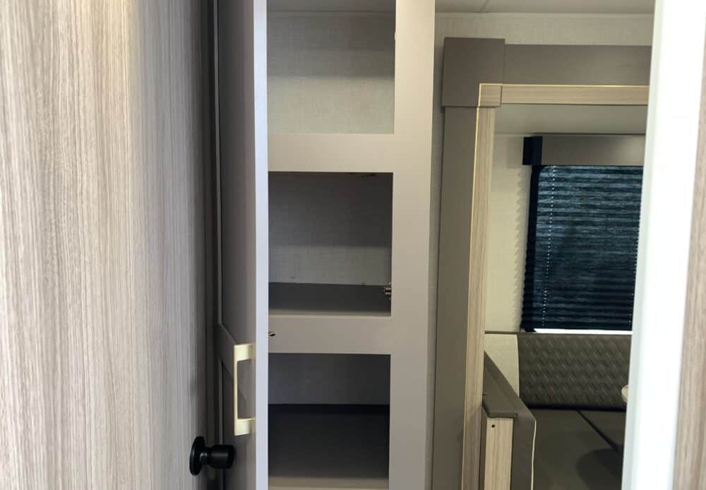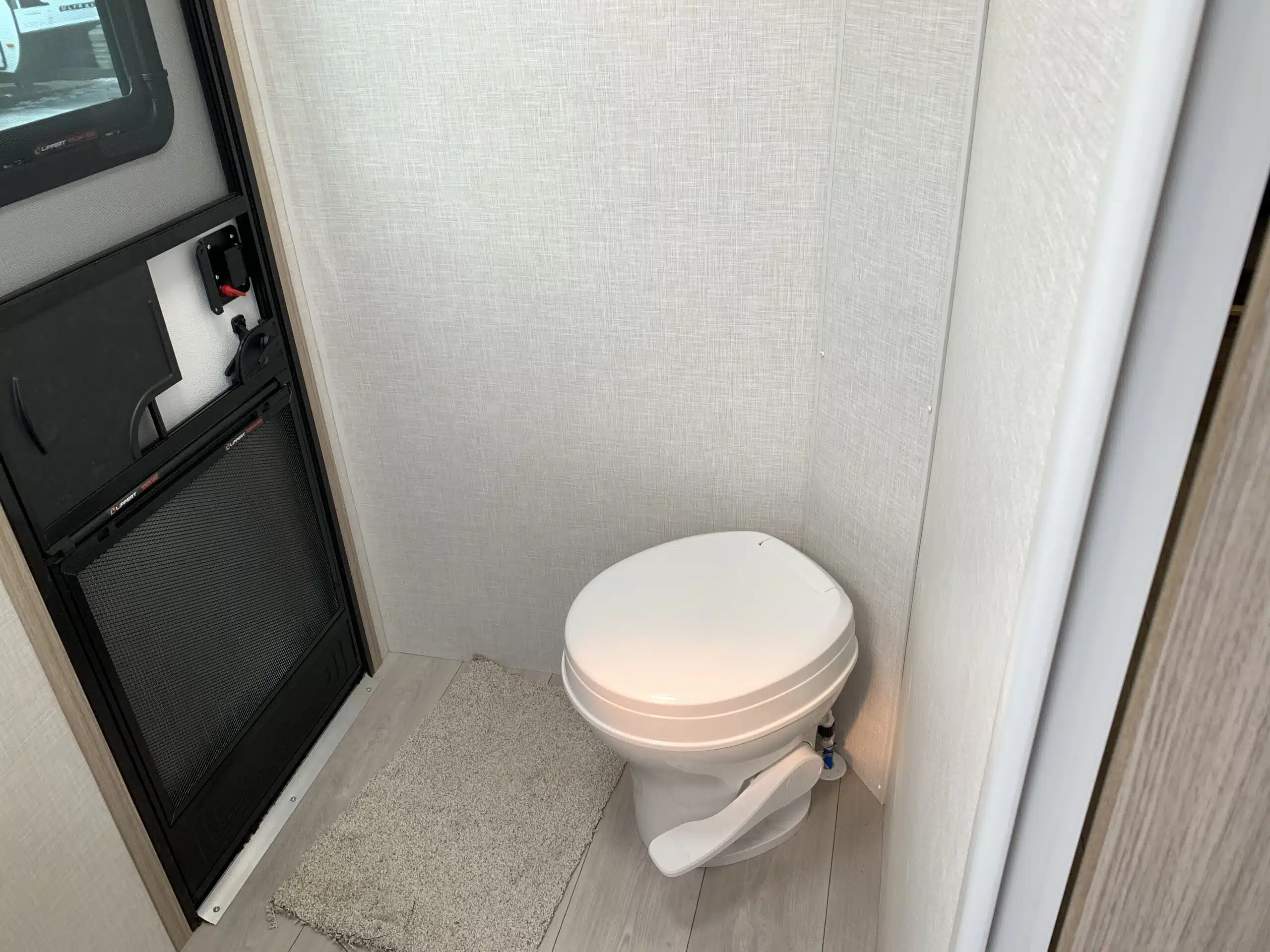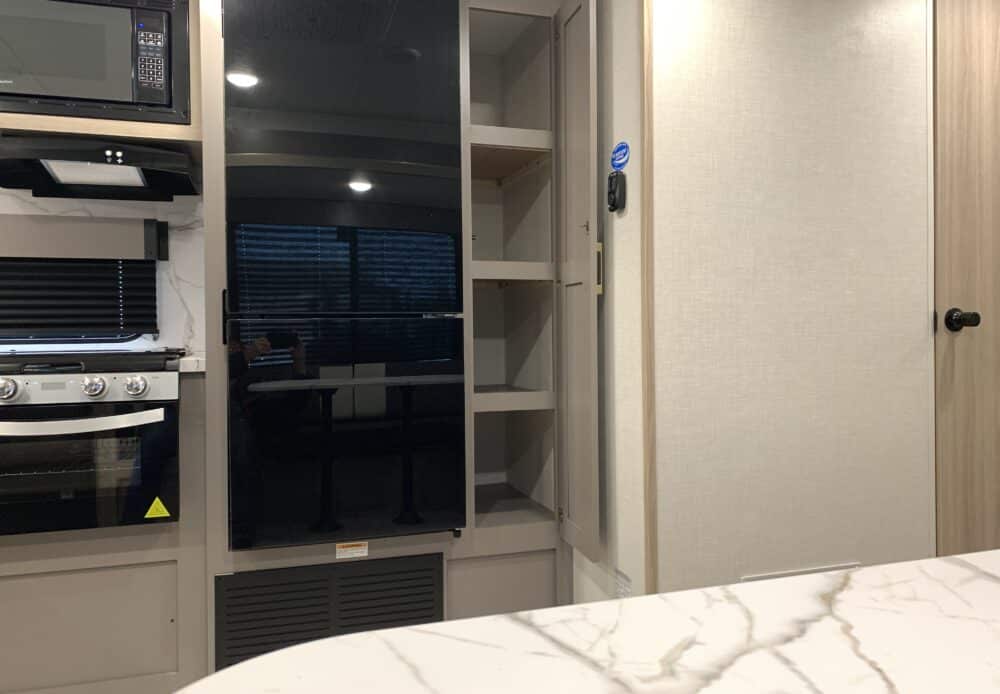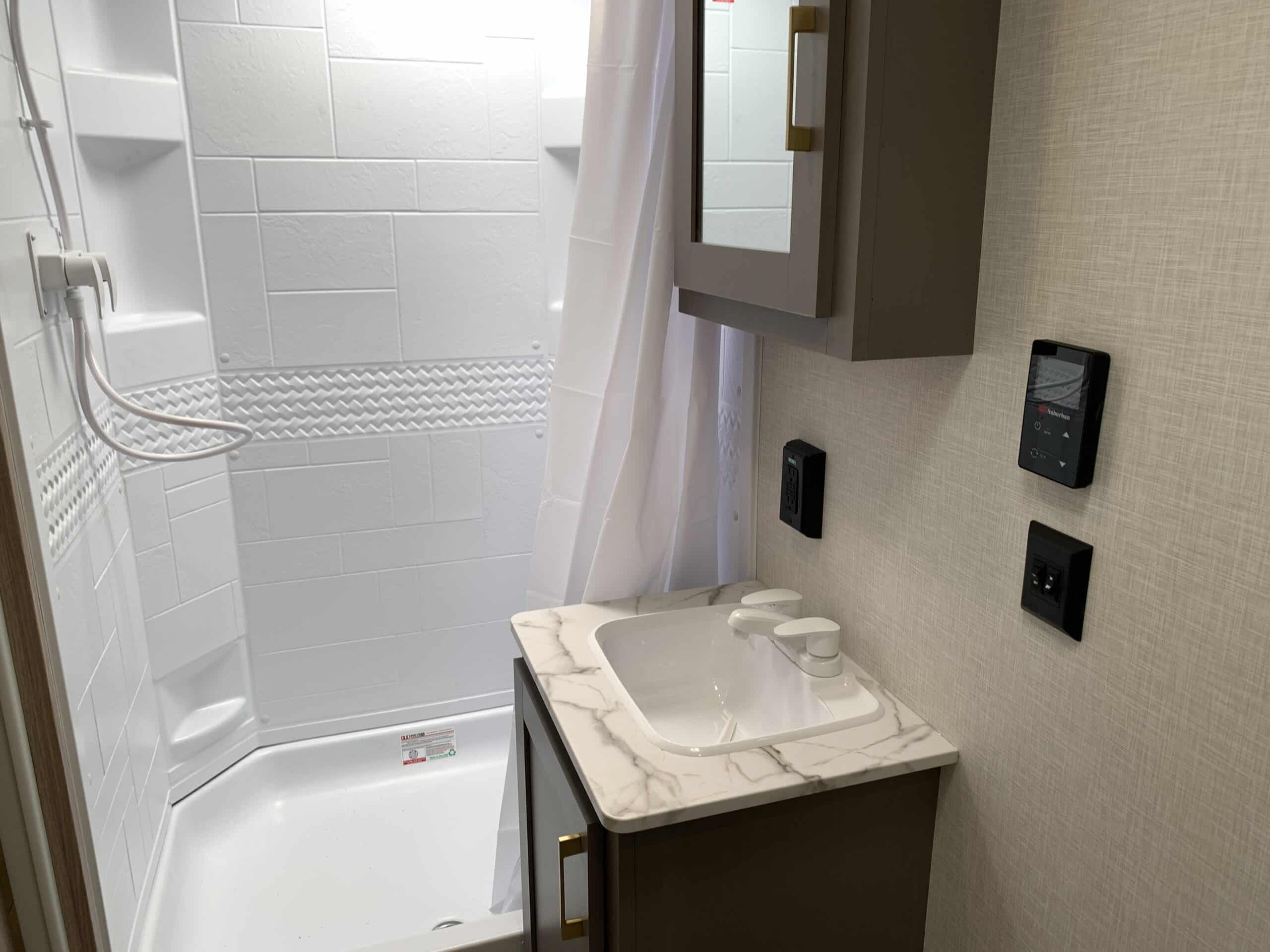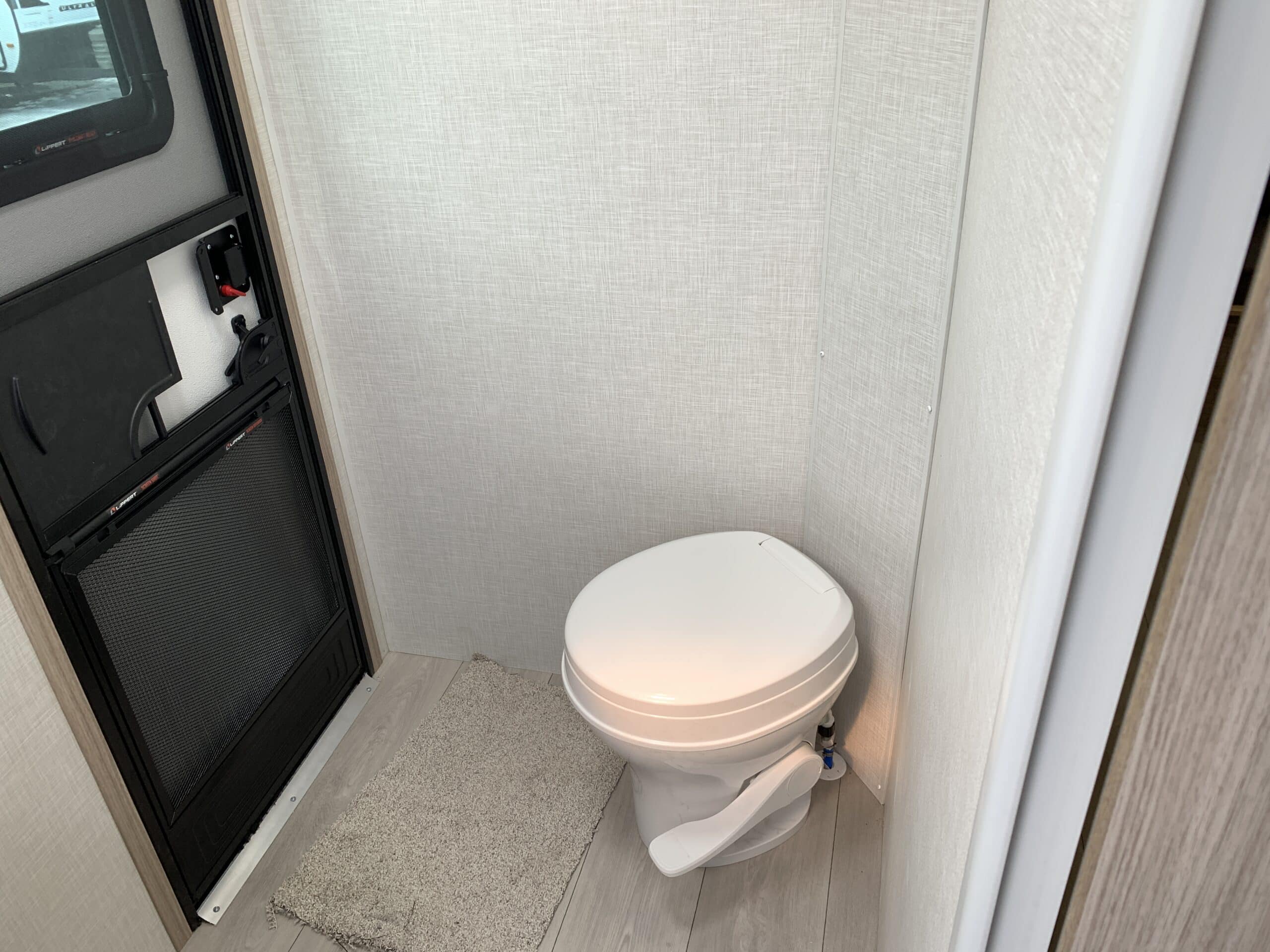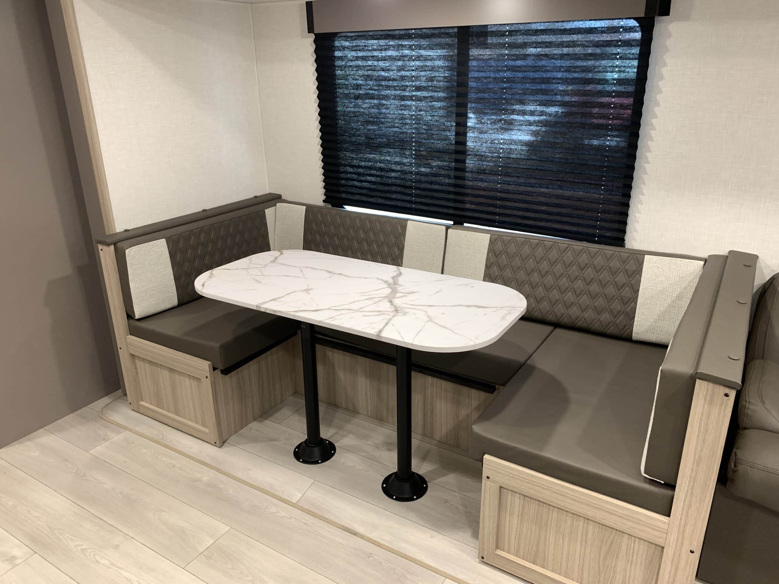 D’abord, cette roulotte a un auvent de 20 pieds avec lumières del. Grâce à sa cuisine et sa douche vous profiterez de l’extérieur sans soucis. Puisque ses marches sont ajustables et très stables vous aurez un accès facile à l’intérieur. Aussi, elle est pré-filé pour panneau solaire et caméra de recul. Les coffres ont un bel espace de rangement.