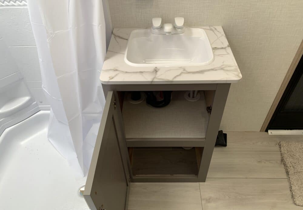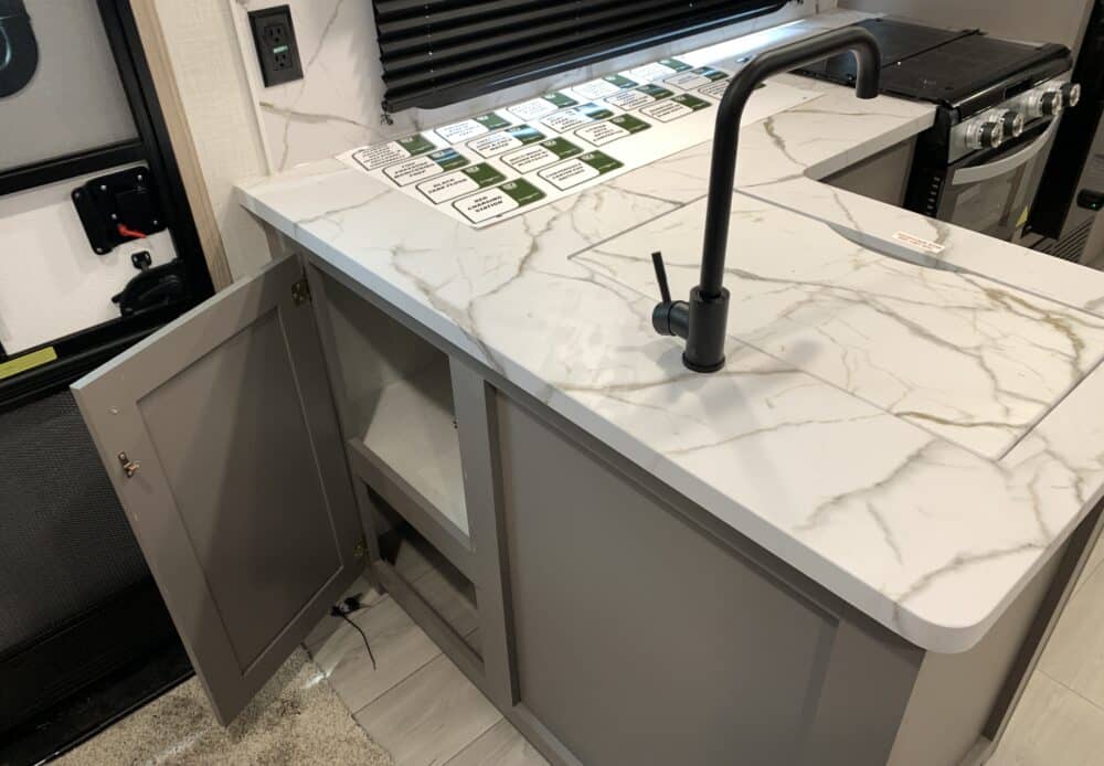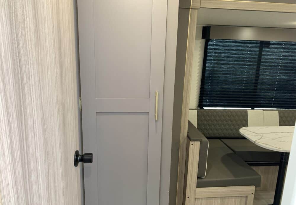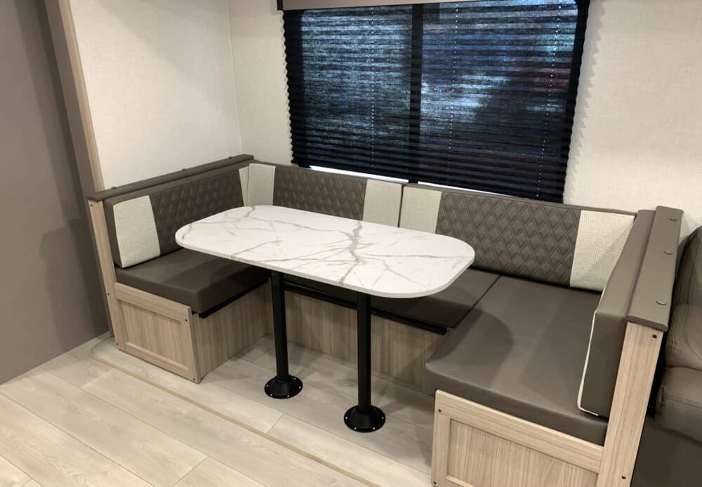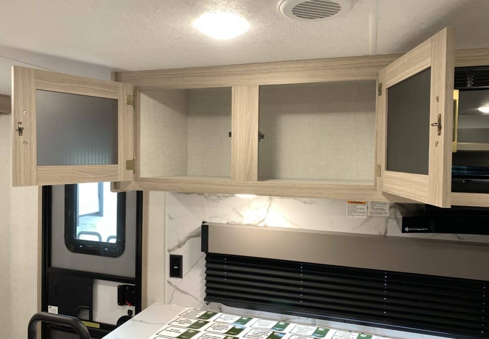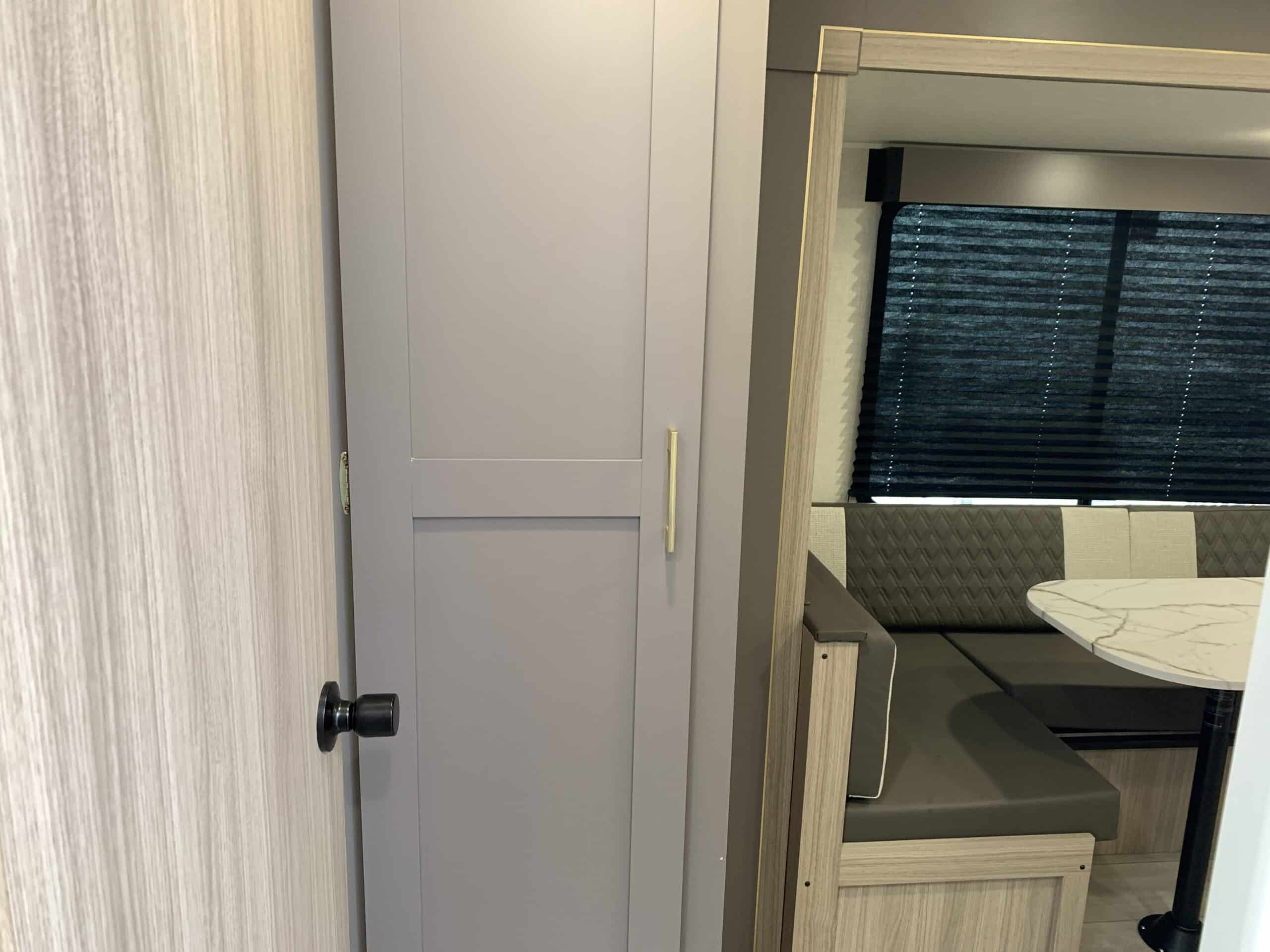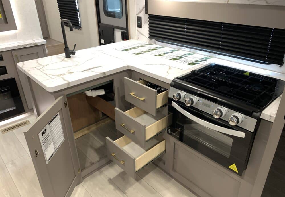 D’abord, cette roulotte a un auvent de 20 pieds avec lumières del. Grâce à sa cuisine et sa douche vous profiterez de l’extérieur sans soucis. Puisque ses marches sont ajustables et très stables vous aurez un accès facile à l’intérieur. Aussi, elle est pré-filé pour panneau solaire et caméra de recul. Les coffres ont un bel espace de rangement.