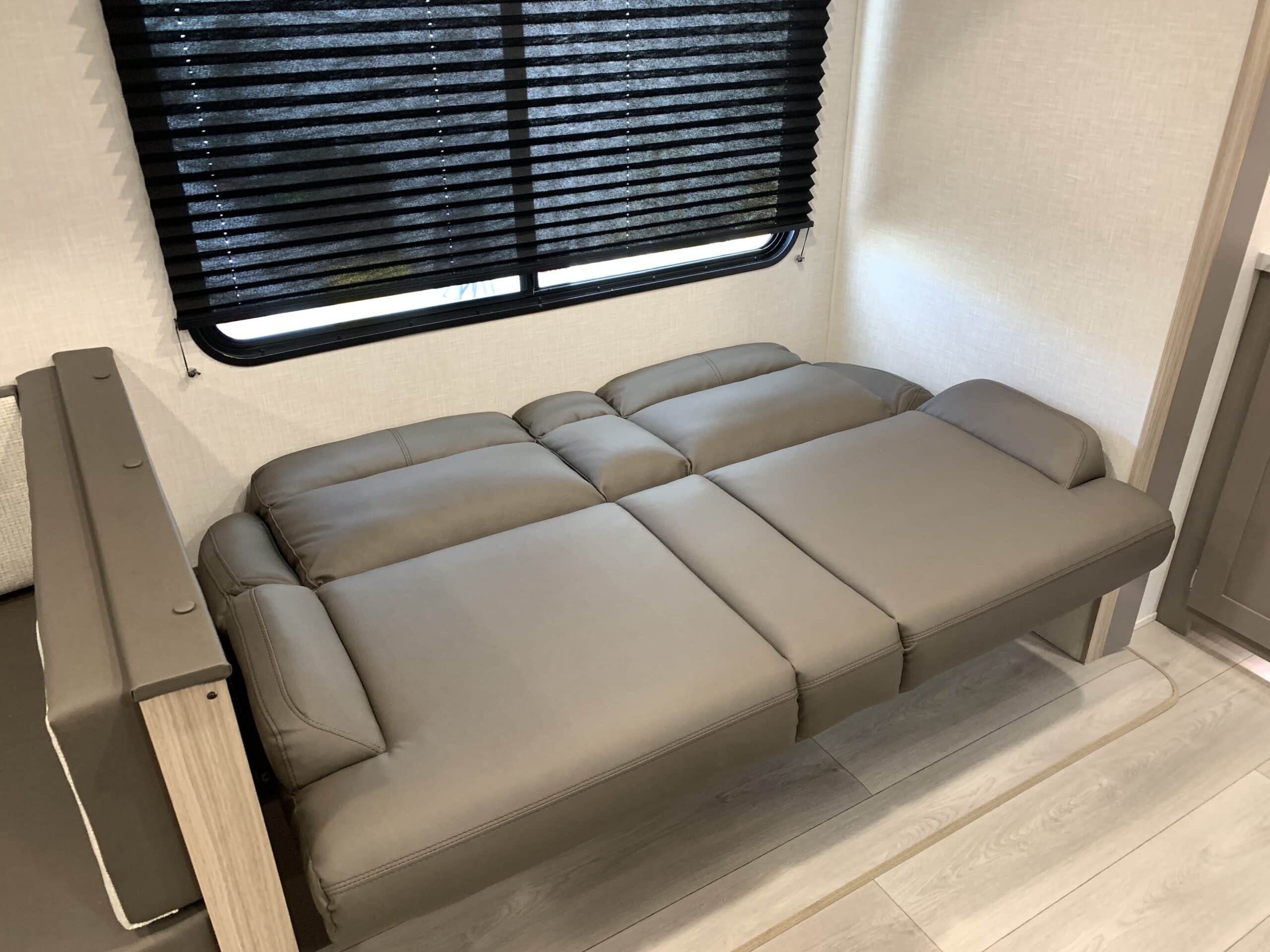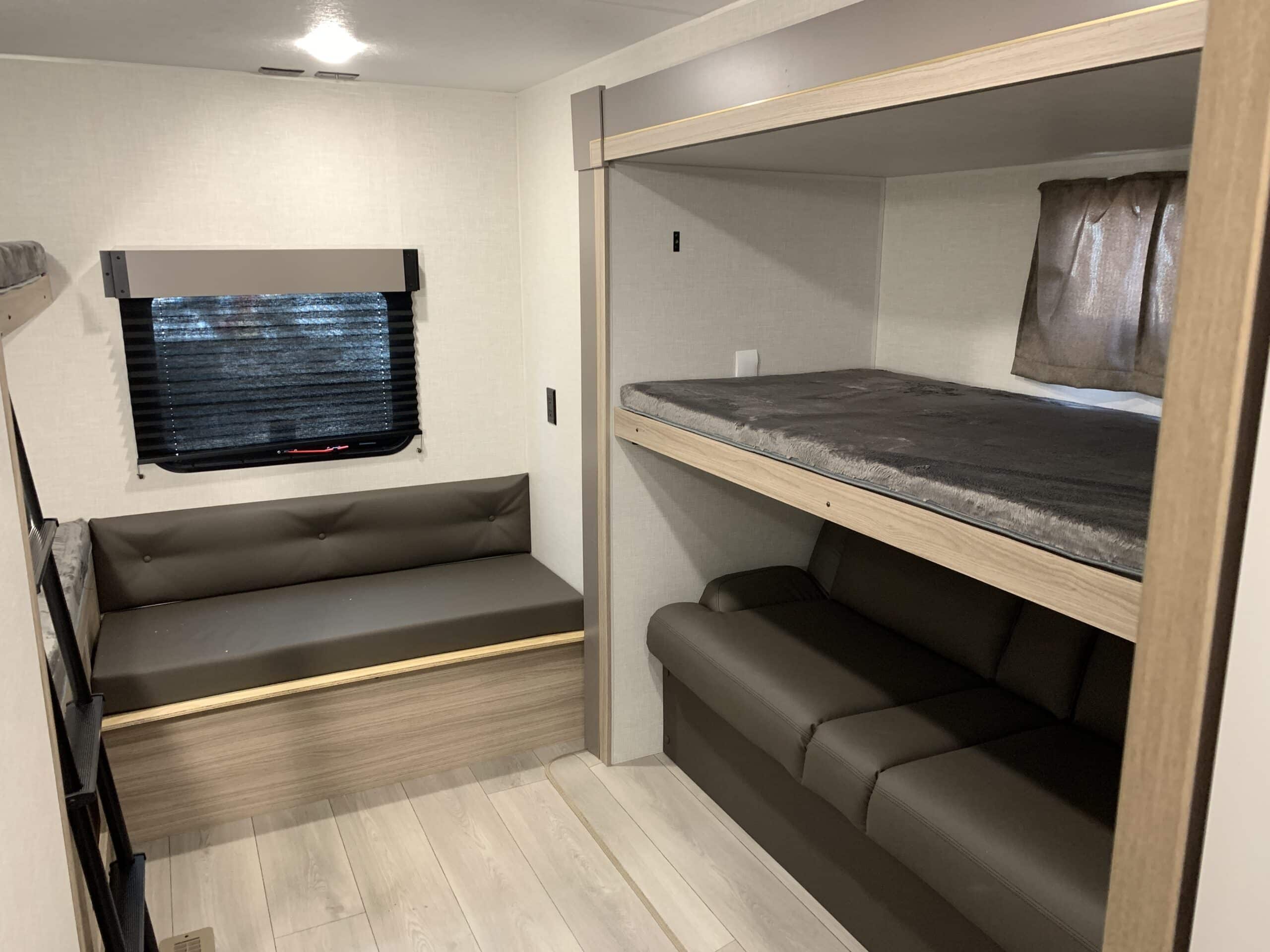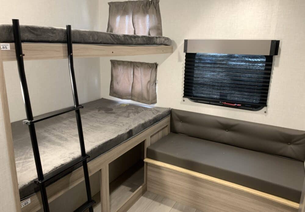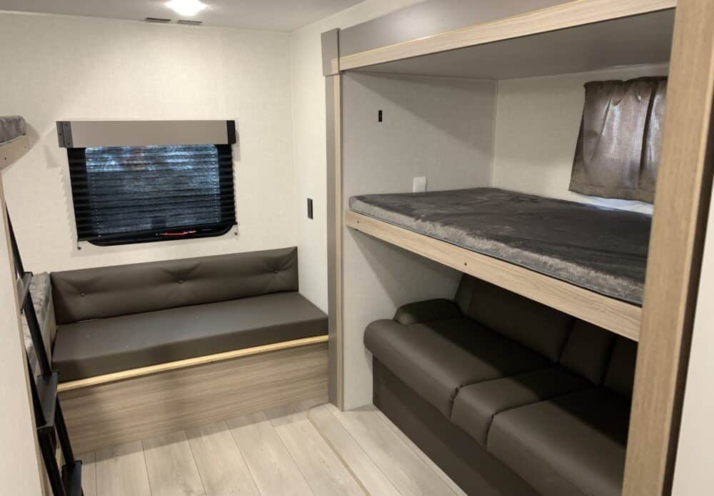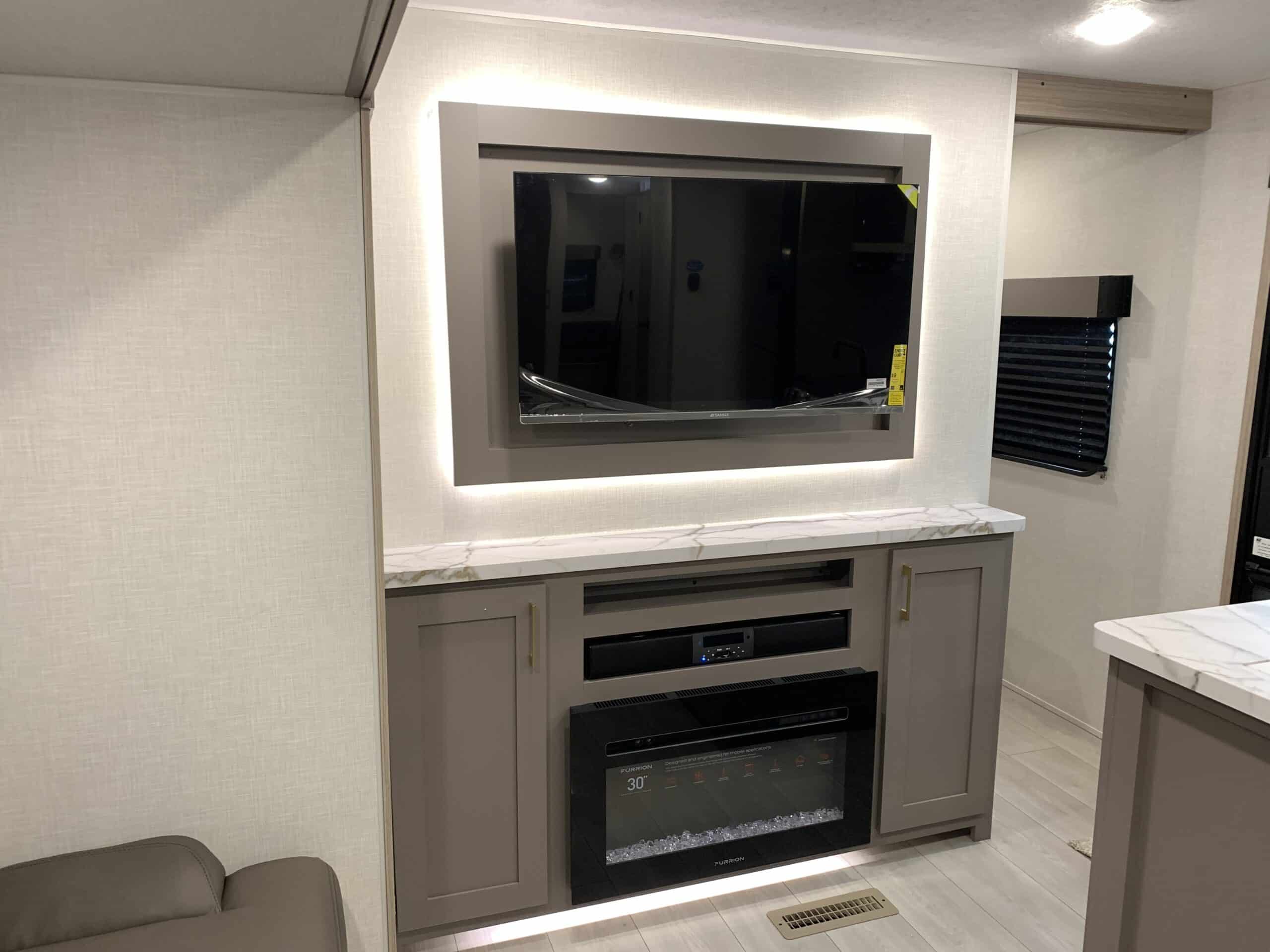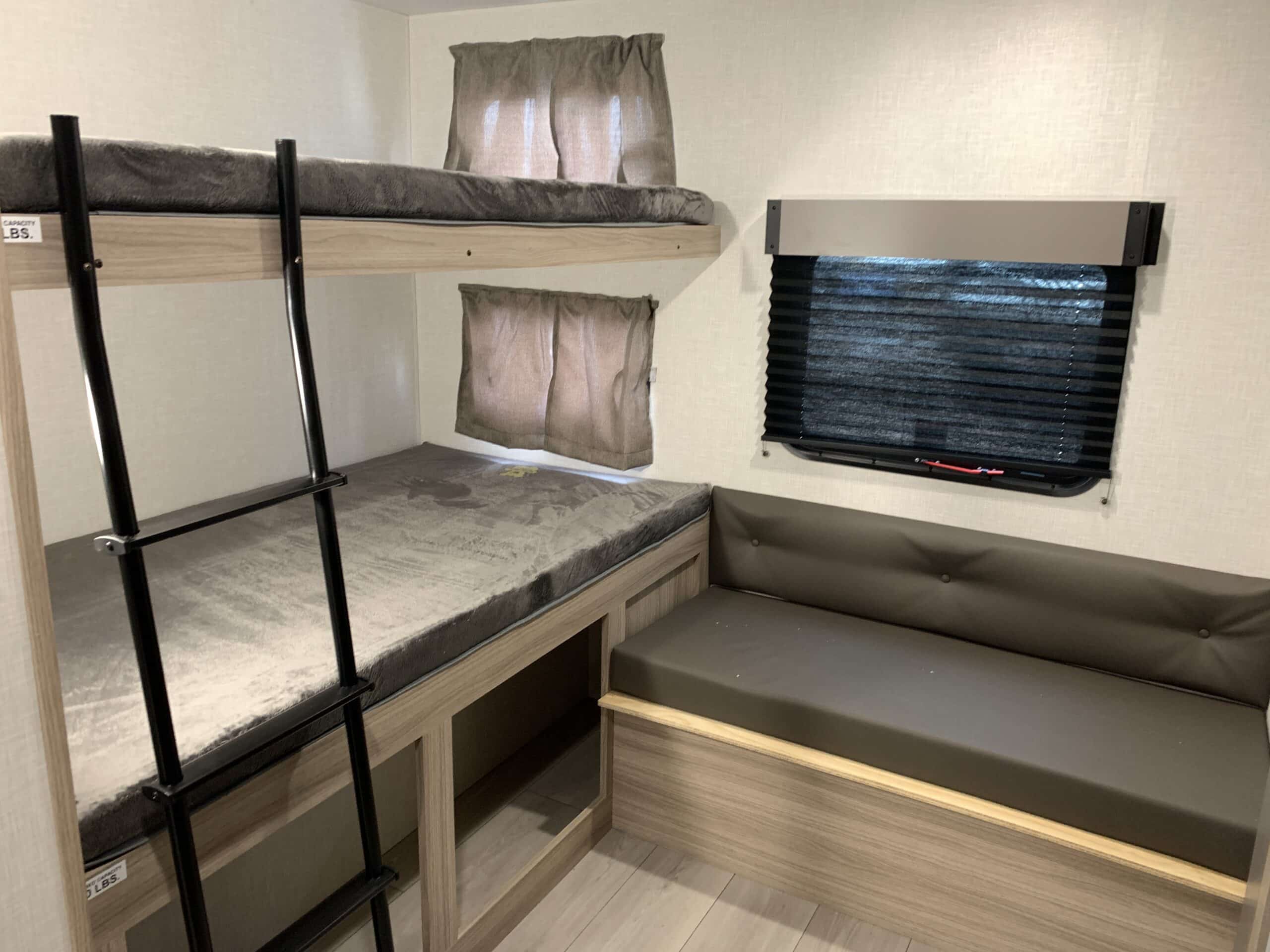 De plus la Sportsmen 332BHKSE a un air climatisé de 13500 btu et un foyer qui tempéreront l’ambiance désirée. Par ailleurs, la cuisine a un poêle avec dessus en verre, un réfrigérateur de 7p.c. et un micro-ondes. Aussi une banquette et un sofa situé dans l’extension se tra