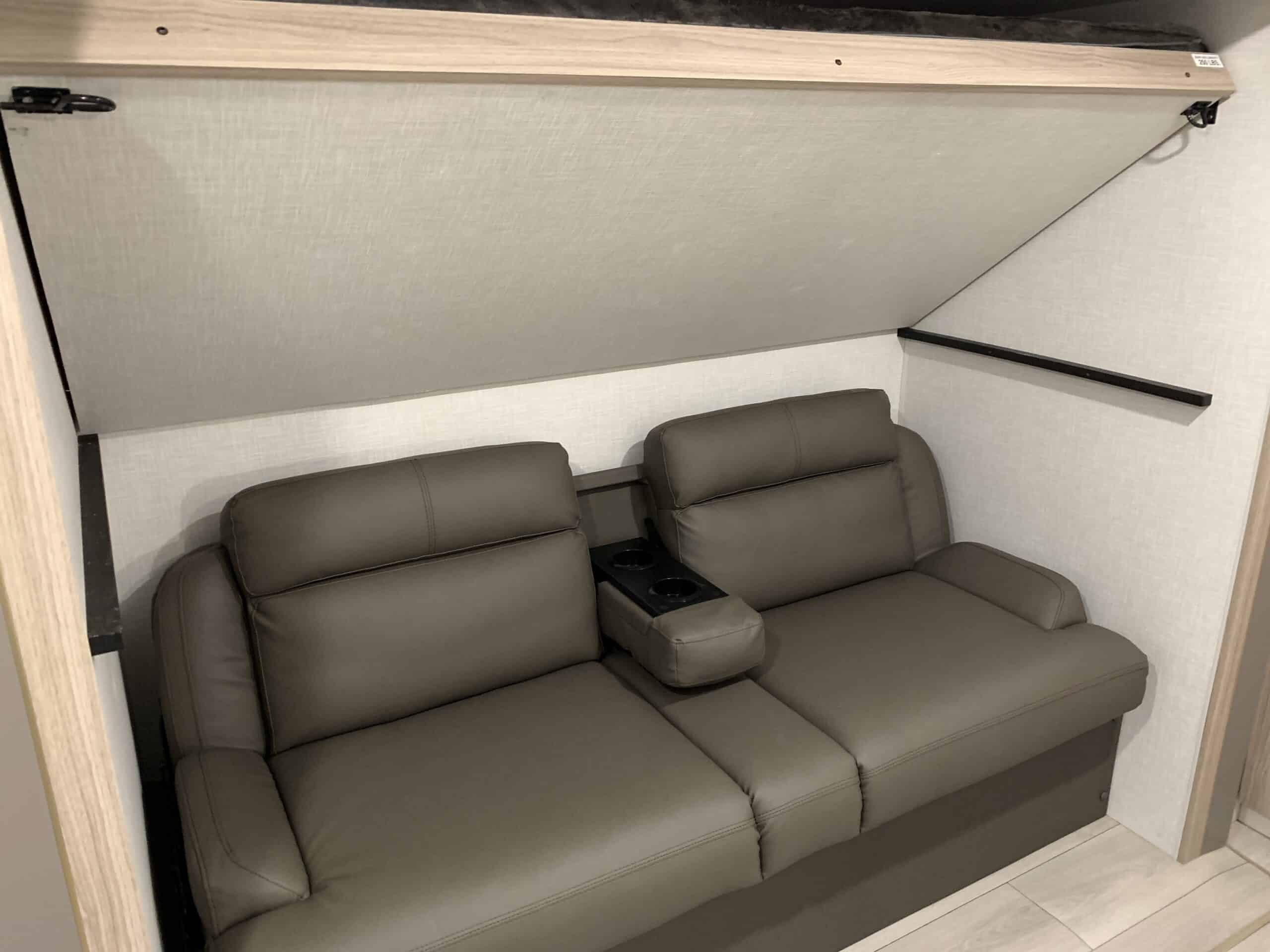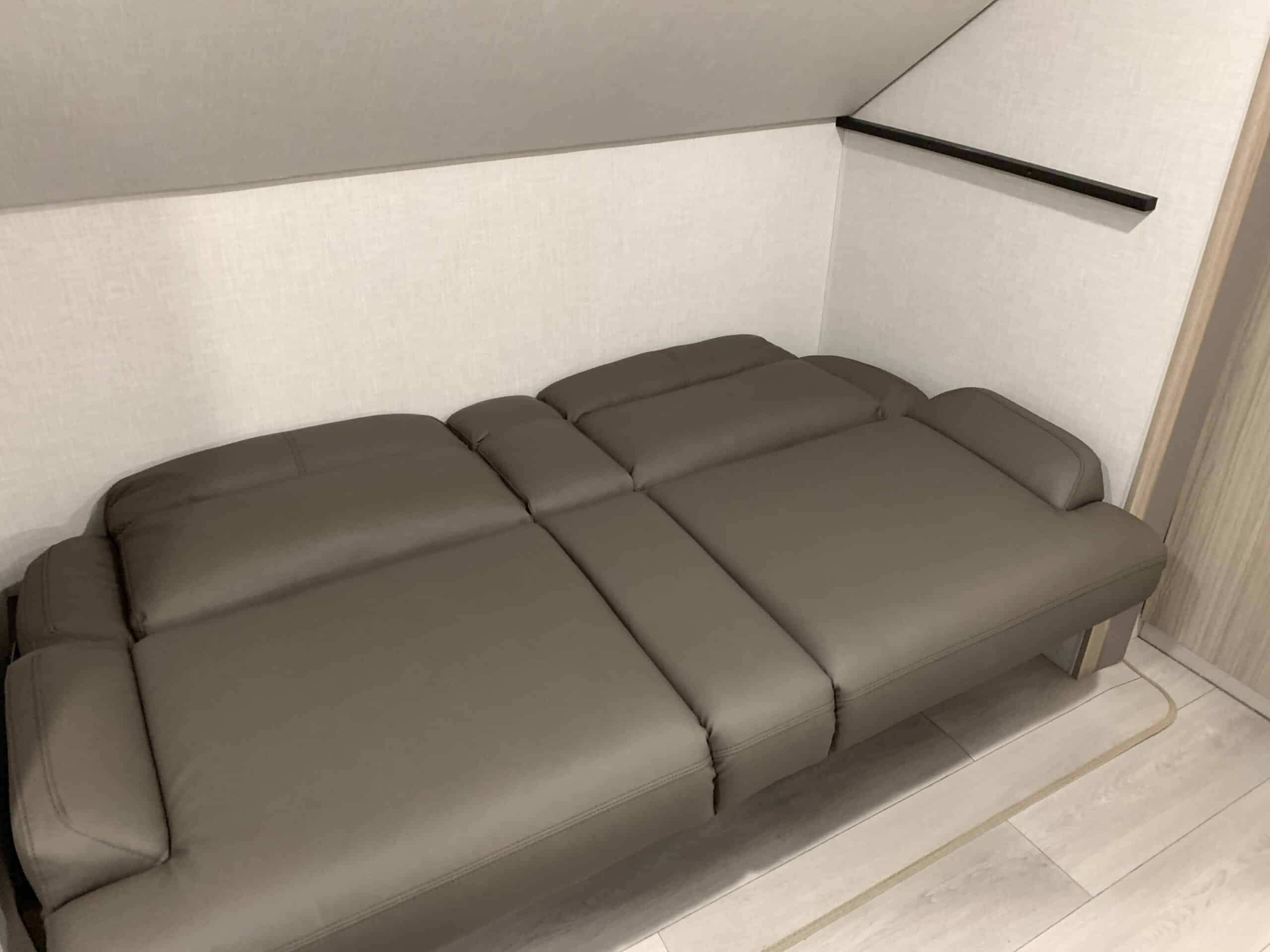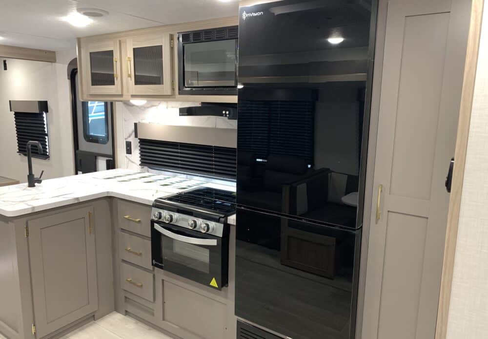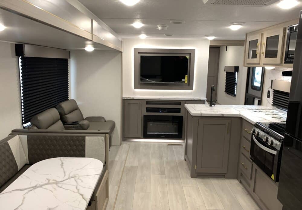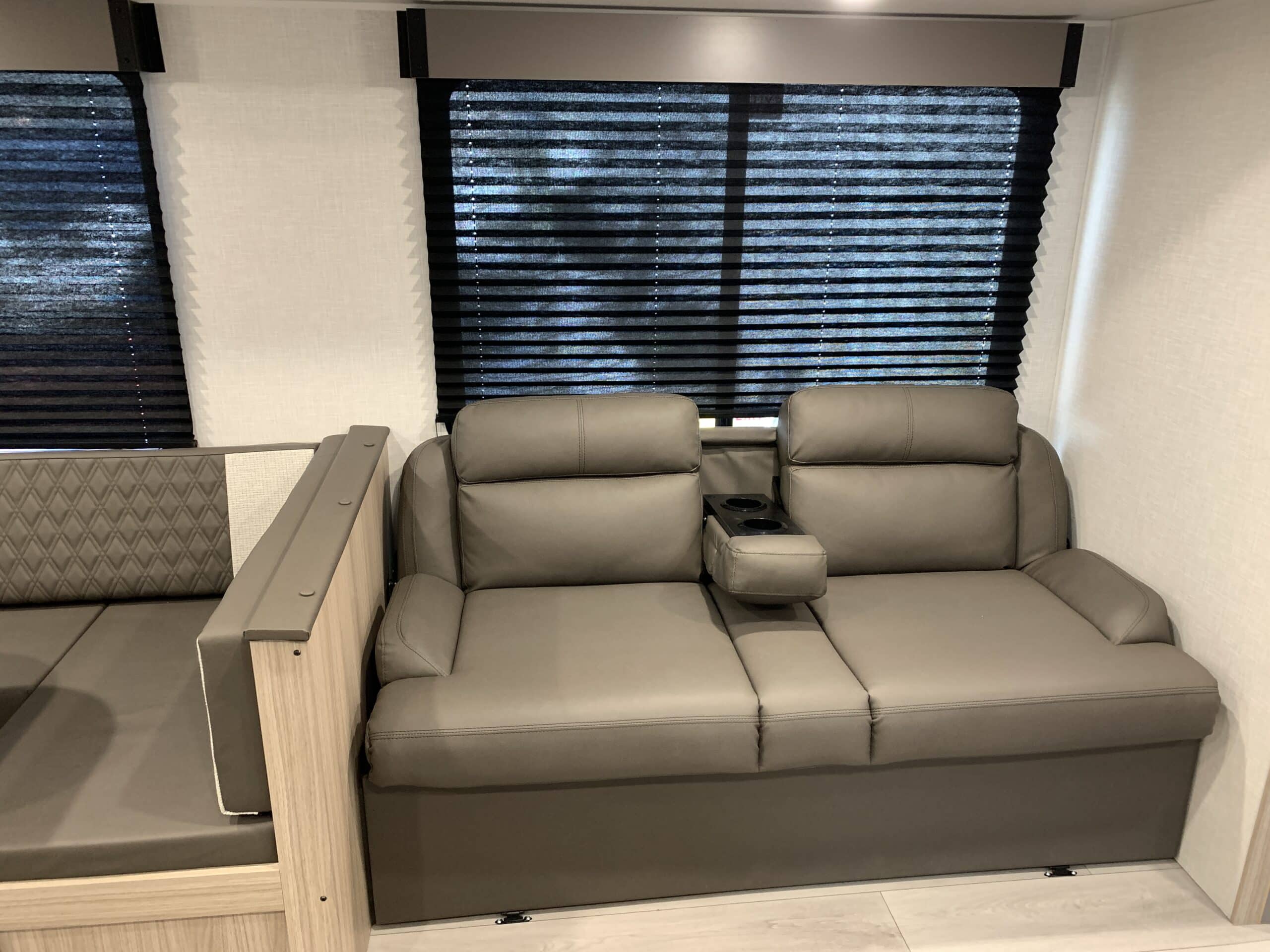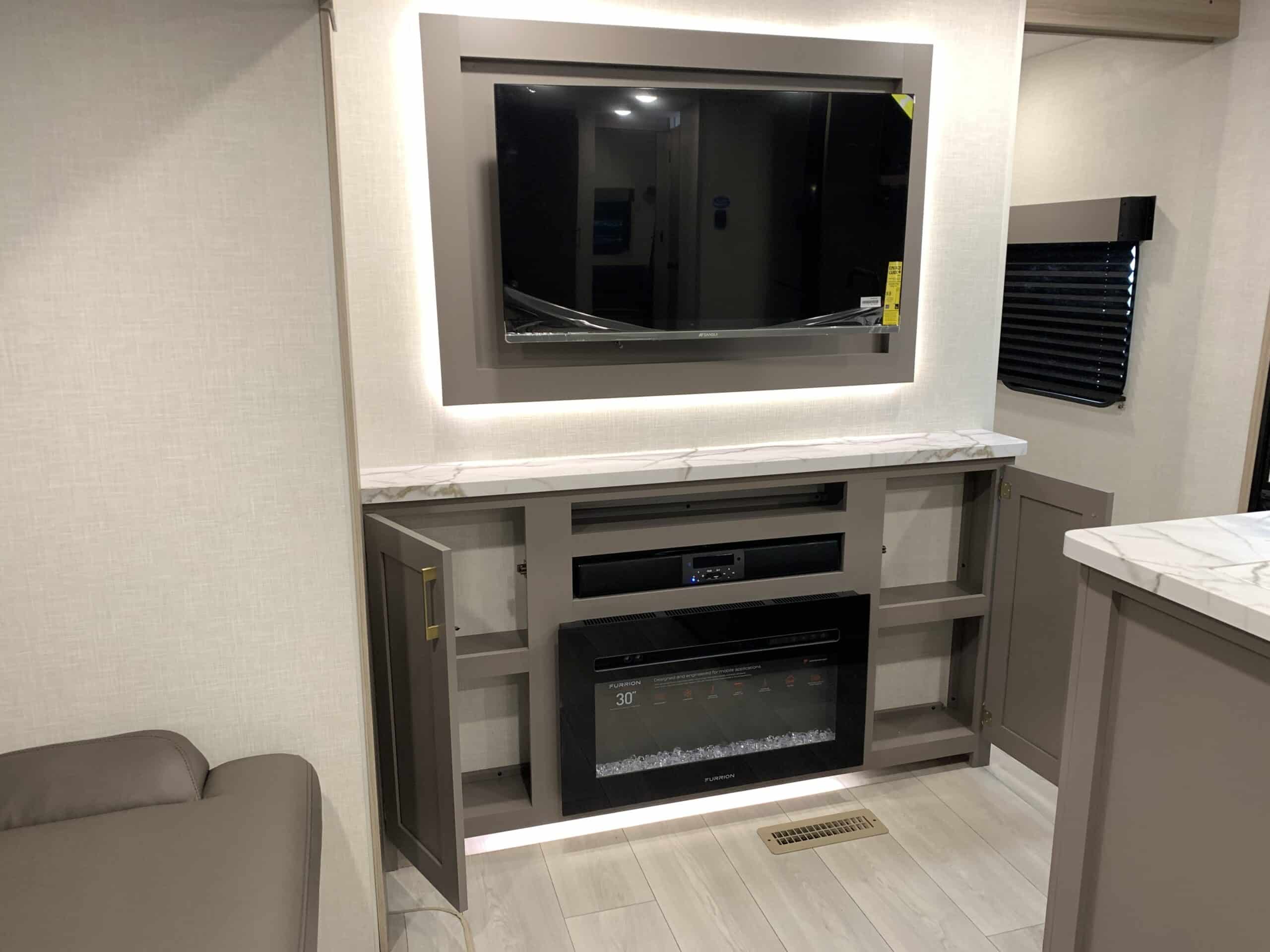 De plus la Sportsmen 332BHKSE a un air climatisé de 13500 btu et un foyer qui tempéreront l’ambiance désirée. Par ailleurs, la cuisine a un poêle avec dessus en verre, un réfrigérateur de 7p.c. et un micro-ondes. Aussi une banquette et un sofa situé dans l’extension se tra