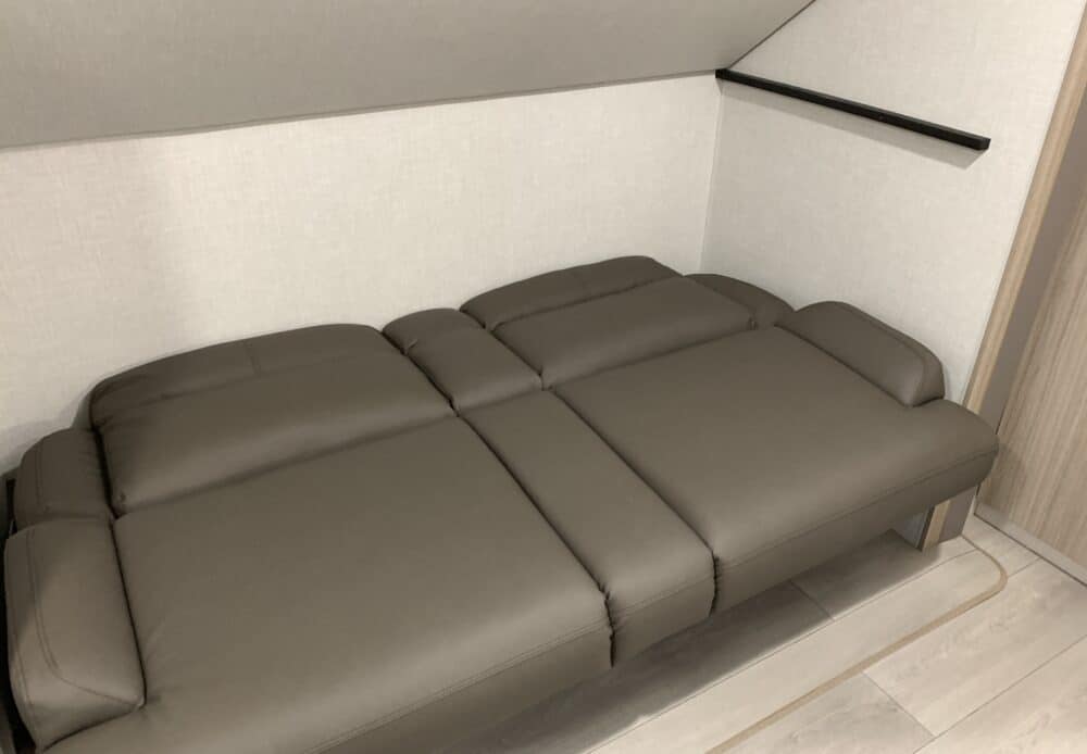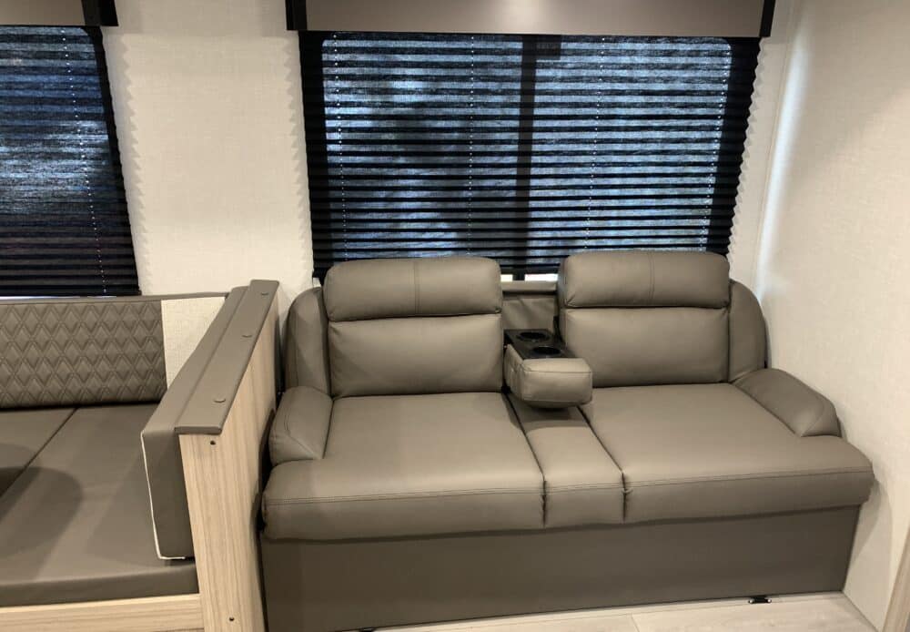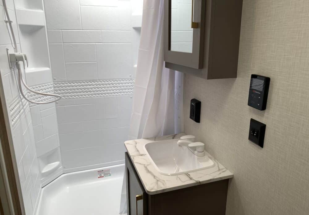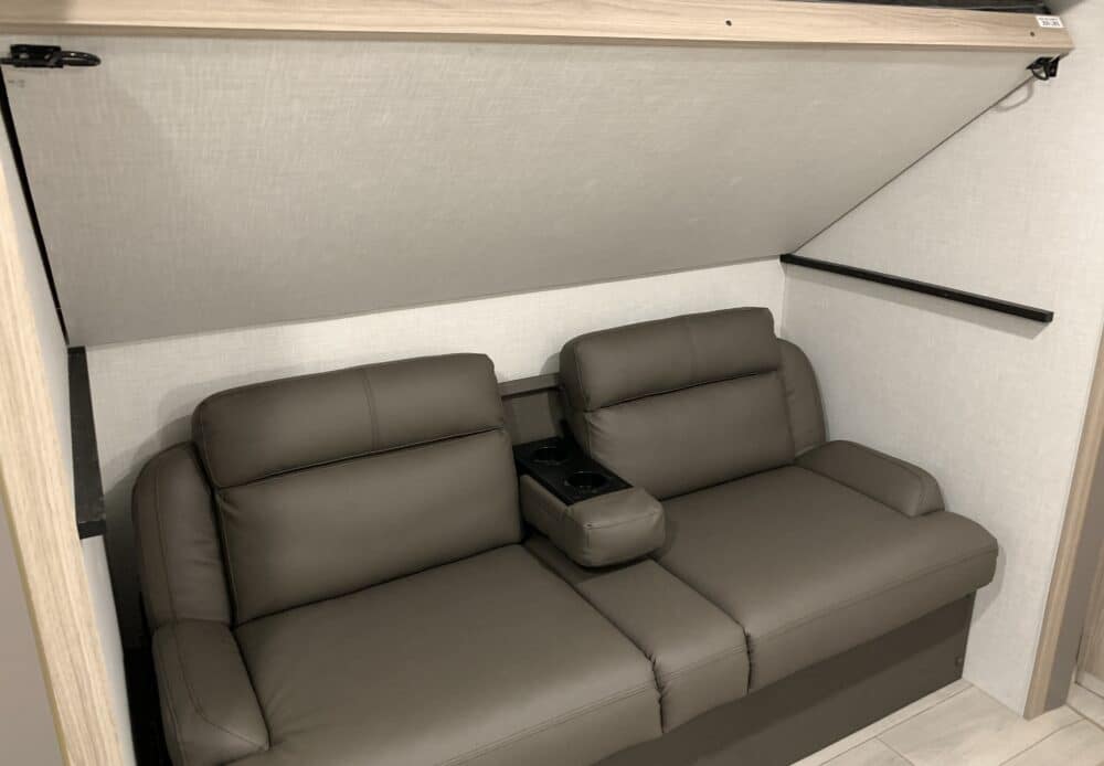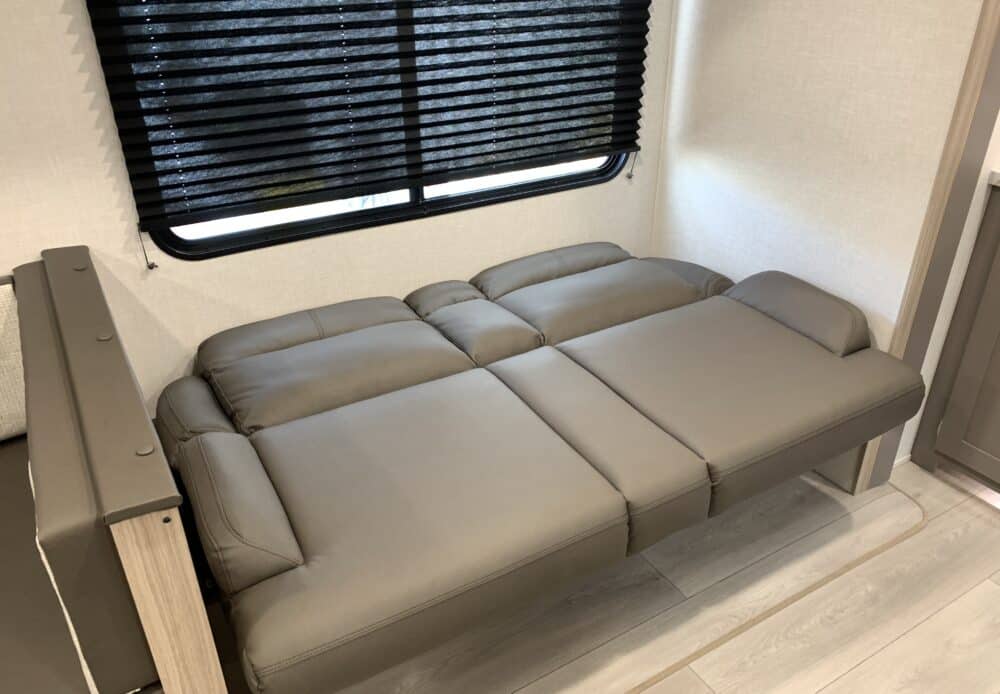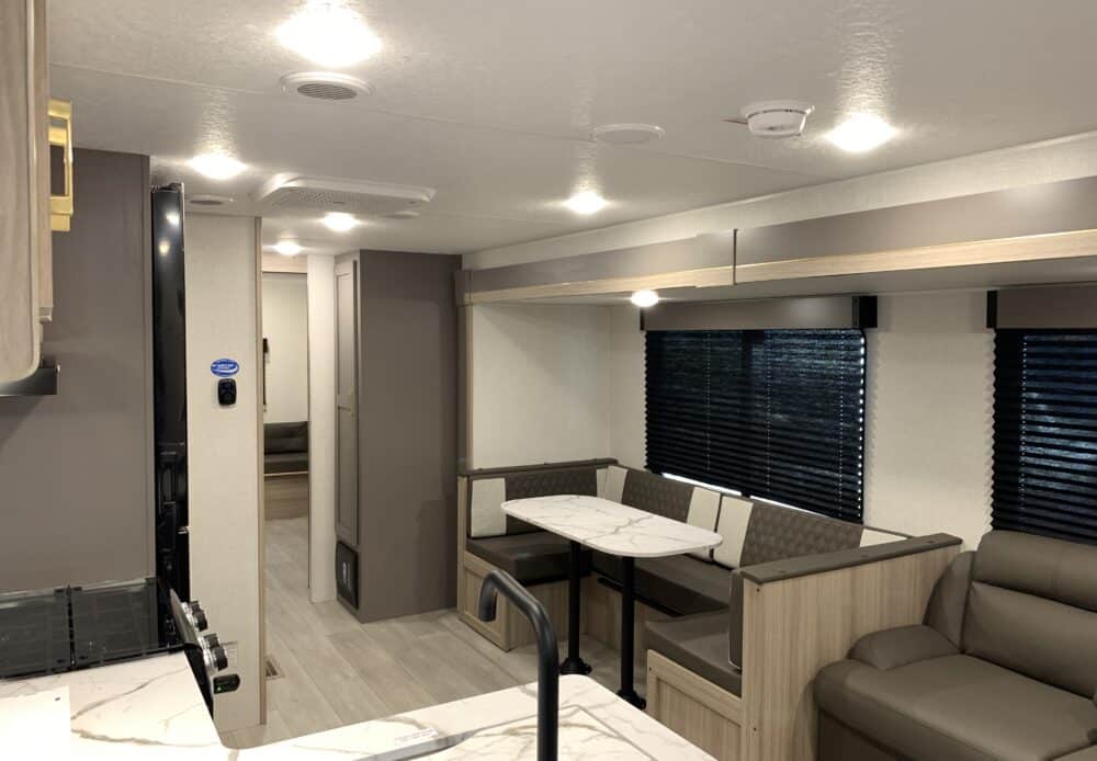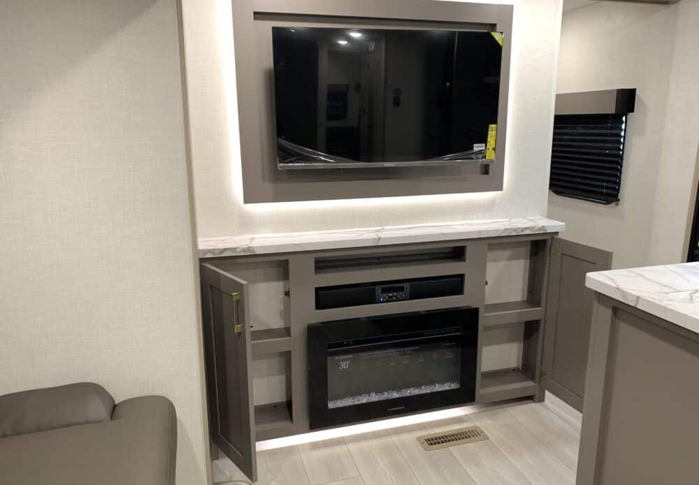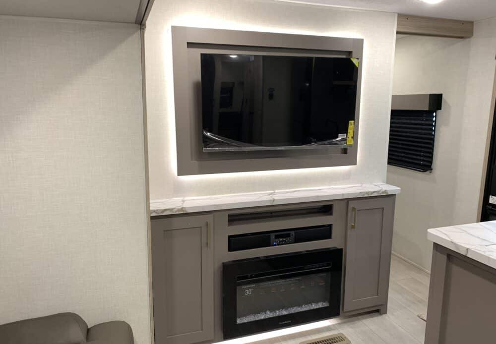 De plus la Sportsmen 332BHKSE a un air climatisé de 13500 btu et un foyer qui tempéreront l’ambiance désirée. Par ailleurs, la cuisine a un poêle avec dessus en verre, un réfrigérateur de 7p.c. et un micro-ondes. Aussi une banquette et un sofa situé dans l’extension se tra